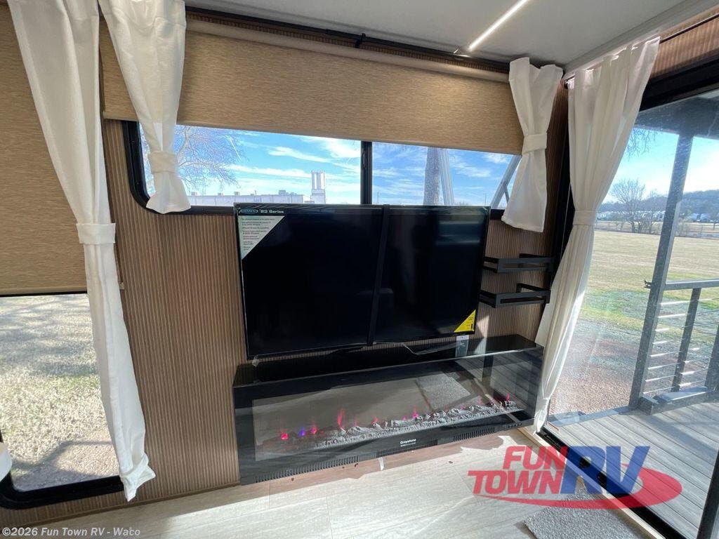 This travel trailer will feel more like home with its rear veranda/porch, dual entry doors, and front private bedroom! There is an outdoor kitchen on the back porch so you can make lunch in the fresh air, and the patio doors lead right into the main living area. Your crew can relax on the L-shaped sofa within the large slide across from the fireplace, which will make your space more cozy. There are also bunk beds with a storage cubby here, along with a pull-out pantry and a closet/pantry, and a refrigerator! A kitchen island with four chairs will provide a place to dine at, although you may just find yourselves out back or under the side awning. You will love having your own space in the private bedroom, and the Versa-Tilt custom king bed will let you sit up in bed to read your book at night.