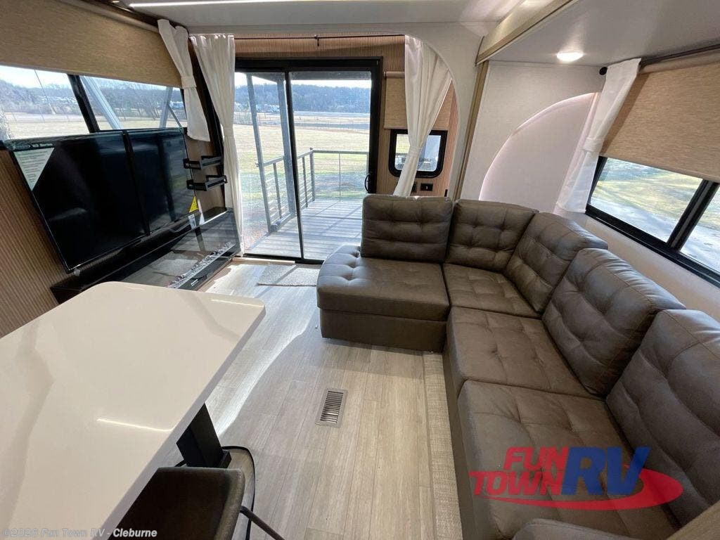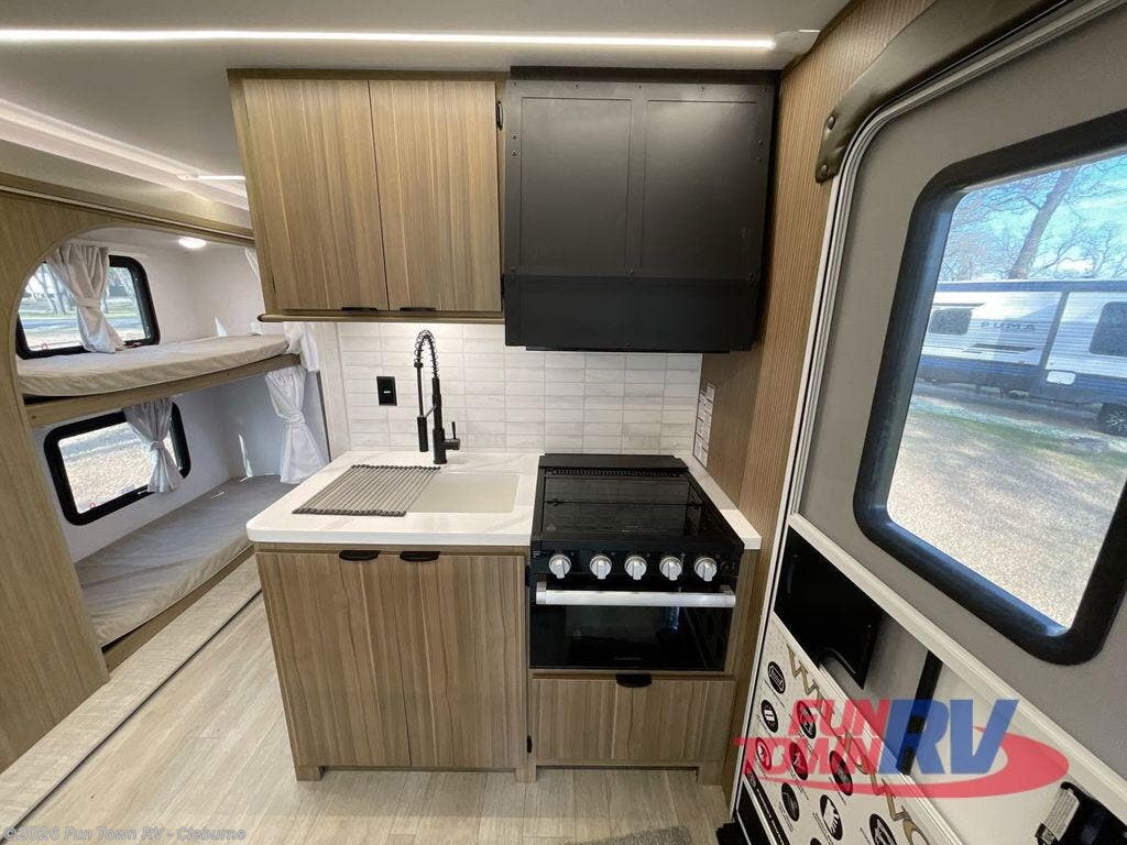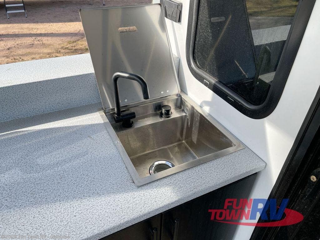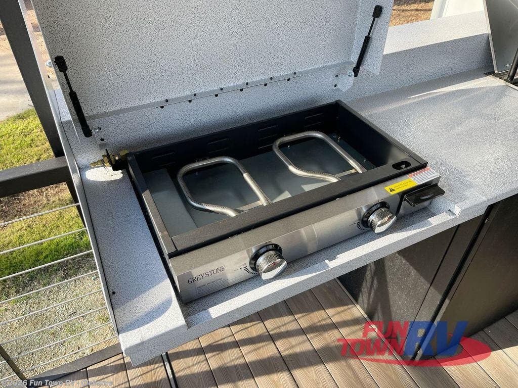This travel trailer will feel more like home with its rear veranda/porch, dual entry doors, and front private bedroom! There is an outdoor kitchen on the back porch so you can make lunch in the fresh air, and the patio doors lead right into the main living area. Your crew can relax on the L-shaped sofa within the large slide across from the fireplace, which will make your space more cozy. There are also bunk beds with a storage cubby here, along with a pull-out pantry and a closet/pantry, and a refrigerator! A kitchen island with four chairs will provide a place to dine at, although you may just find yourselves out back or under the side awning. You will love having your own space in the private bedroom, and the Versa-Tilt custom king bed will let you sit up in bed to read your book at night.