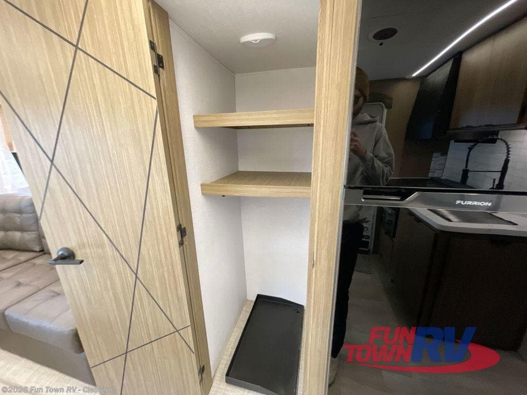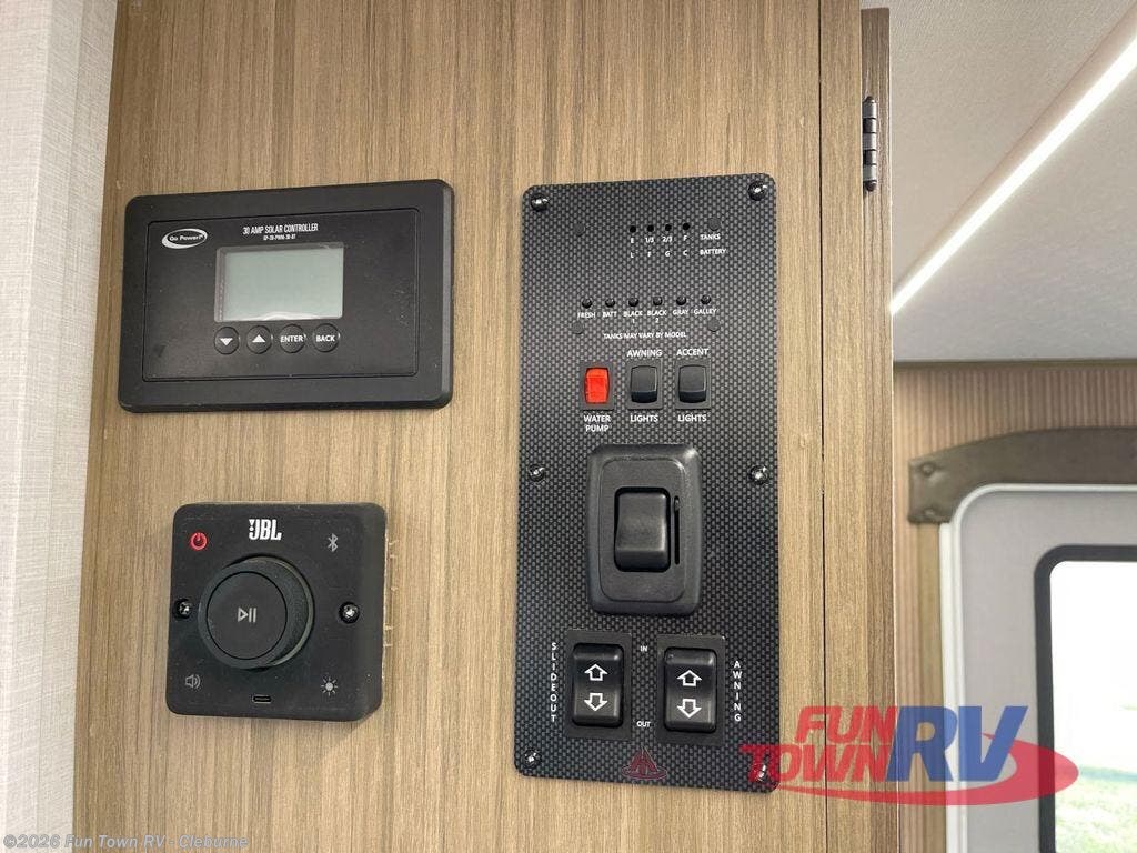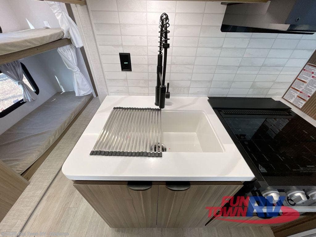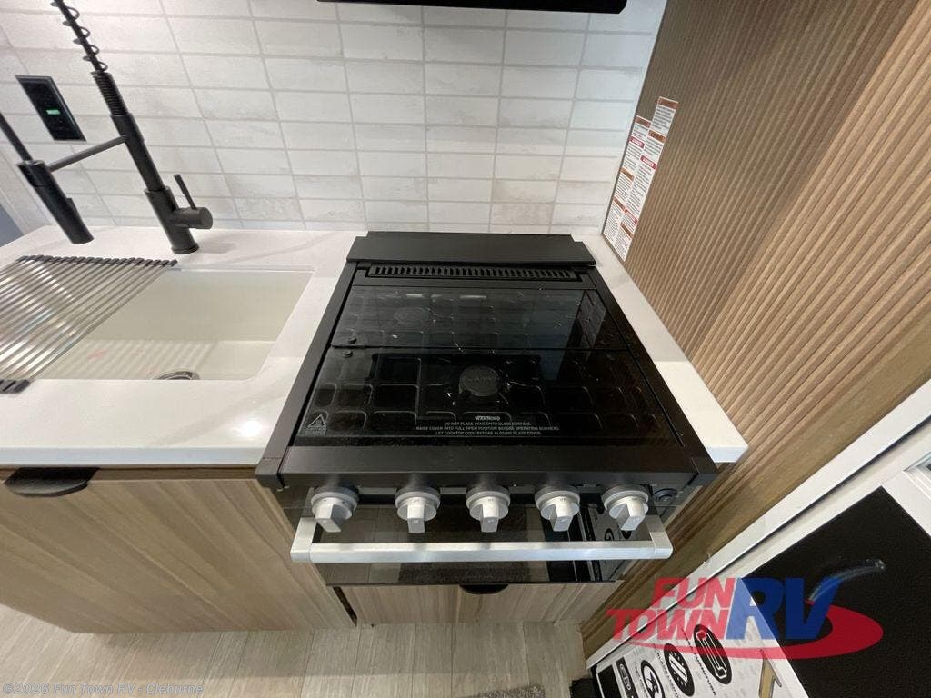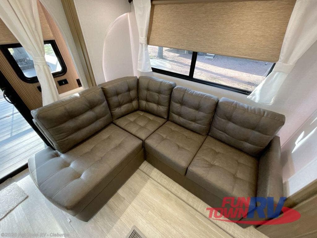 This travel trailer will feel more like home with its rear veranda/porch, dual entry doors, and front private bedroom! There is an outdoor kitchen on the back porch so you can make lunch in the fresh air, and the patio doors lead right into the main living area. Your crew can relax on the L-shaped sofa within the large slide across from the fireplace, which will make your space more cozy. There are also bunk beds with a storage cubby here, along with a pull-out pantry and a closet/pantry, and a refrigerator! A kitchen island with four chairs will provide a place to dine at, although you may just find yourselves out back or under the side awning. You will love having your own space in the private bedroom, and the Versa-Tilt custom king bed will let you sit up in bed to read your book at night.