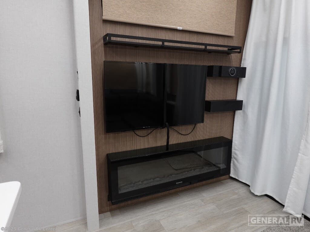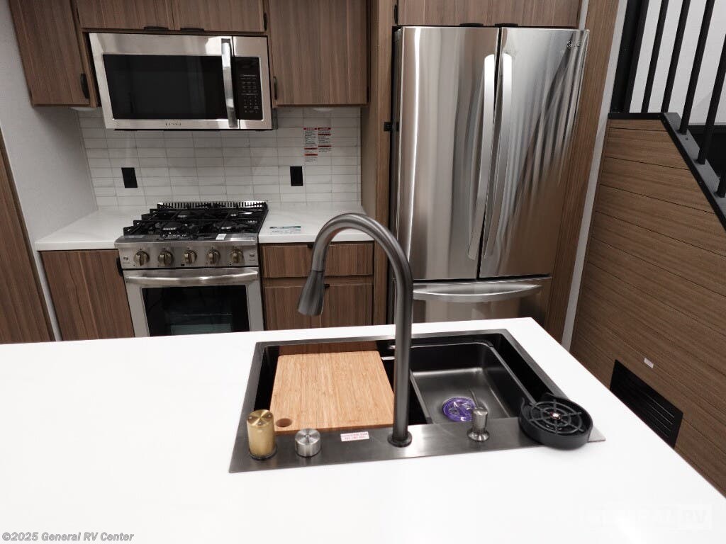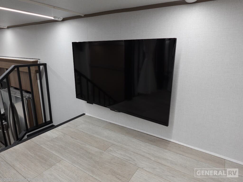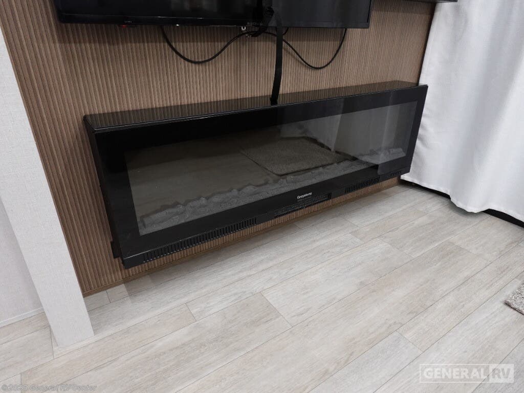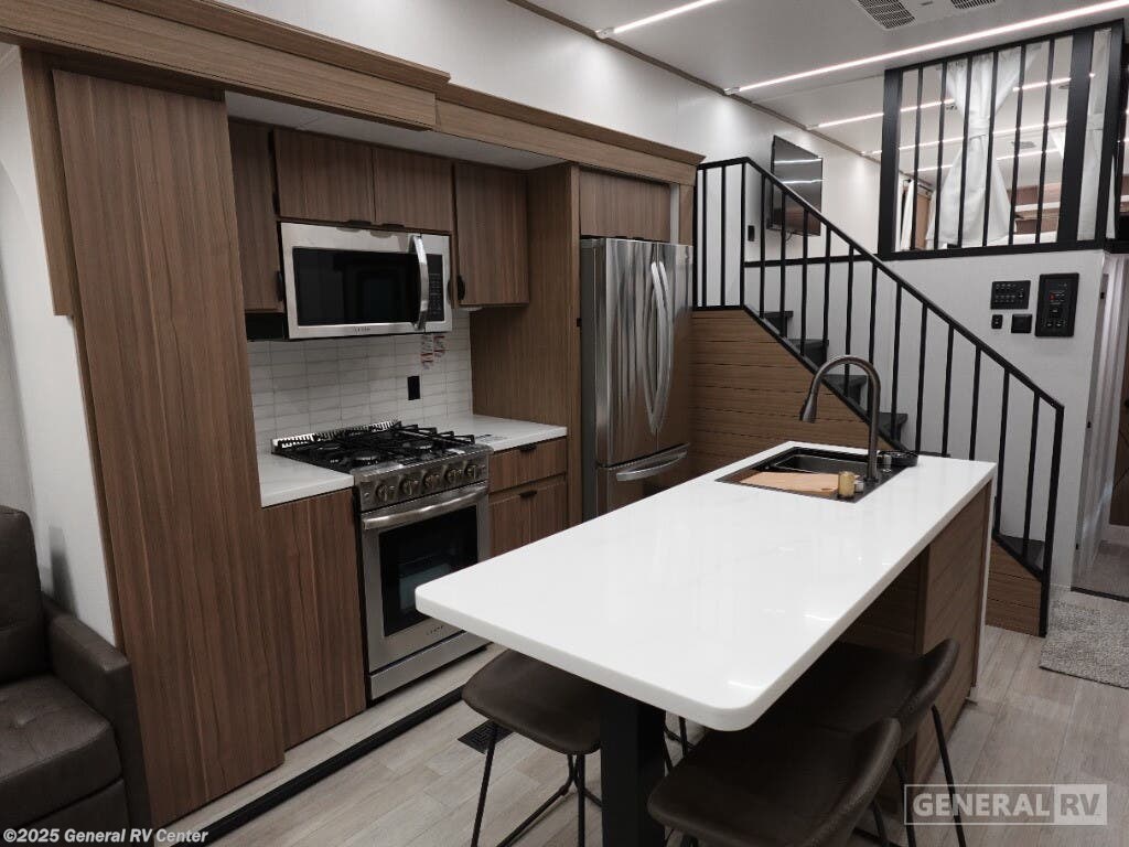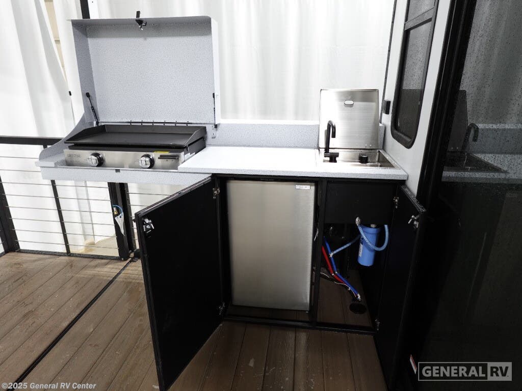 The 2025 Forest River Wildwood Grand Lodge 42VERANDA is a luxury destination trailer designed for extended stays with a true residential feel. One of its standout features is the fully integrated veranda-style sliding glass door that opens to a built-in patio deck, offering an inviting outdoor living space unlike anything else in its class. Inside, the layout includes a spacious front living area with a large L-shaped sofa, entertainment center, and electric fireplace. The center kitchen features a full-size residential refrigerator, kitchen island with bar stools, pantry, and plenty of solid-surface counter space. Toward the rear, you'll find a private king bedroom with wardrobe storage and washer/dryer prep, as well as a full bathroom with a walk-in shower and porcelain toilet. A large loft area above the bedroom and hallway provides extra sleeping space or storage, making it perfect for families or guests. With upscale finishes, expansive windows, and both indoor and outdoor entertainment features, the 42VERANDA offers a luxurious and homey retreat wherever it's parked.