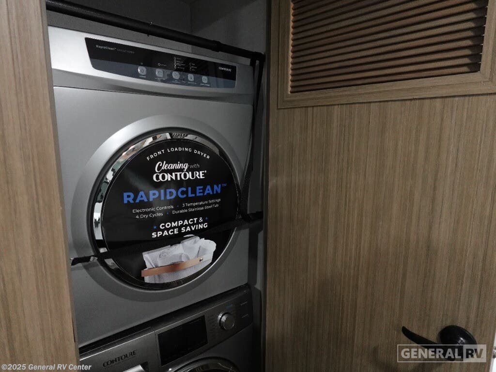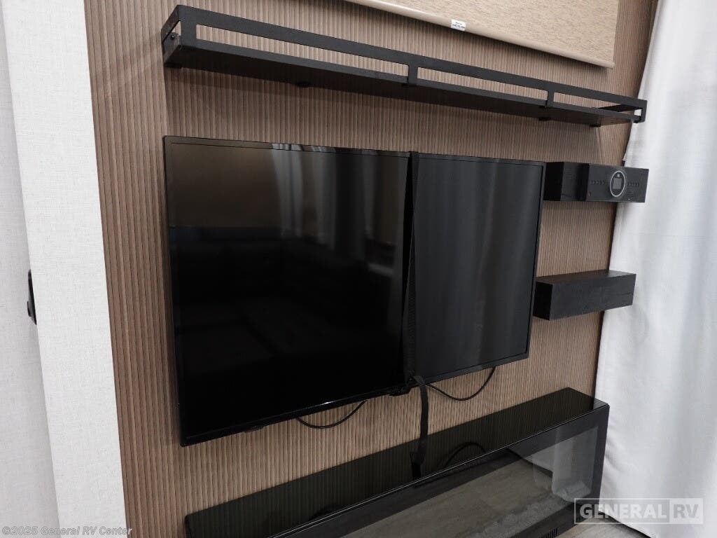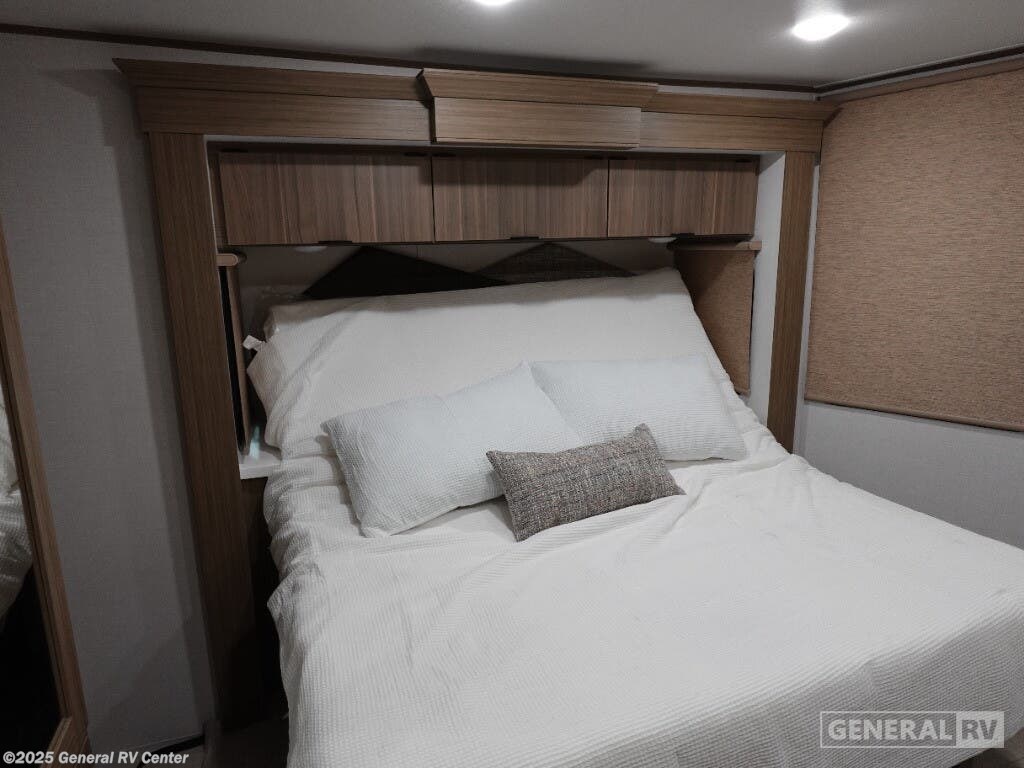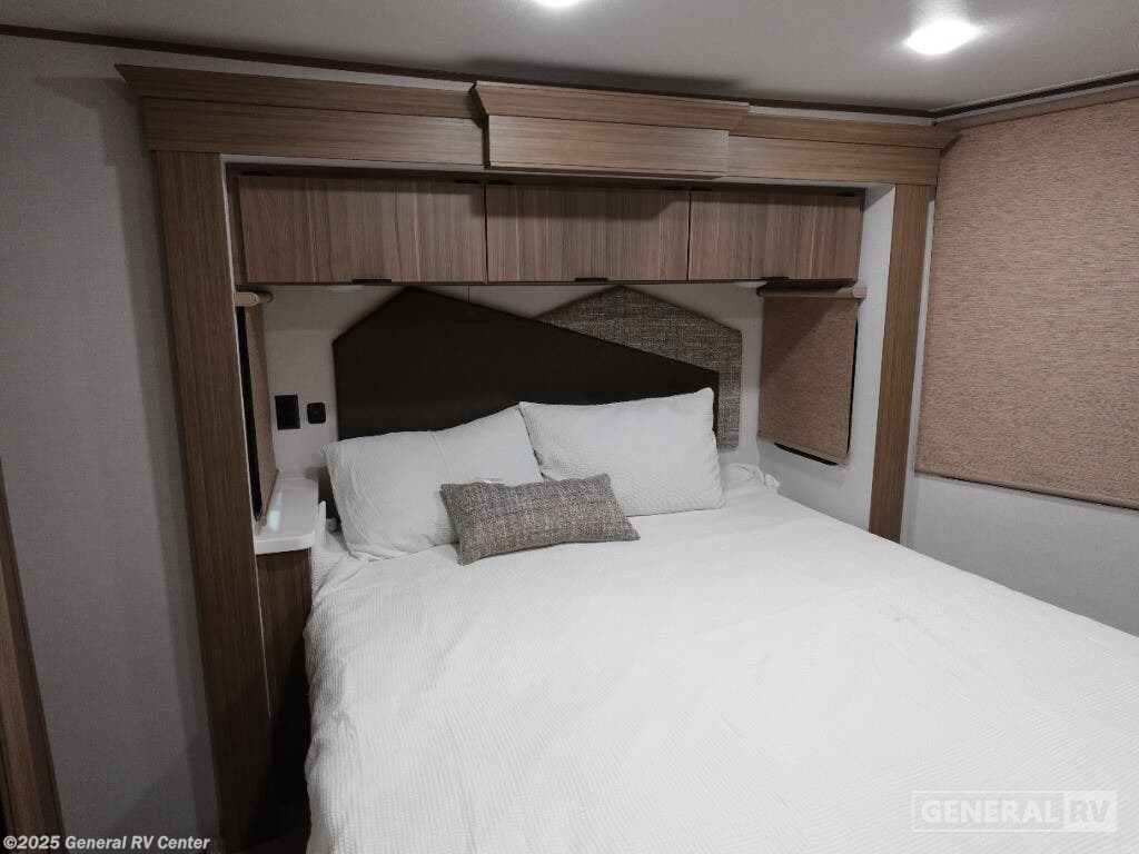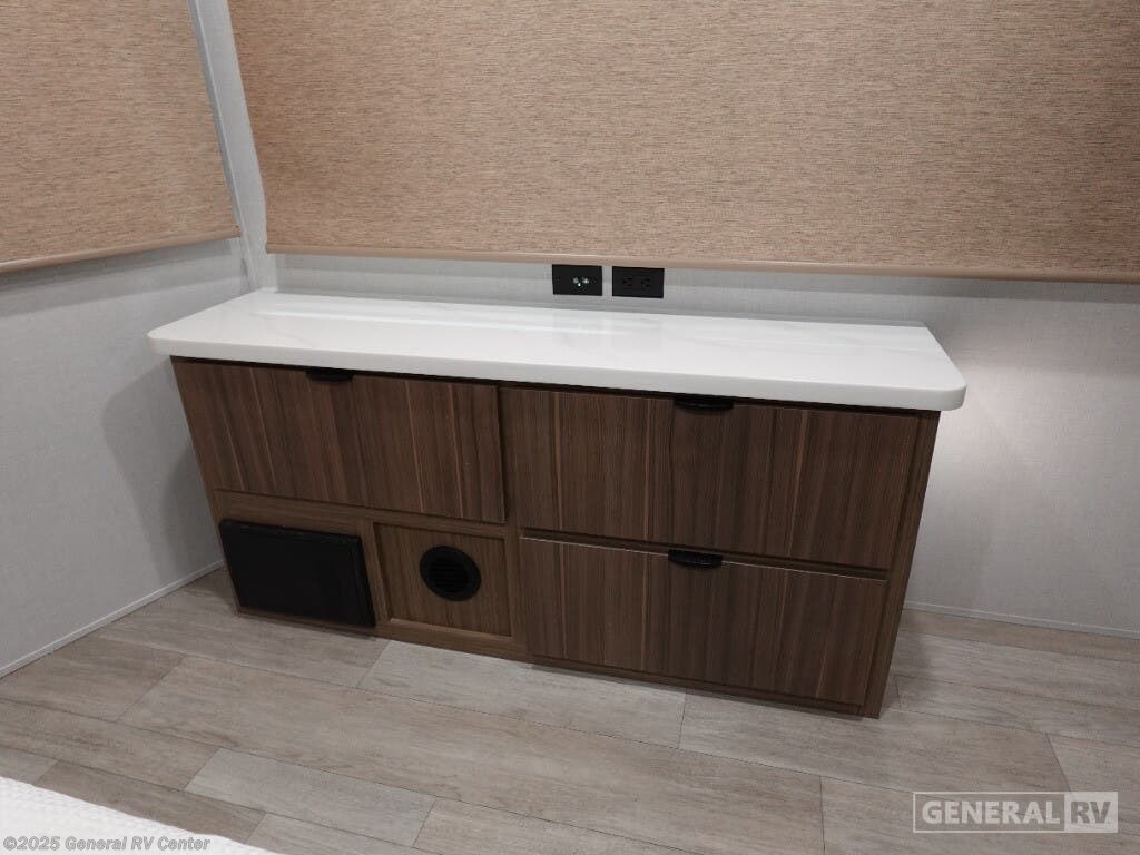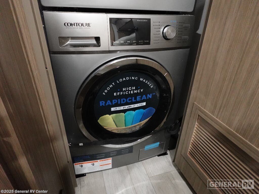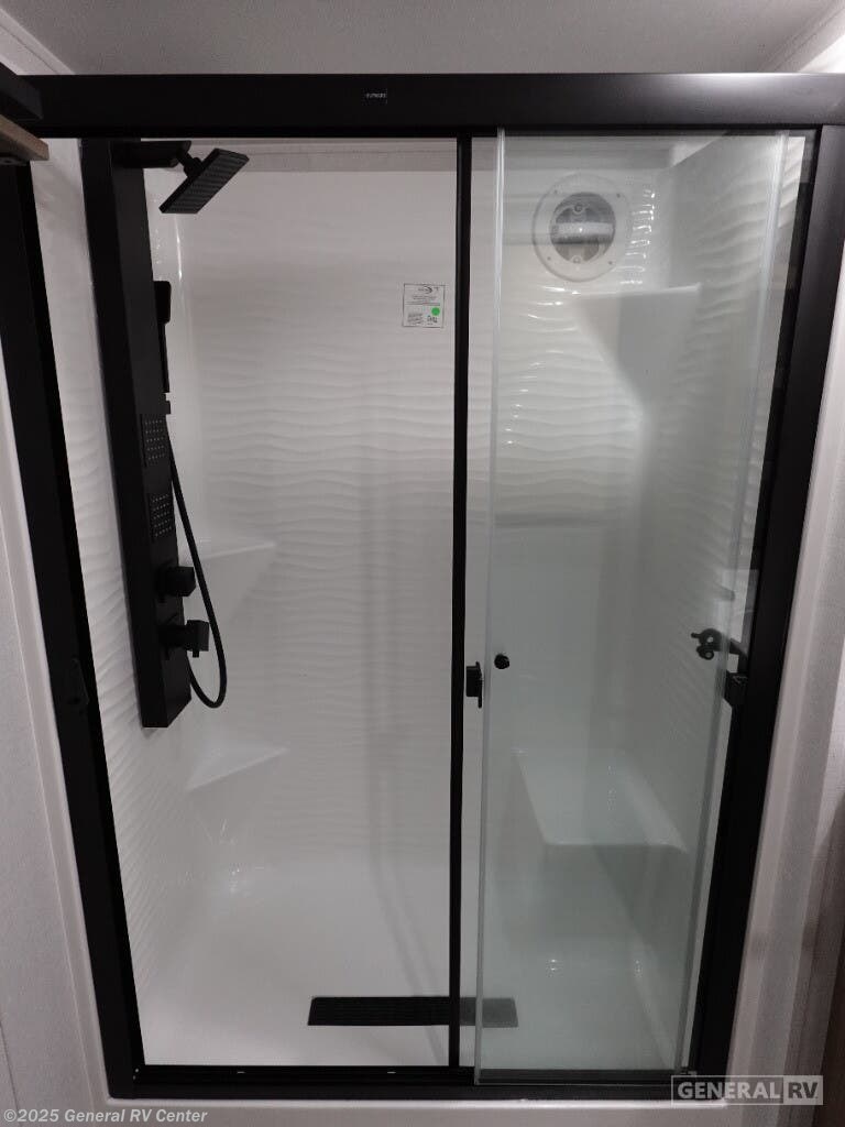 The 2025 Forest River Wildwood Grand Lodge 42VERANDA is a luxury destination trailer designed for extended stays with a true residential feel. One of its standout features is the fully integrated veranda-style sliding glass door that opens to a built-in patio deck, offering an inviting outdoor living space unlike anything else in its class. Inside, the layout includes a spacious front living area with a large L-shaped sofa, entertainment center, and electric fireplace. The center kitchen features a full-size residential refrigerator, kitchen island with bar stools, pantry, and plenty of solid-surface counter space. Toward the rear, you'll find a private king bedroom with wardrobe storage and washer/dryer prep, as well as a full bathroom with a walk-in shower and porcelain toilet. A large loft area above the bedroom and hallway provides extra sleeping space or storage, making it perfect for families or guests. With upscale finishes, expansive windows, and both indoor and outdoor entertainment features, the 42VERANDA offers a luxurious and homey retreat wherever it's parked.
