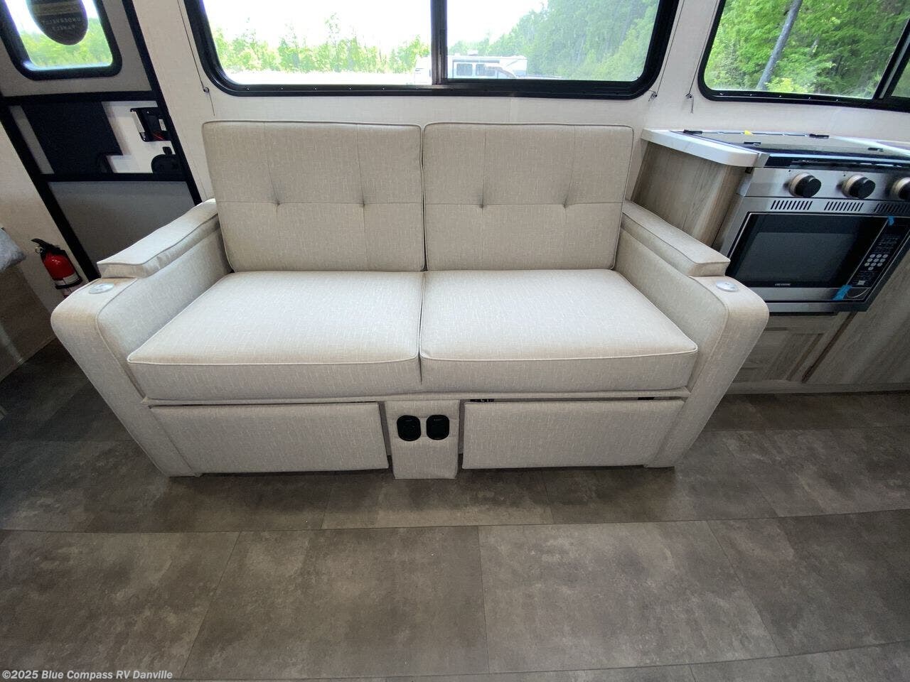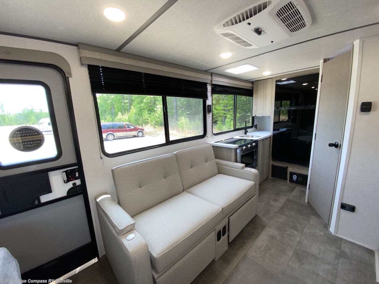 Perfect for your family, this single slide with split bunk and queen bed provides your family comfortable sleeping for four, and the slide adds a bit more interior space in camp. The split bunk is located behind the spice rack door and TV for your entertainment and cooking needs. Speaking of cooking, you can prepare your best home cooked meals with the cooktop, and store any leftovers in the 12V refrigerator. Relax each night in the theater seating and freshen up in the rear corner bathroom each morning which features a skylight over the shower for more natural lighting.