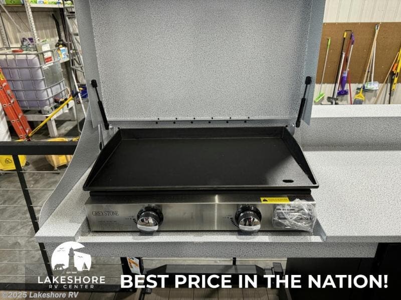 With any Wildwood Grand Lodge destination trailer by Forest River, you can enjoy extended stays wherever you go! There is 4K awning blade lighting outside, along with slide out awning toppers, plus a heated and enclosed Accessibelly for added protection. Inside, you'll love the stylish backsplash update, elegant curtain rods and curtains, TFL black walnut entertainment shelves, and stainless steel kitchen appliances. A Serta mattress in the bedroom(s) will provide comfort to each journey, and there is a tankless water heater for hot water when you need it.
