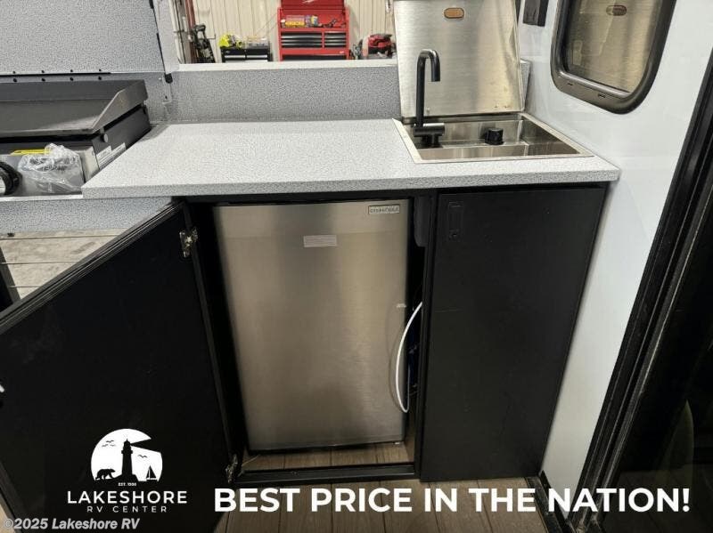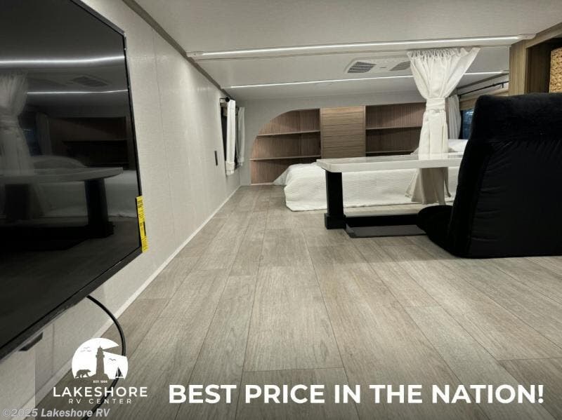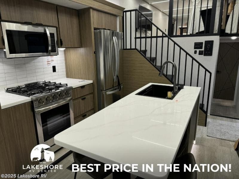 One look at this destination trailer and you'll be sold! The rear porch/veranda includes an outdoor kitchen with a cooktop and sink plus a ceiling fan so you can sit out back and visit with friends. The L-shaped sofa with an ottoman inside will provide cozy seating space, especially with the fireplace right across the room. Your crew can dine at the kitchen island with four chairs, and there is a large pantry where snacks can be kept for game night. When it's time to call it a night, the front private bedroom with a Versa-Tilt custom king bed is sure to bring comfort, and there is a dresser and wardrobe for your things. A third wardrobe includes washer and dryer prep if you choose to add those appliances. Any guests that aren't sleeping on the sofa can sleep in the loft with a queen bed, large front cabinet with shelves, and an additional cabinet for storage. You will also find a table with space below for your feet, so the kids can color, eat, and play games!