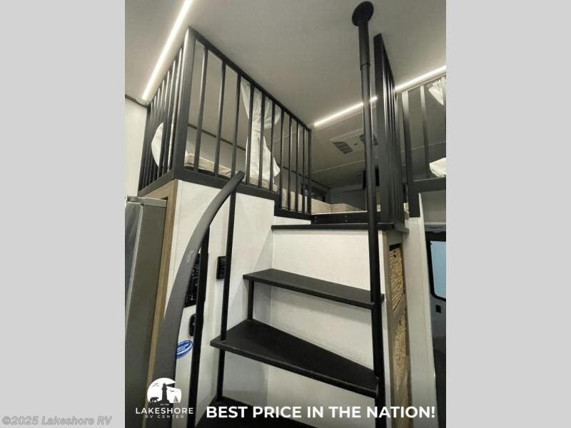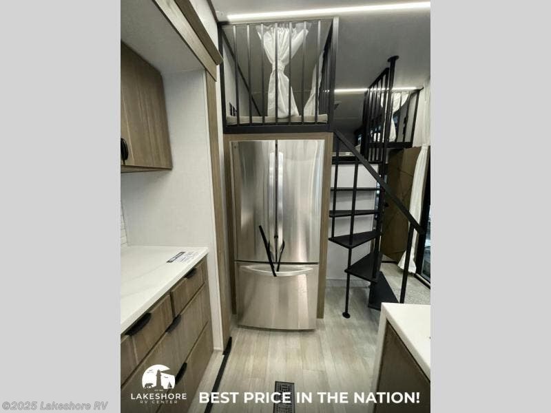 You will feel right at home in this destination trailer! It not only has one loft in the rear with two 42" x 74" bunk mats, but also a second loft in the front with spiral steps leading up to two bunk mats. The front private bedroom has a king bed slide with Versa-Tilt to lay your head on at night with front windows to let in lots of natural lighting and sunshine in the morning. Relax in true comfort at night on the L-shaped sectional sofa across from the entertainment center with a fireplace. The kitchen island provides extra space to prepare delicious meals and comes with four bar stools to enjoy your breakfast each morning. Everyone will stay fresh and clean with a walk-in shower in the rear private bedroom, plus there washer and dryer prep if you choose to add those appliances. Head outside through either the patio door or the second entry/exit door each day!