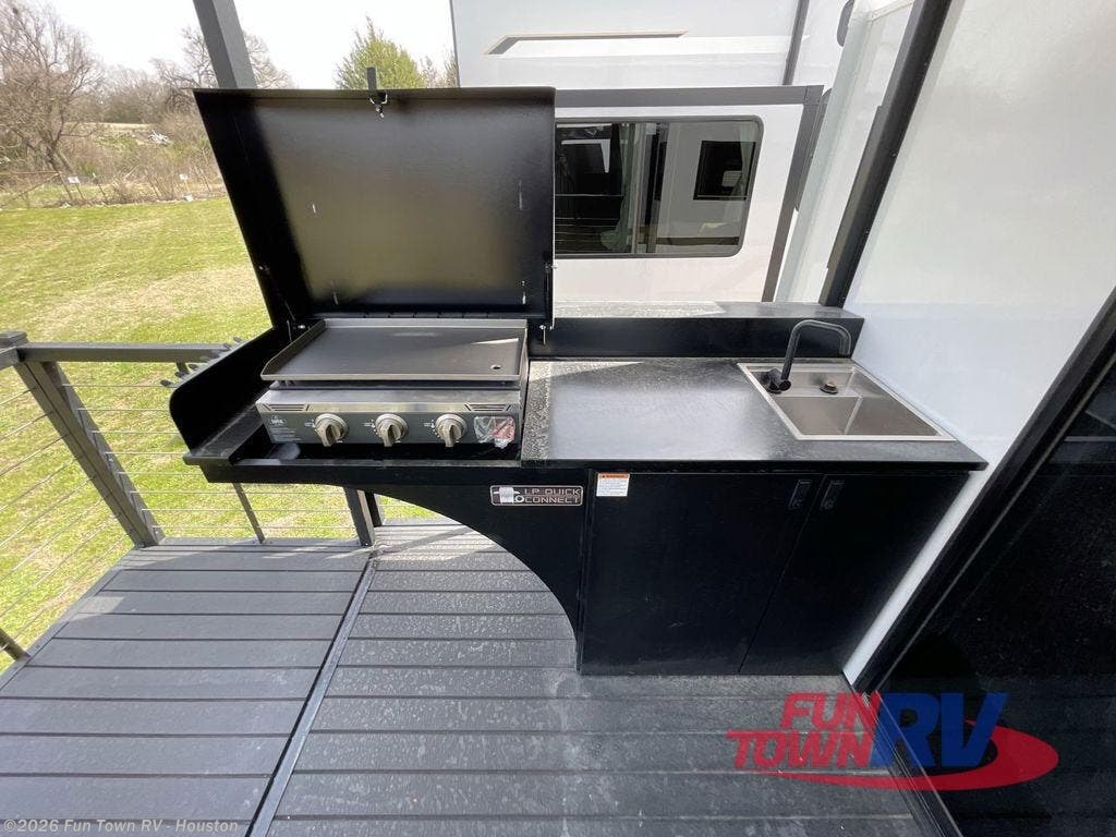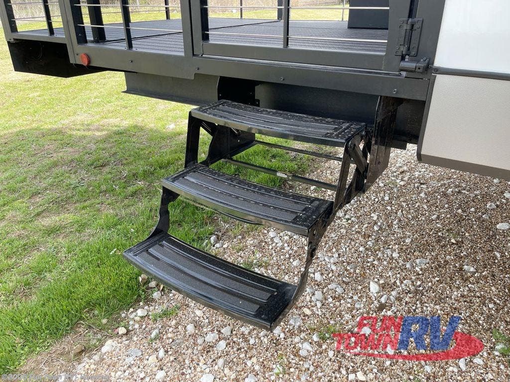 Camping trips and extended stays just got sweeter in this spacious fifth wheel! The rear veranda/porch with a kitchen lets you grill up some burgers as you visit in your camp chairs with friends. Once you head inside, you can make it a movie night since there is a sectional sofa with an ottoman across from the 65" TV and fireplace. A kitchen island with four chairs provides a place to dine together, and there is plenty of food storage between the pantry and 16 cu. ft. 12V refrigerator. You'll love having a custom king bed slide in the front bedroom, along with a dresser and a bench, a wardrobe, plus washer and dryer prep!