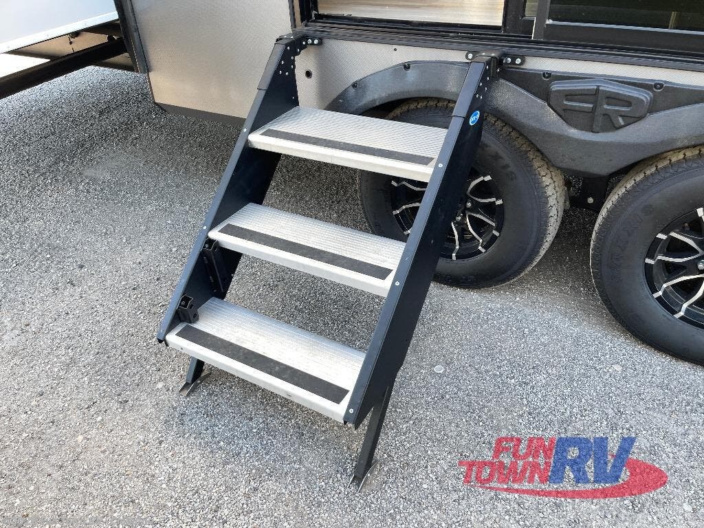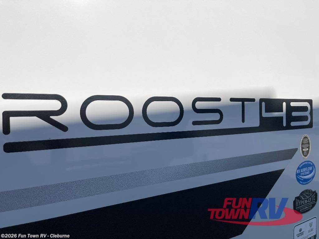 Introducing a new RV of its kind, the ROOST43 is a destination-style fifth wheel you are sure to love! There are two levels, making it feel more like home, and you can sleep six to eight each night. The master bedroom includes a custom king bed slide out, a 32" TV and fireplace, a desk/vanity, plus a half bath for convenience. A custom king-size bed is also found in the front loft, and there are storage cubbies plus a coax/110V outlet here to plug in chargers or a laptop. The second loft in the back includes spiral stairs, two bunk mats, a wardrobe, and cubby cubes here also for your guests' things. Some of the stand-out features you'll find on the first level are the sectional sofa with a coffee table, an entertainment center with a 65" TV, a kitchen island with five chairs, and a fully-equipped kitchen. The 20 cu. ft. 12V refrigerator and pull-out pantry will let you stock up on food, and the kitchen hutch will be perfect for nice dishes. The full bath on this model is one to remember; there is a one-piece fiberglass shower with a teak seat, a flip-up shelf and a washer/dryer, a backlit mirror, and more. And we haven't even touched on the exterior features, such as the pull-out tray, outdoor refrigerators, 20' awning, and more!