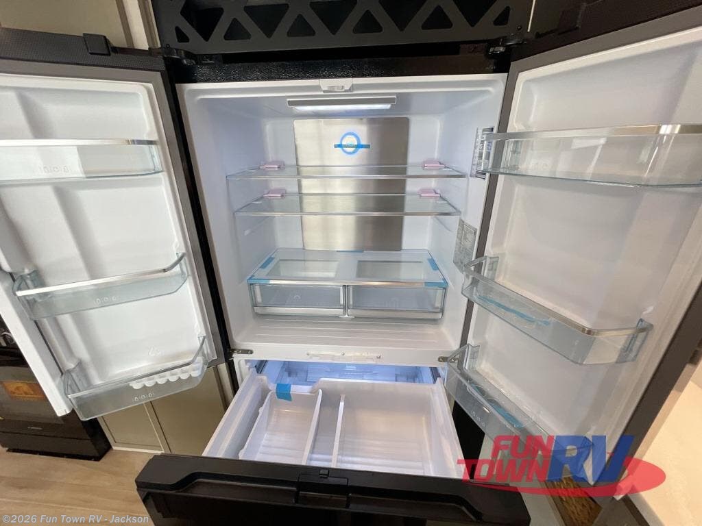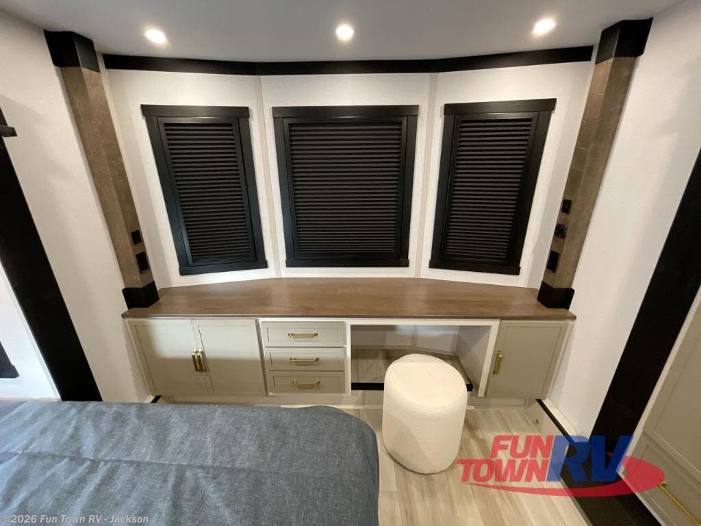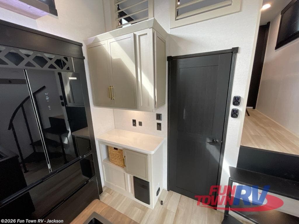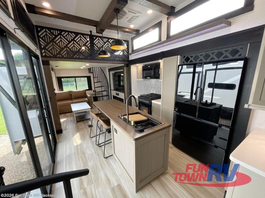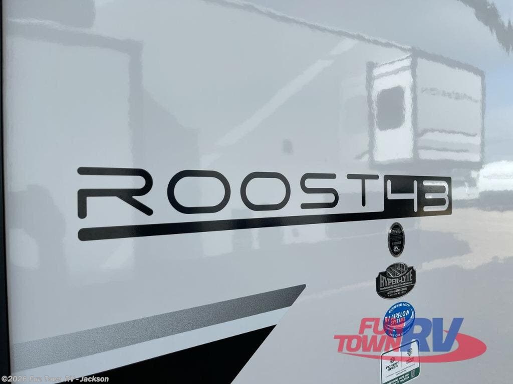 Introducing a new RV of its kind, the ROOST43 is a destination-style fifth wheel you are sure to love! There are two levels, making it feel more like home, and you can sleep six to eight each night. The master bedroom includes a custom king bed slide out, a 32" TV and fireplace, a desk/vanity, plus a half bath for convenience. A custom king-size bed is also found in the front loft, and there are storage cubbies plus a coax/110V outlet here to plug in chargers or a laptop. The second loft in the back includes spiral stairs, two bunk mats, a wardrobe, and cubby cubes here also for your guests' things. Some of the stand-out features you'll find on the first level are the sectional sofa with a coffee table, an entertainment center with a 65" TV, a kitchen island with five chairs, and a fully-equipped kitchen. The 20 cu. ft. 12V refrigerator and pull-out pantry will let you stock up on food, and the kitchen hutch will be perfect for nice dishes. The full bath on this model is one to remember; there is a one-piece fiberglass shower with a teak seat, a flip-up shelf and a washer/dryer, a backlit mirror, and more. And we haven't even touched on the exterior features, such as the pull-out tray, outdoor refrigerators, 20' awning, and more!