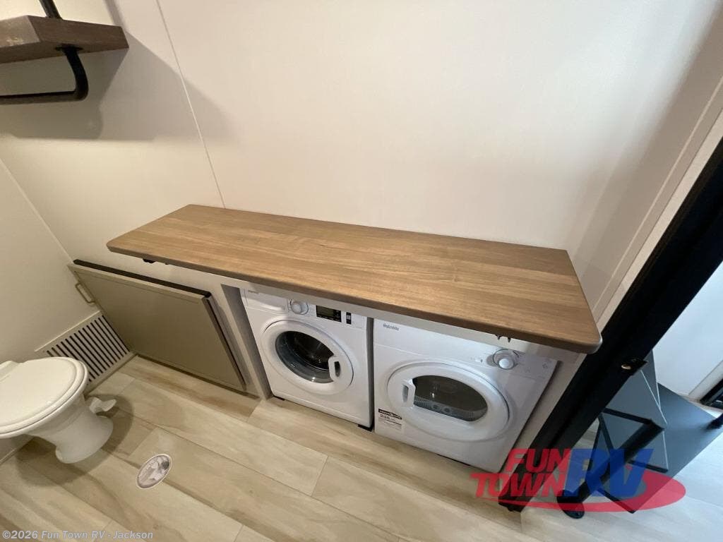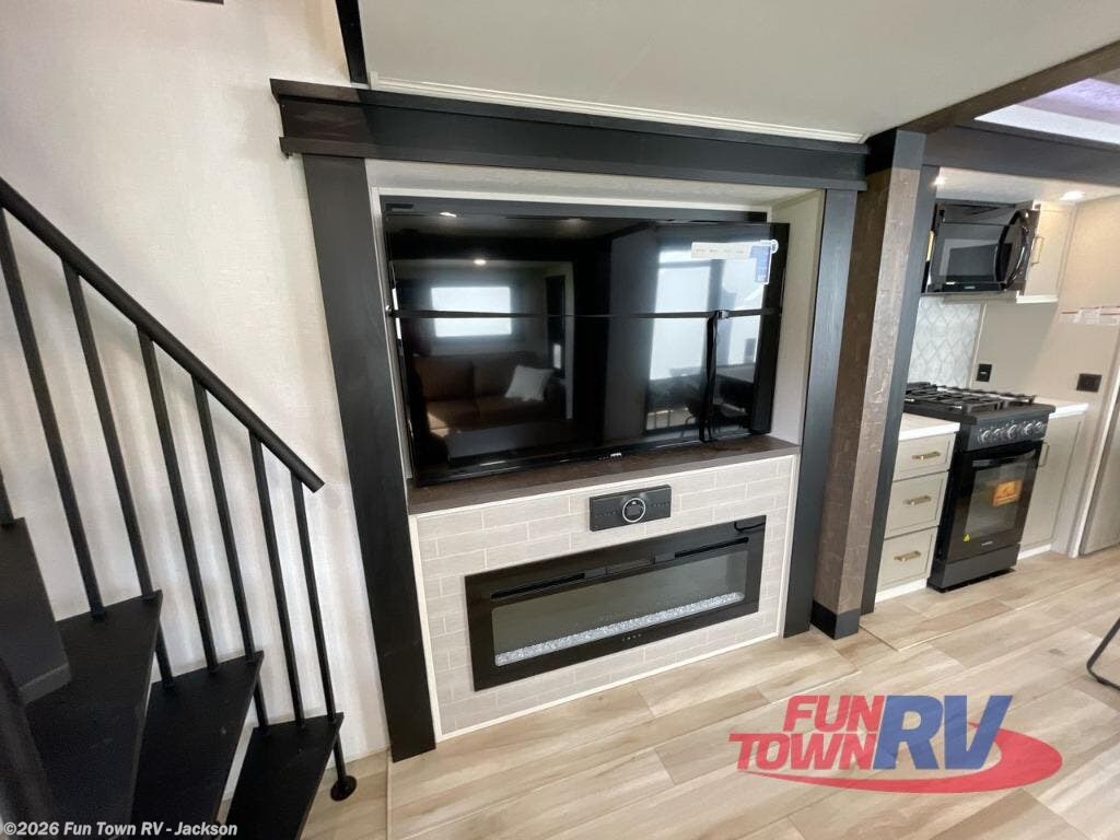 The Wildwood Heritage Glen ROOST fifth wheels resemble a destination trailer that will be giving you residential vibes! The premium Alley Grey high-gloss gel coat fiberglass sidewalls are ultra sleek, and the flat pitched roof sheds water to the off-door side for added comfort. A Race Track A/C duct system provides maximum cooling, and the AccessiBelly underbelly with 12V tank heaters on all holding tanks will help extend your camping season. There are high-end solid surface and maple-stained wood countertops inside, along with residential-inspired wood door casings, and 6' 8" clearance in all rooms, excluding lofts. Additional features include a Gun Metal grey kitchen sink, backlit mirrors in the bathrooms, motion sensor lights by the spiral stair cases, and back up camera prep if you want the option to make parking easier than ever.
