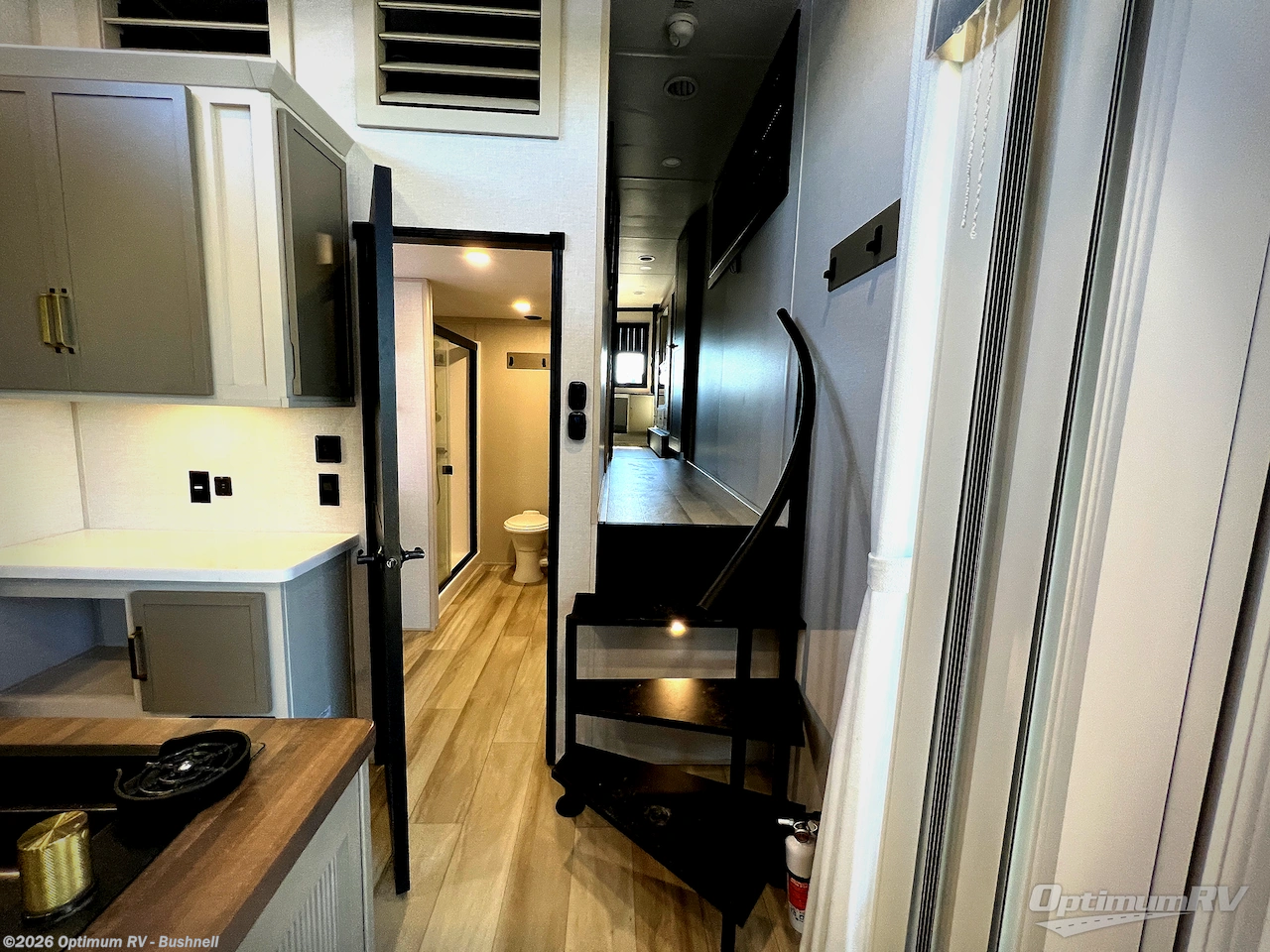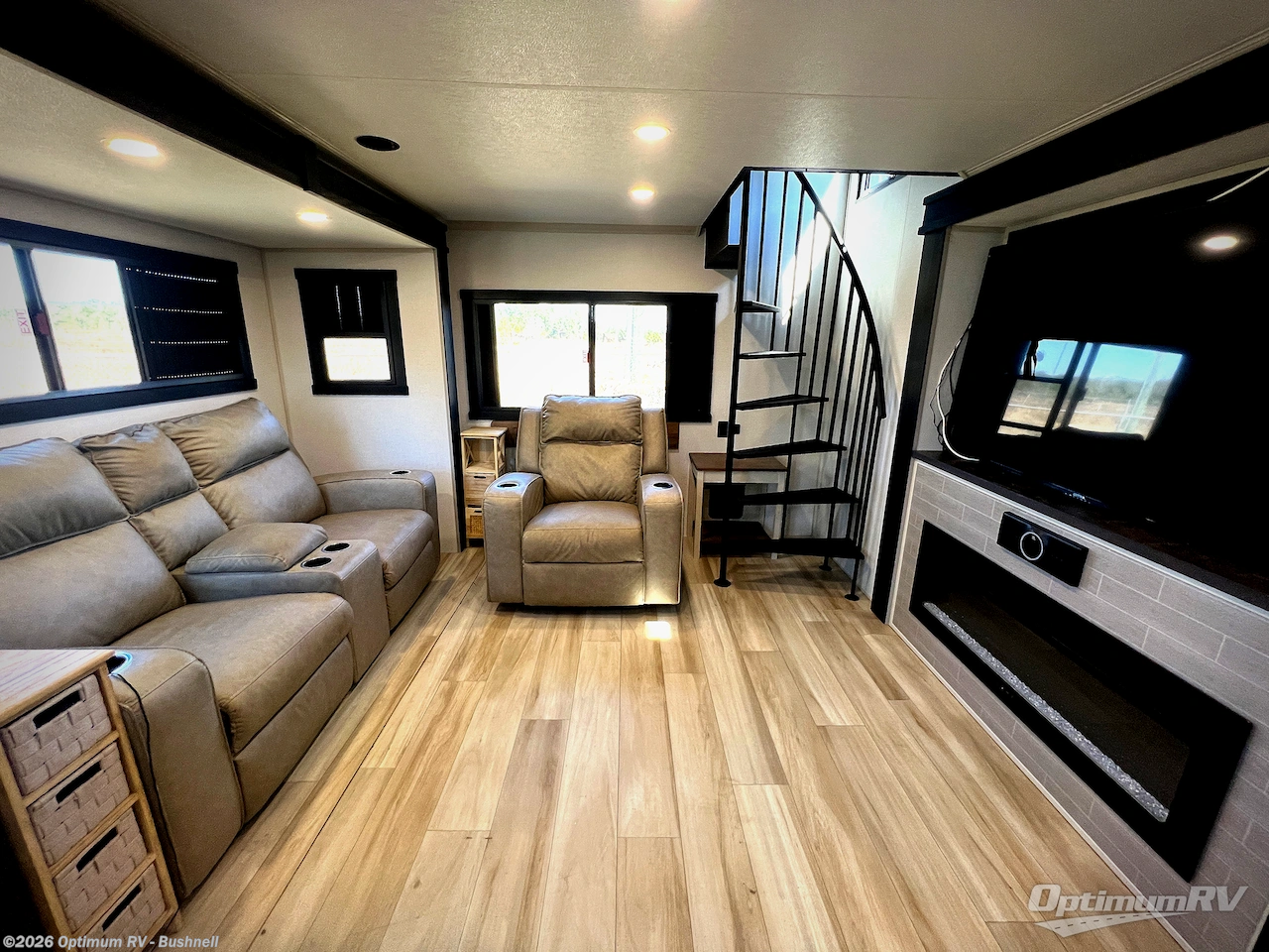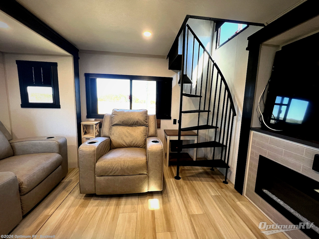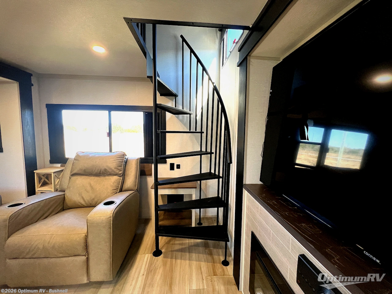 Introducing a new RV of its kind, the ROOST43 is a destination-style fifth wheel you are sure to love! There are two levels, making it feel more like home, and you can sleep six to eight each night. The master bedroom includes a custom king bed slide out, a 32" TV and fireplace, a desk/vanity, plus a half bath for convenience. A custom king-size bed is also found in the front loft, and there are storage cubbies plus a coax/110V outlet here to plug in chargers or a laptop. The second loft in the back includes spiral stairs, two bunk mats, a wardrobe, and cubby cubes here also for your guests' things. Some of the stand-out features you'll find on the first level are the sectional sofa with a coffee table, an entertainment center with a 65" TV, a kitchen island with five chairs, and a fully-equipped kitchen. The 20 cu. ft. 12V refrigerator and pull-out pantry will let you stock up on food, and the kitchen hutch will be perfect for nice dishes. The full bath on this model is one to remember; there is a one-piece fiberglass shower with a teak seat, a flip-up shelf and a washer/dryer, a backlit mirror, and more. And we haven't even touched on the exterior features, such as the pull-out tray, outdoor refrigerators, 20' awning, and more!