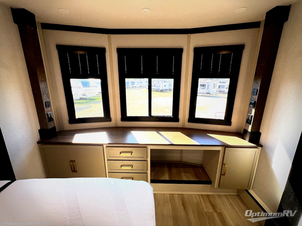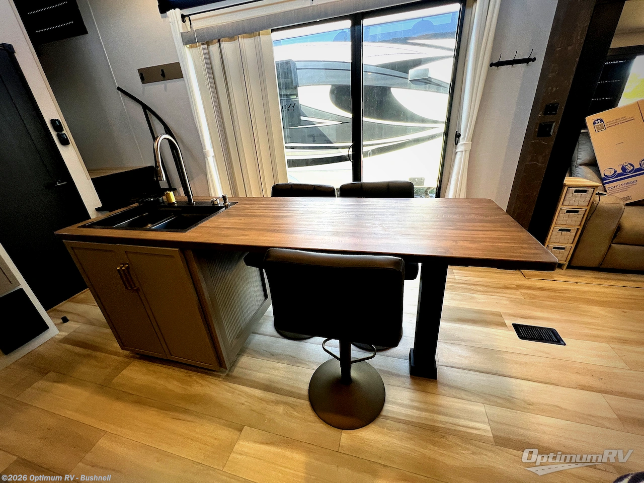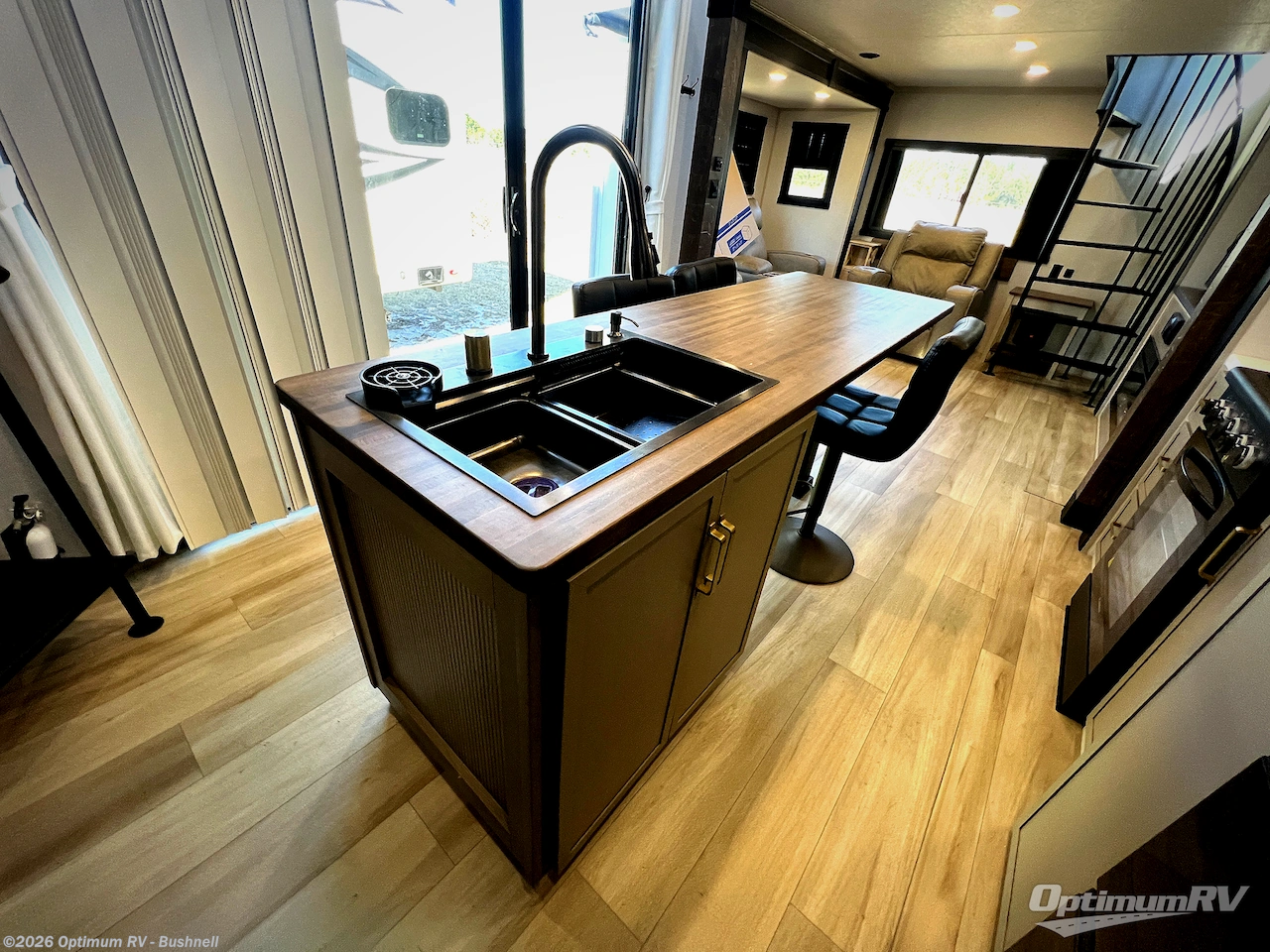 Introducing a new RV of its kind, the ROOST43 is a destination-style fifth wheel you are sure to love! There are two levels, making it feel more like home, and you can sleep six to eight each night. The master bedroom includes a custom king bed slide out, a 32" TV and fireplace, a desk/vanity, plus a half bath for convenience. A custom king-size bed is also found in the front loft, and there are storage cubbies plus a coax/110V outlet here to plug in chargers or a laptop. The second loft in the back includes spiral stairs, two bunk mats, a wardrobe, and cubby cubes here also for your guests' things. Some of the stand-out features you'll find on the first level are the sectional sofa with a coffee table, an entertainment center with a 65" TV, a kitchen island with five chairs, and a fully-equipped kitchen. The 20 cu. ft. 12V refrigerator and pull-out pantry will let you stock up on food, and the kitchen hutch will be perfect for nice dishes. The full bath on this model is one to remember; there is a one-piece fiberglass shower with a teak seat, a flip-up shelf and a washer/dryer, a backlit mirror, and more. And we haven't even touched on the exterior features, such as the pull-out tray, outdoor refrigerators, 20' awning, and more!