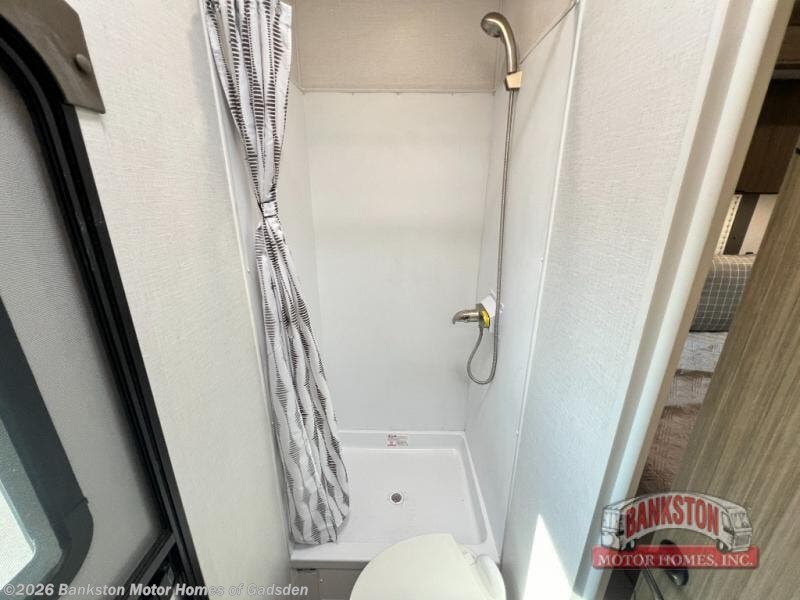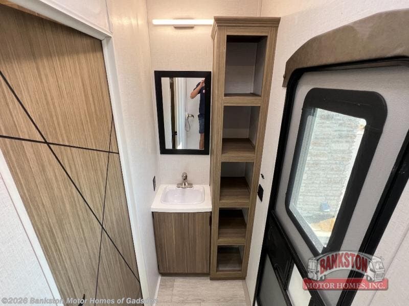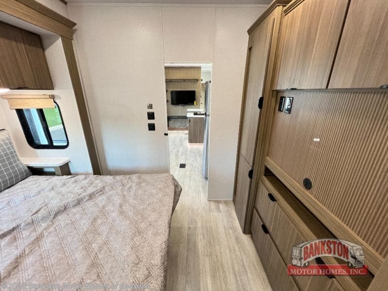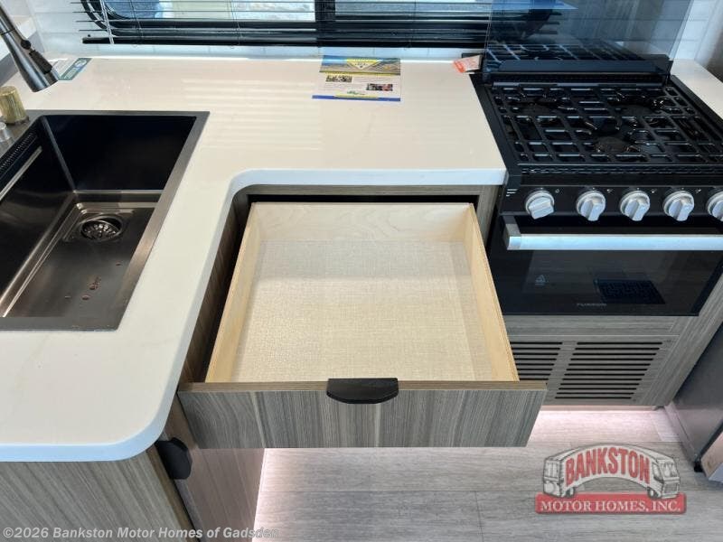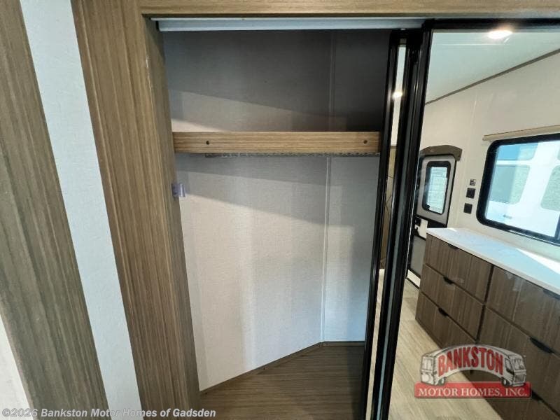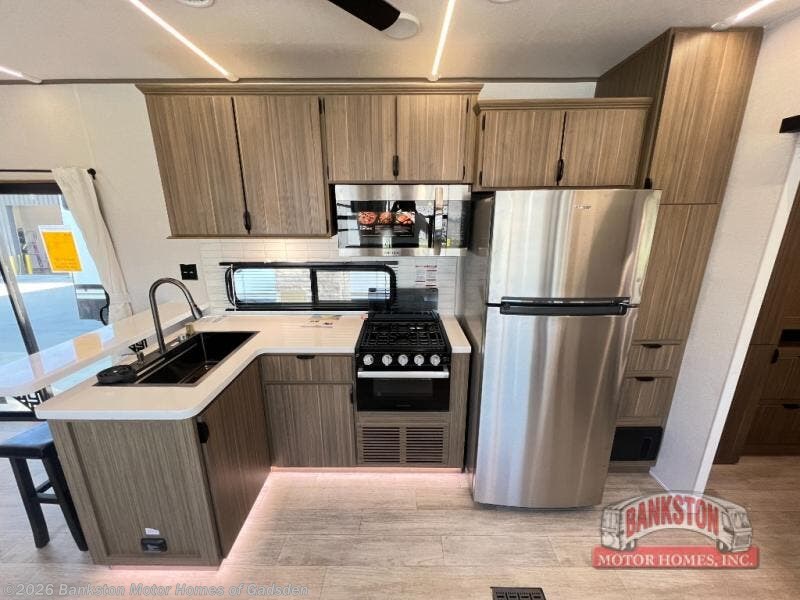 It will be so easy to enjoy extended camping trips in this spacious destination trailer. There are two bedrooms; one up front with a custom king bed with Versa Tilt, a large wardrobe, and its own exterior entry door, plus one towards the back with a second custom king bed with Versa Tilt and dual wardrobes. There is even a rear master bath here with its own exterior entry door; that makes three entry doors for convenience! Everyone can meet in the combined kitchen and living room that includes a large slide out with a sofa and booth dinette, plus a ceiling fan to keep fresh air moving. And the entertainment center with an optional 40" TV gives you the option to enjoy movie nights!