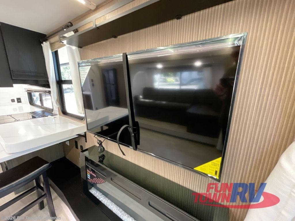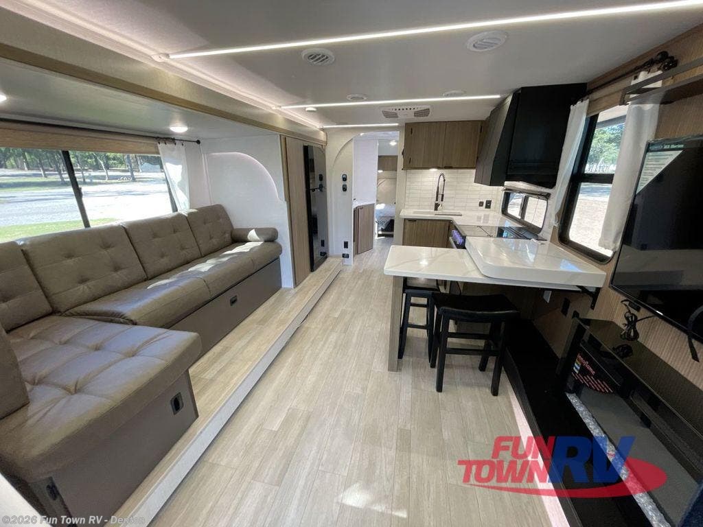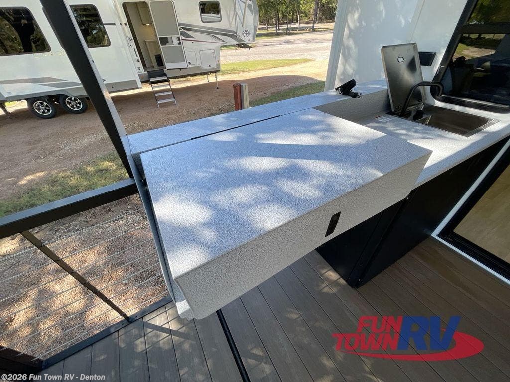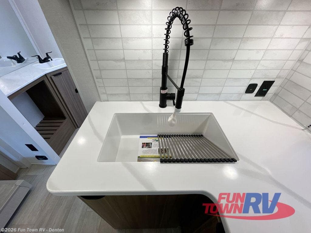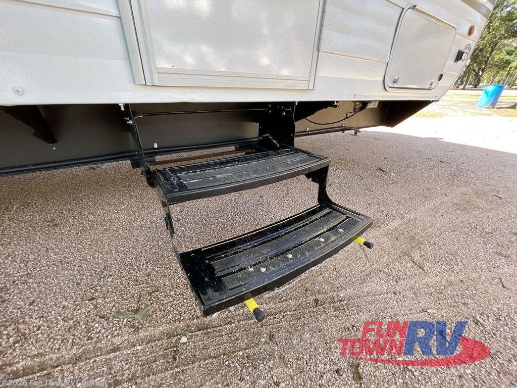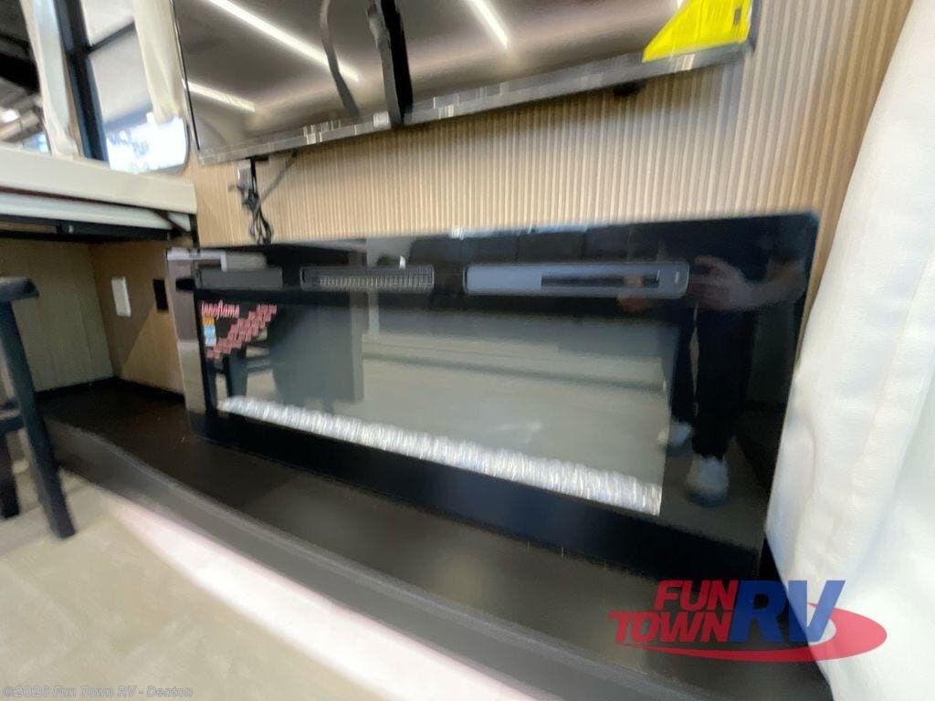 This travel trailer will feel more like home with its rear veranda/porch, dual entry doors, and front master bedroom! There is an outdoor kitchen on the back porch so you can make lunch in the fresh air, and the patio doors lead right into the main living area. Your crew can relax on the L-shaped sofa across from the fireplace, which will make your space more cozy. The U-shaped kitchen counter includes a pull-out table for even more counter space, and the walk-thru bath is easily accessible for everyone to use. You will love having your own space in the master bedroom, and the Versa-Tilt custom king bed will let you sit up in bed to read your book at night. One of the dual entry doors is also found here for added convenience!