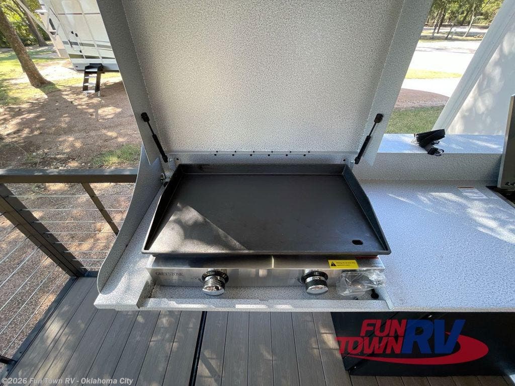 This travel trailer will feel more like home with its rear veranda/porch, dual entry doors, and front master bedroom! There is an outdoor kitchen on the back porch so you can make lunch in the fresh air, and the patio doors lead right into the main living area. Your crew can relax on the L-shaped sofa across from the fireplace, which will make your space more cozy. The U-shaped kitchen counter includes a pull-out table for even more counter space, and the walk-thru bath is easily accessible for everyone to use. You will love having your own space in the master bedroom, and the Versa-Tilt custom king bed will let you sit up in bed to read your book at night. One of the dual entry doors is also found here for added convenience!