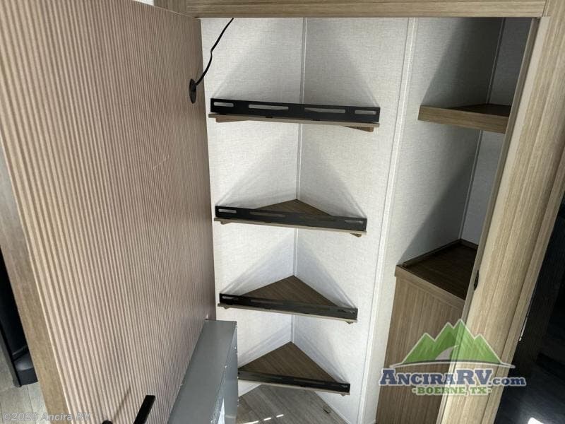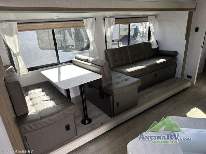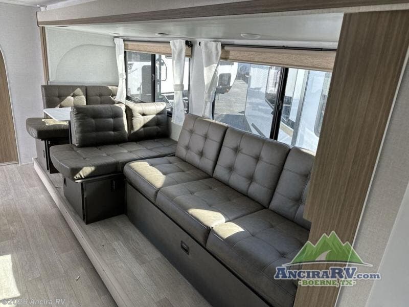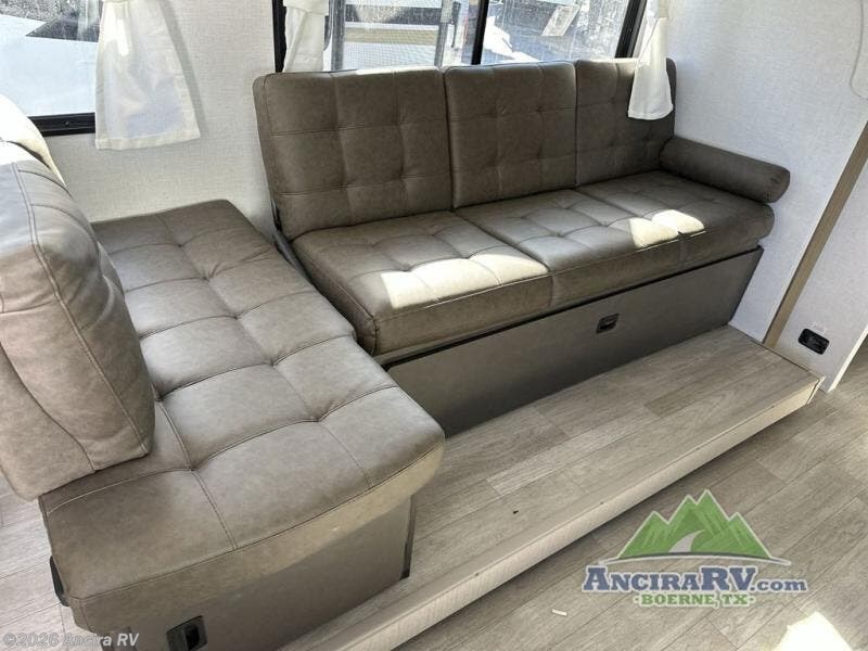 You're sure to make camping memories in this spacious travel trailer! You can sleep four to five people each night thanks to the the custom king bed with Versa Tilt in the front bedroom plus the Versa-Lounge and booth dinette within the large slide out! The full kitchen will let you make meals each day, and you'll appreciate the hidden pantry with shelves behind the fireplace. And don't overlook the full rear bath, complete with a tub/shower and ample counter space for your things.
