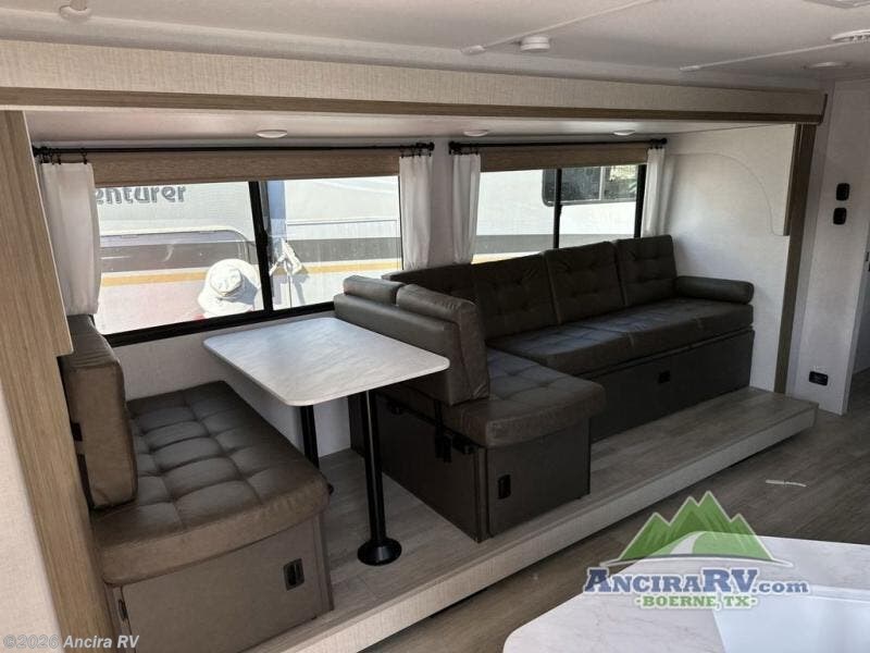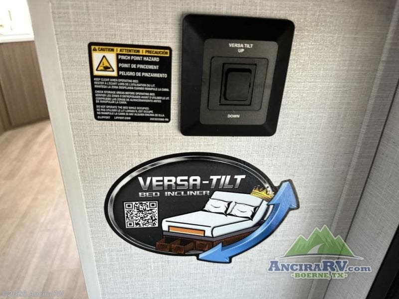 You're sure to make camping memories in this spacious travel trailer! You can easily sleep eight people each night thanks to the double-size bunks, the custom king bed with Versa Tilt in the front bedroom plus the Versa-Lounge within the large slide out! The three burner cooktop and microwave oven will let you make meals each day, and you'll appreciate the hidden pantry with shelves behind the fireplace. There is also a booth dinette where you can dine together or play a game of cards after dinner is cleaned up, or you may just find yourselves outdoors under the 16' power awning with LED lights. And don't overlook the full bath, complete with a tub/shower that will make bath time easier if you have little ones.