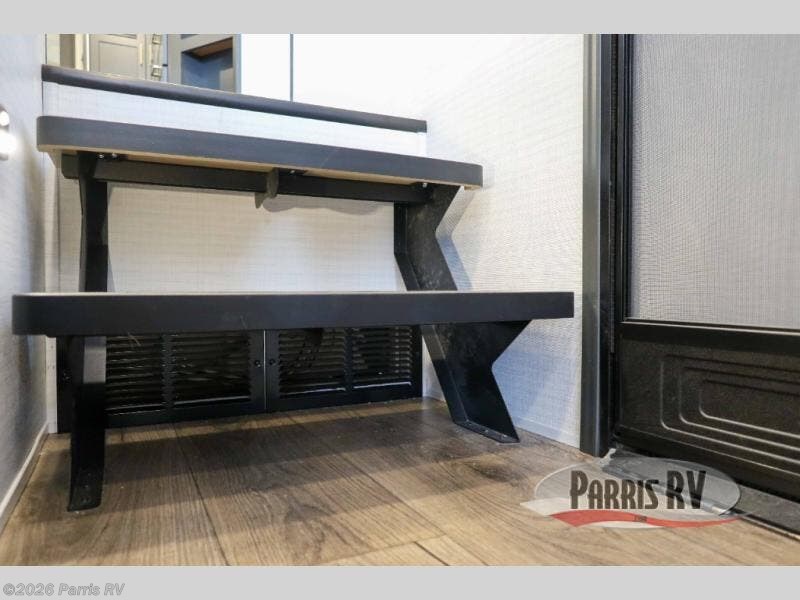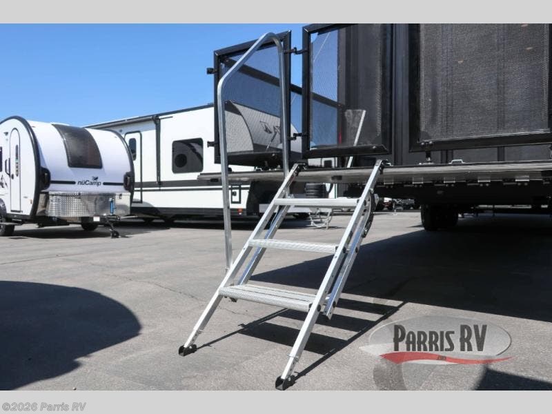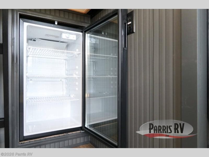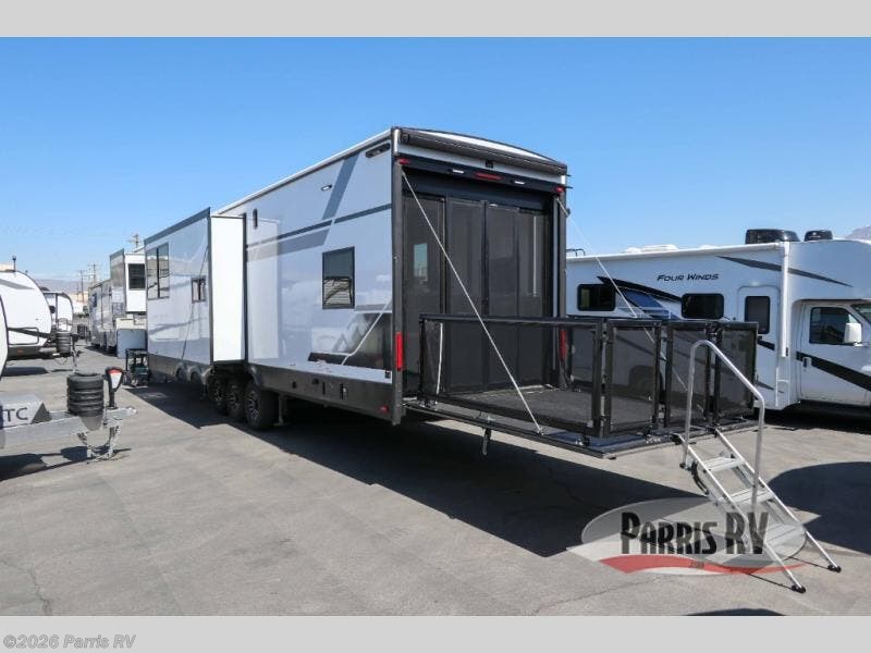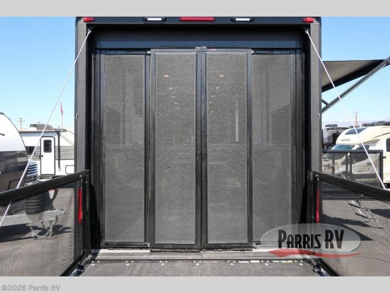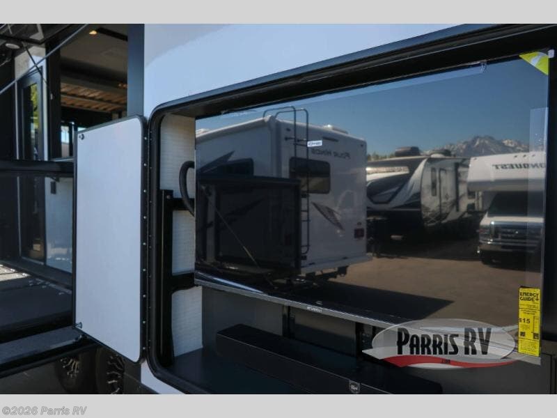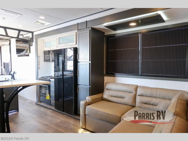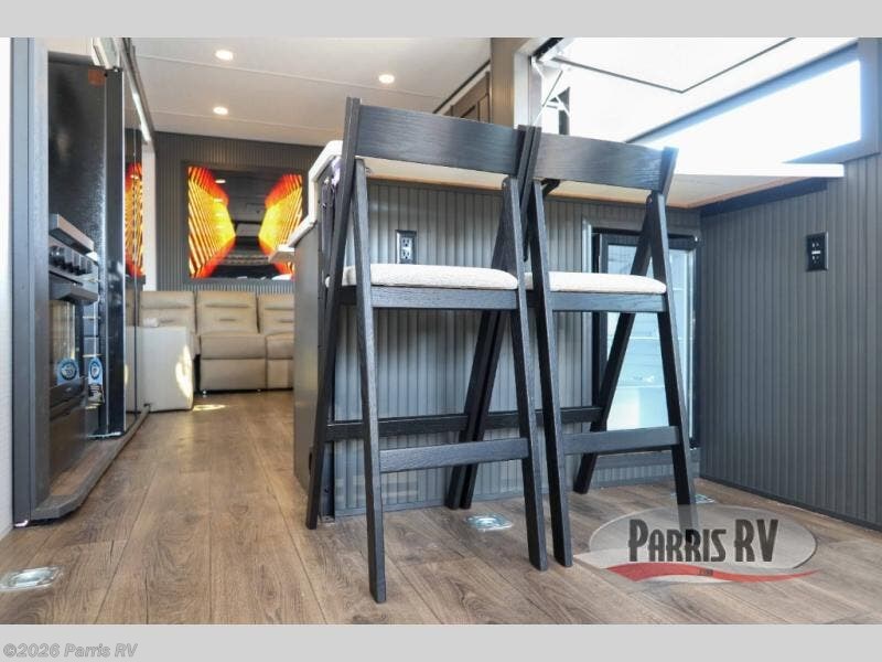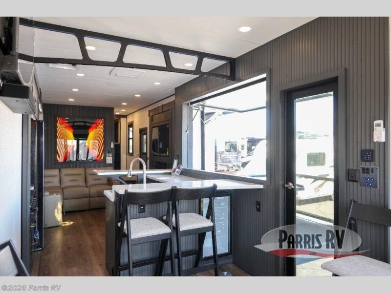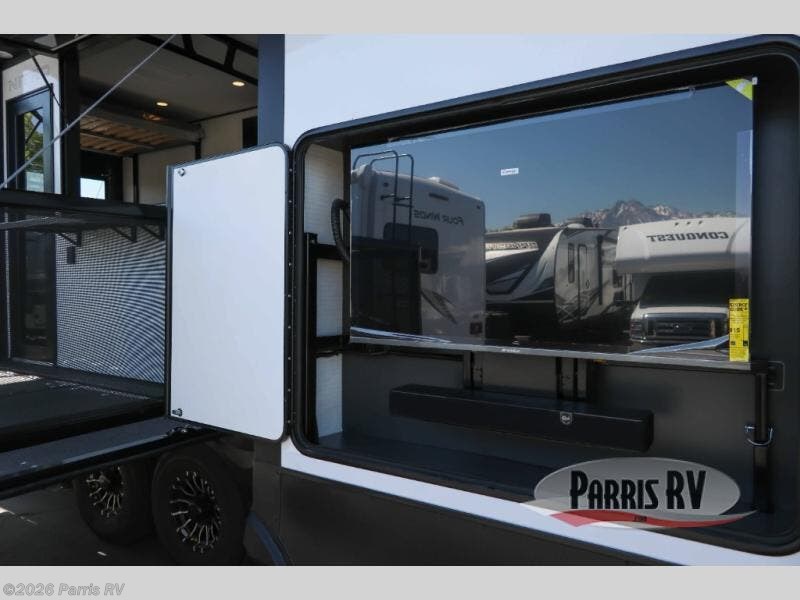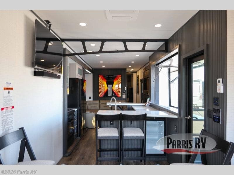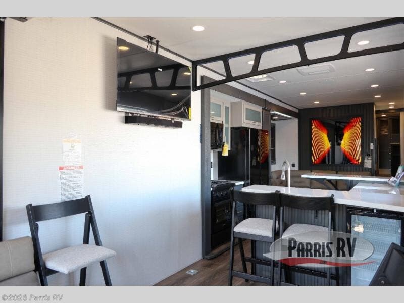 It's easy to see why this model was voted 2025 Top Innovation by RV Business! Once you arrive at your destination, you can unload your toys from the 13' garage, then relax on the dual gaucho sofas with a removable dinette table in between. There is also a queen-size Euro bed above the sofa where guests can sleep. Everyone will love to visit on the side patio that features a flip-down bar top and a window that looks into the kitchen. There are also bar stools here and inside at the counter so everyone has a seat. If the weather isn't cooperating, you can relax on the L-shaped sofa in the main living area, and there is a 55" TV with a hidden pantry behind for snacks! A spacious full bath will let everyone freshen up after trail riding, and you'll love having your own bedroom up front. Here, you'll find a king bed slide out, a wardrobe, dresser, plus washer and dryer prep if you choose to add those appliances!