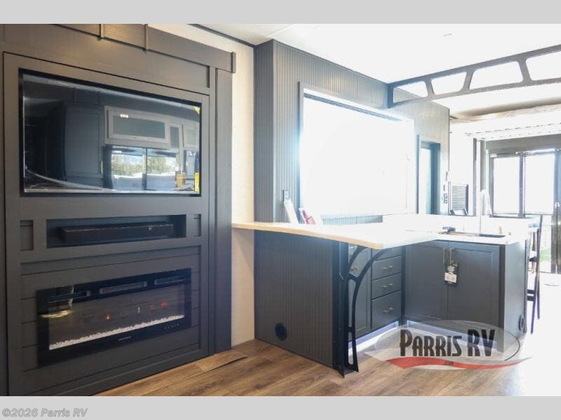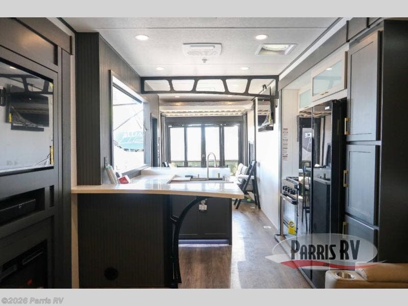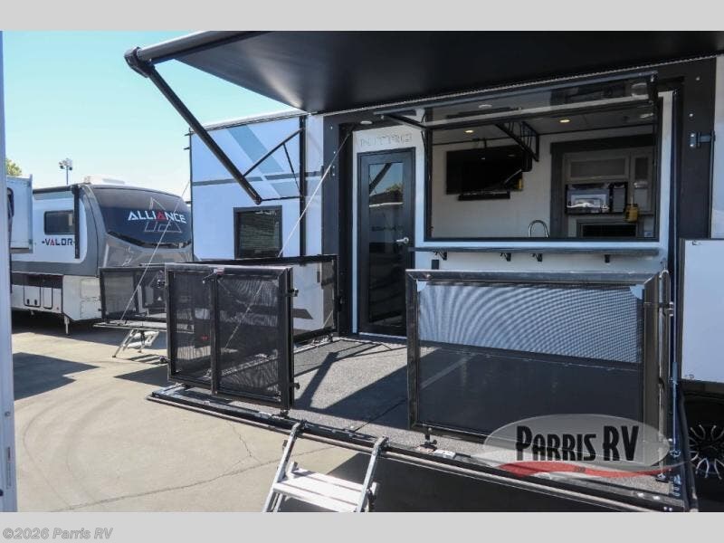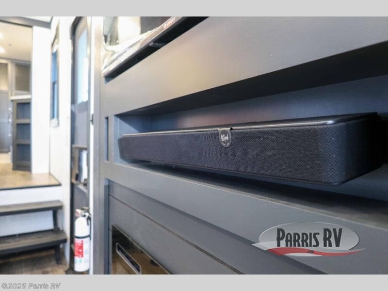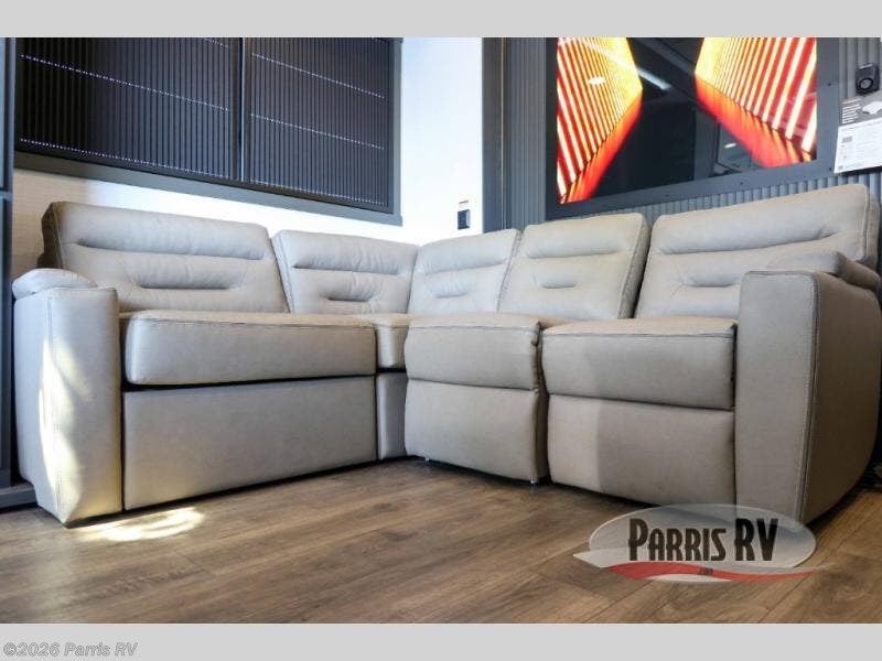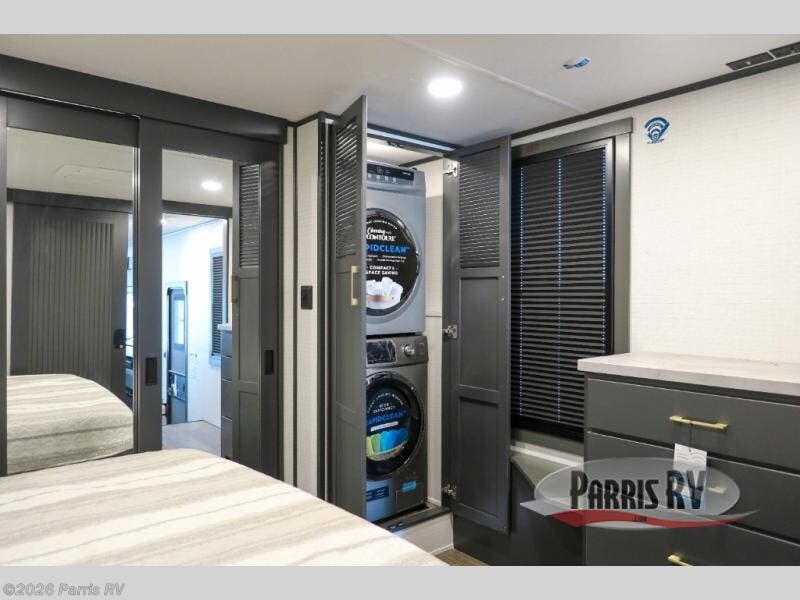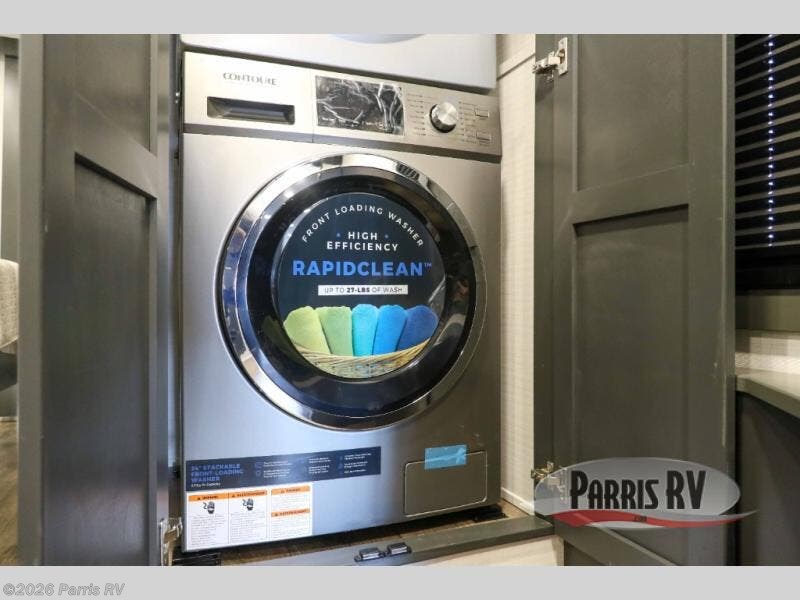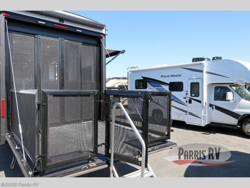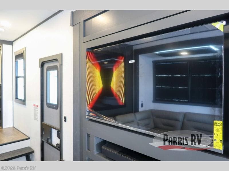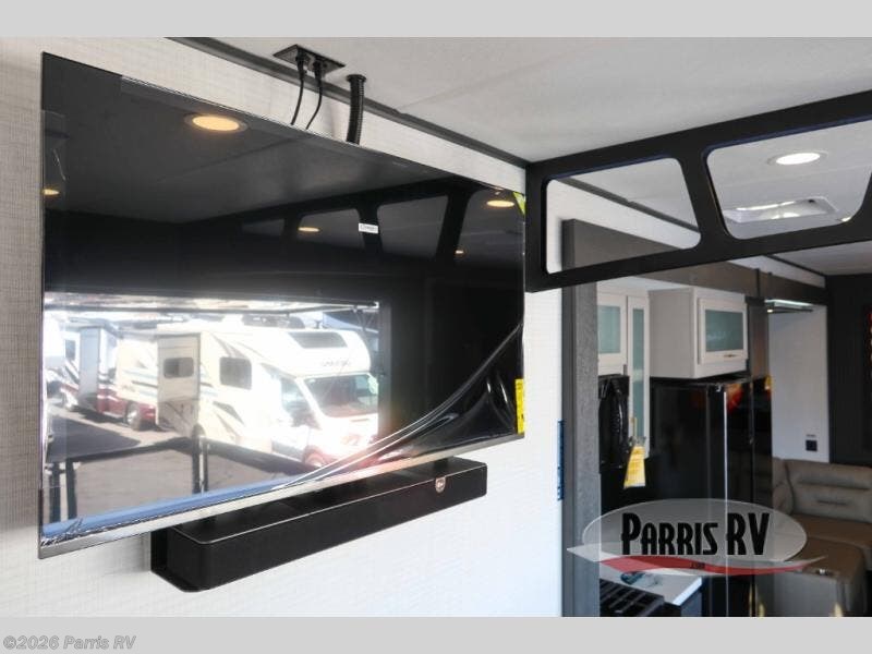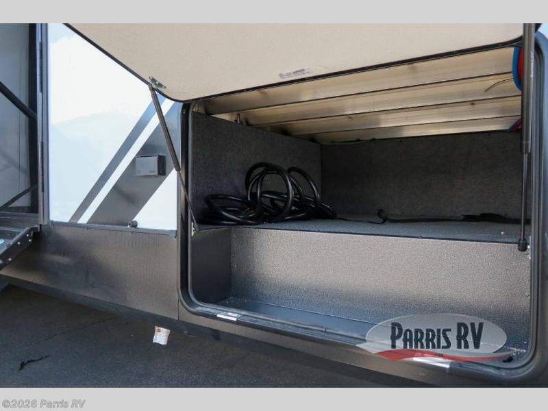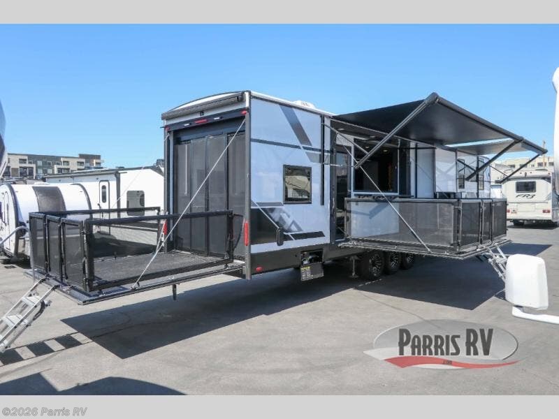 It's easy to see why this model was voted 2025 Top Innovation by RV Business! Once you arrive at your destination, you can unload your toys from the 13' garage, then relax on the dual gaucho sofas with a removable dinette table in between. There is also a queen-size Euro bed above the sofa where guests can sleep. Everyone will love to visit on the side patio that features a flip-down bar top and a window that looks into the kitchen. There are also bar stools here and inside at the counter so everyone has a seat. If the weather isn't cooperating, you can relax on the L-shaped sofa in the main living area, and there is a 55" TV with a hidden pantry behind for snacks! A spacious full bath will let everyone freshen up after trail riding, and you'll love having your own bedroom up front. Here, you'll find a king bed slide out, a wardrobe, dresser, plus washer and dryer prep if you choose to add those appliances!