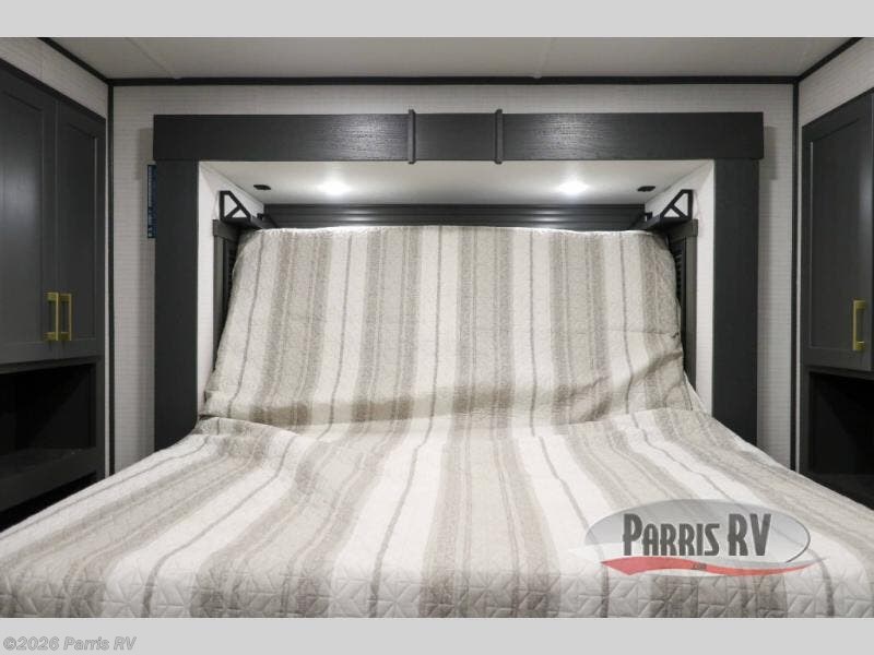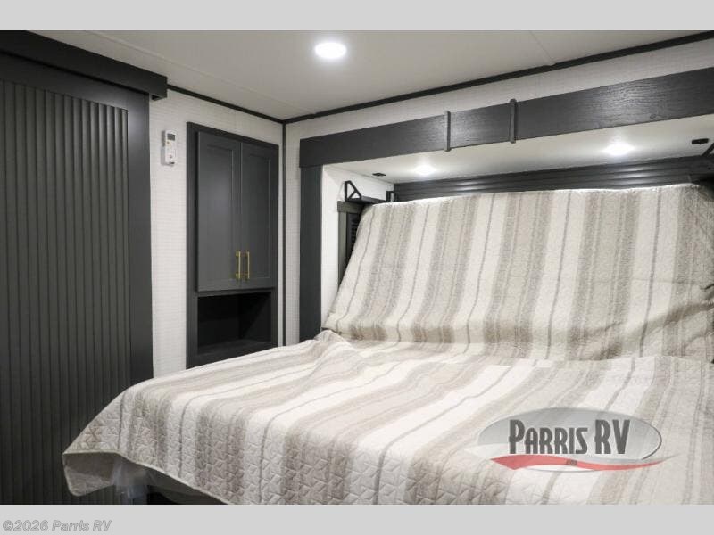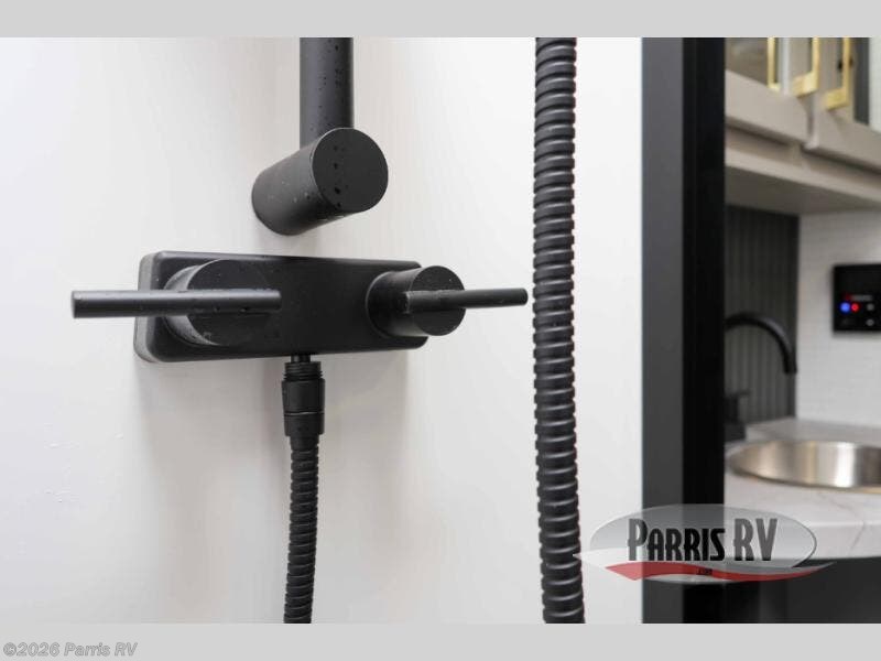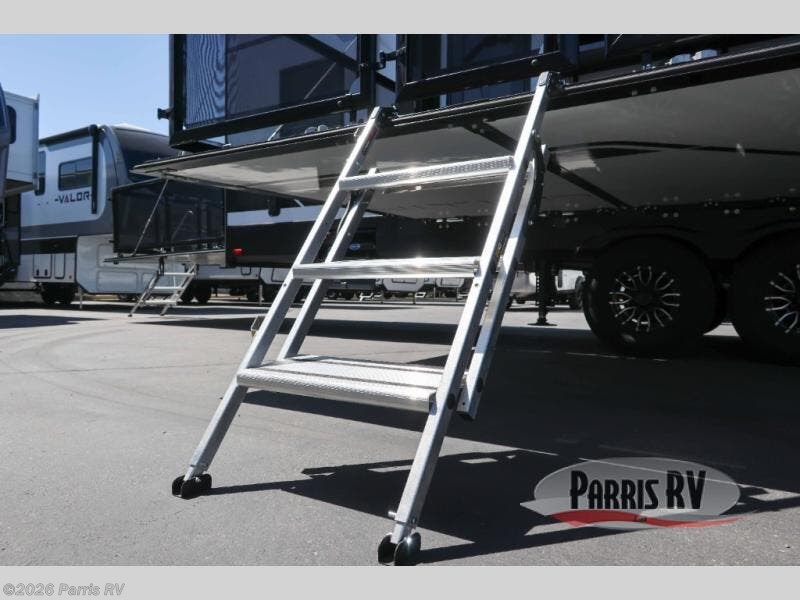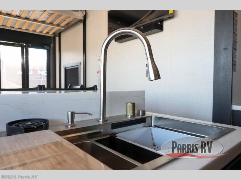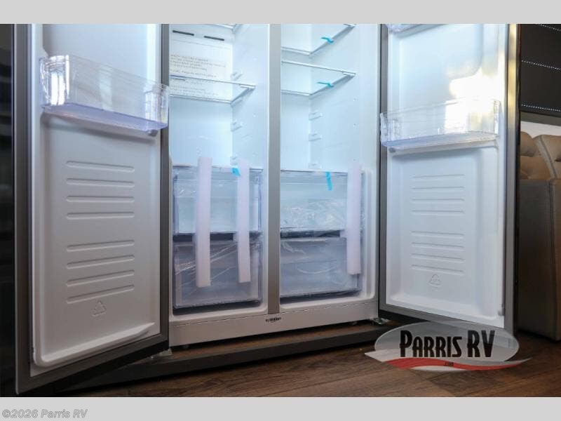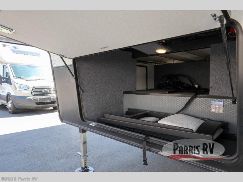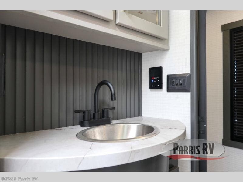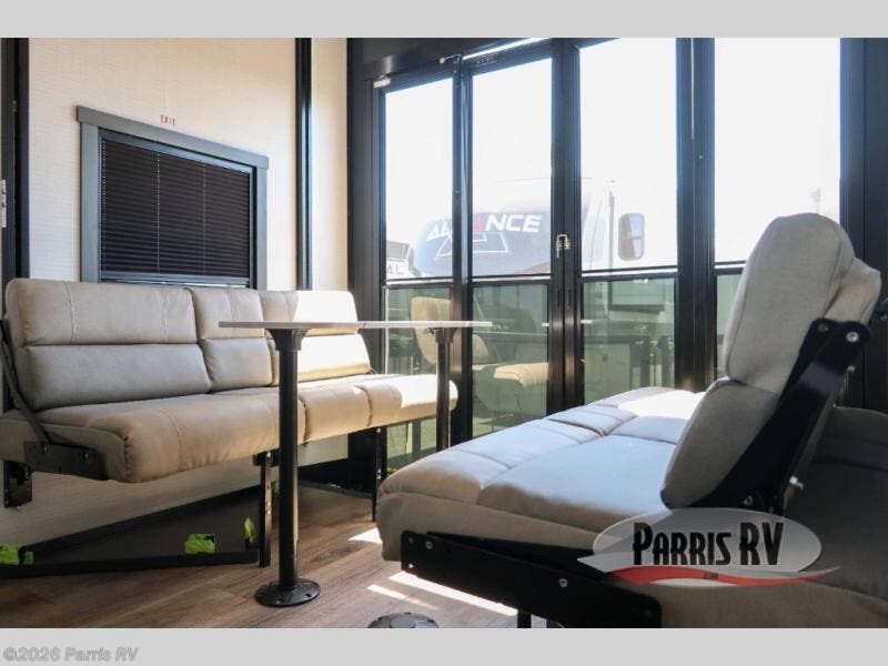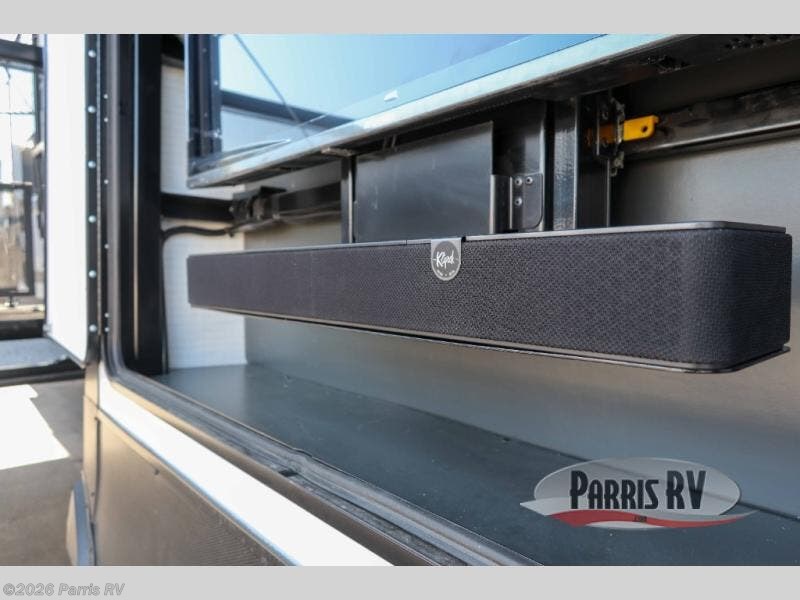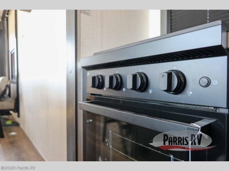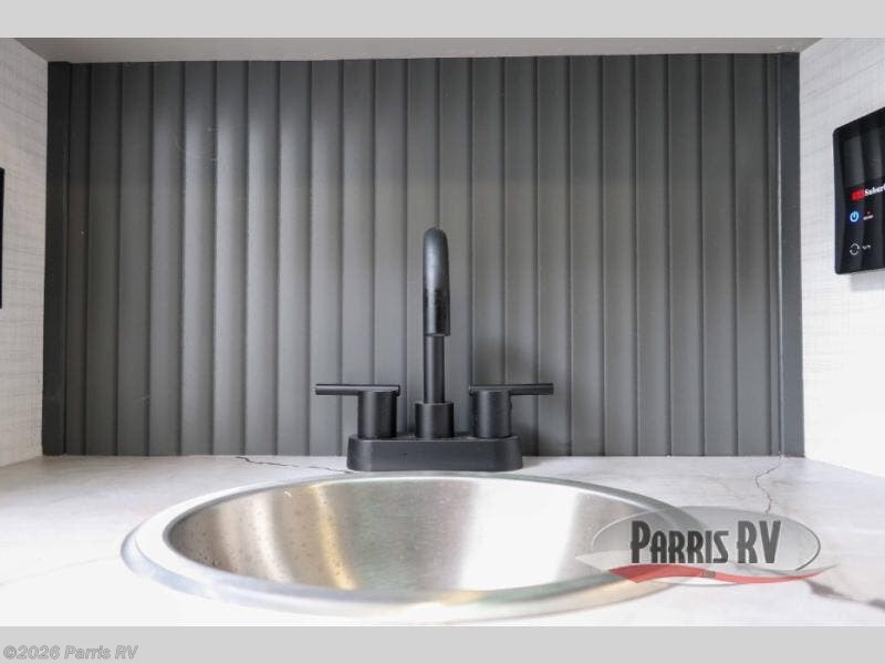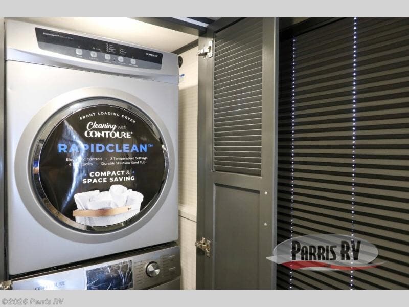 It's easy to see why this model was voted 2025 Top Innovation by RV Business! Once you arrive at your destination, you can unload your toys from the 13' garage, then relax on the dual gaucho sofas with a removable dinette table in between. There is also a queen-size Euro bed above the sofa where guests can sleep. Everyone will love to visit on the side patio that features a flip-down bar top and a window that looks into the kitchen. There are also bar stools here and inside at the counter so everyone has a seat. If the weather isn't cooperating, you can relax on the L-shaped sofa in the main living area, and there is a 55" TV with a hidden pantry behind for snacks! A spacious full bath will let everyone freshen up after trail riding, and you'll love having your own bedroom up front. Here, you'll find a king bed slide out, a wardrobe, dresser, plus washer and dryer prep if you choose to add those appliances!
