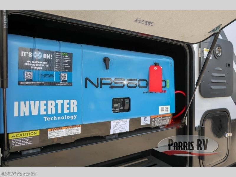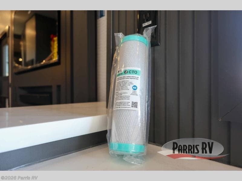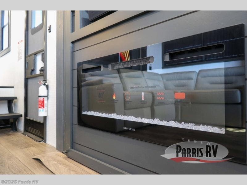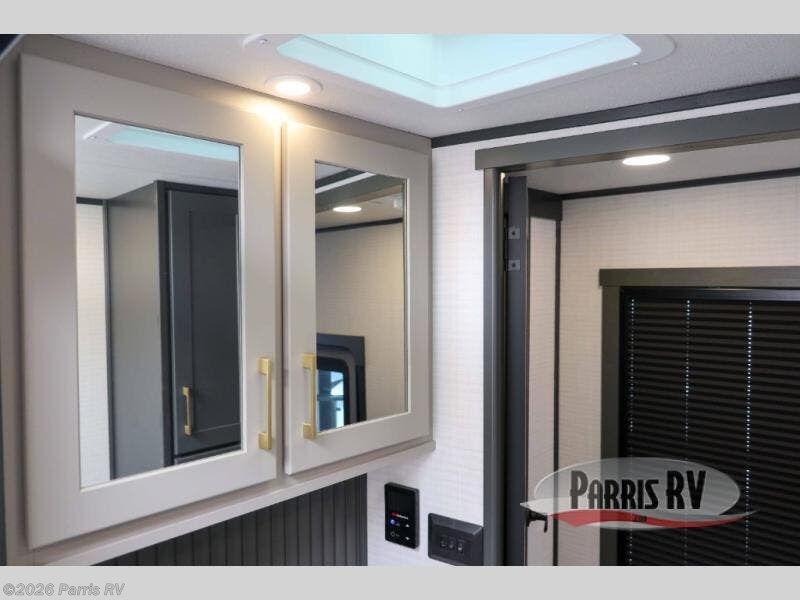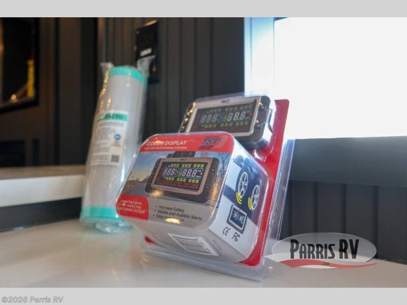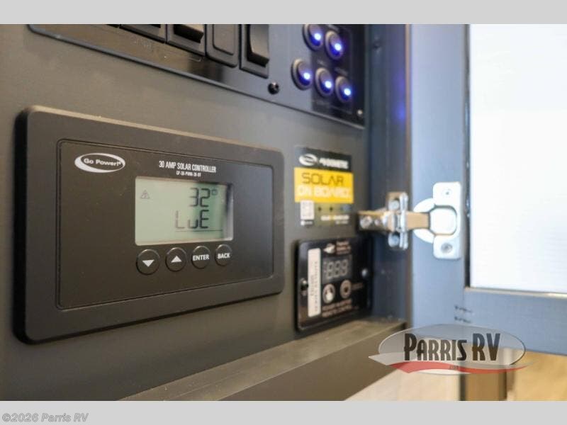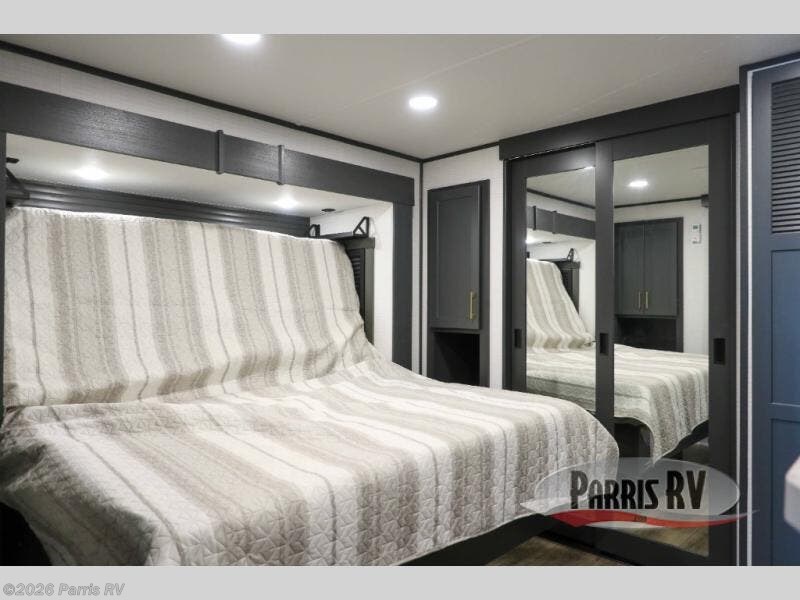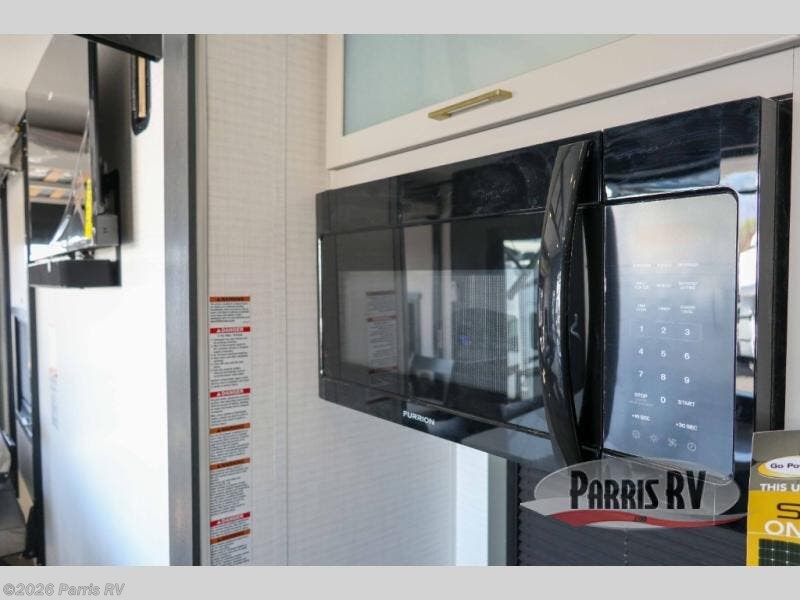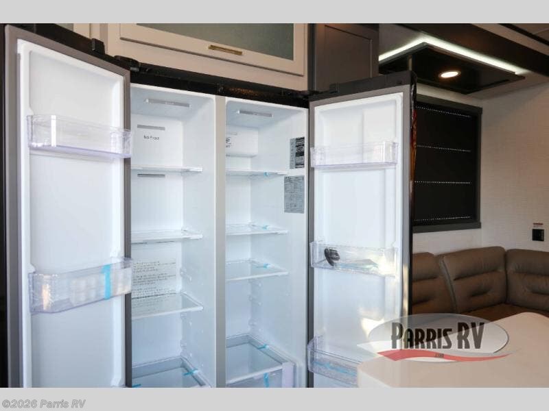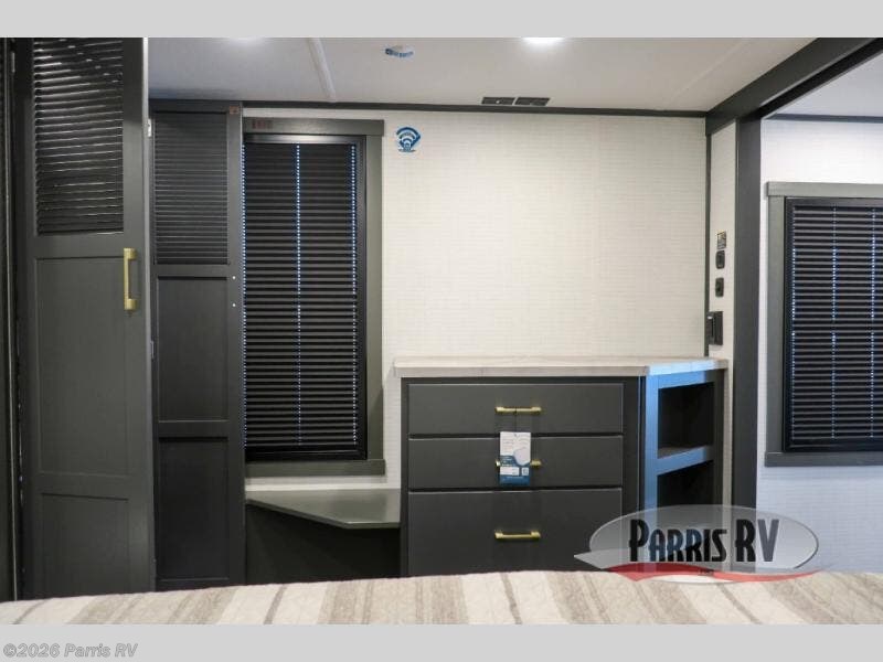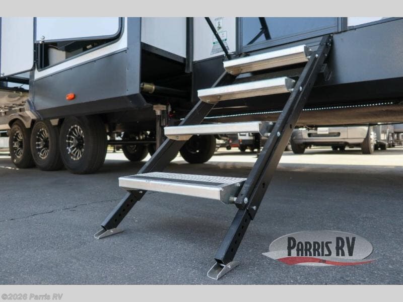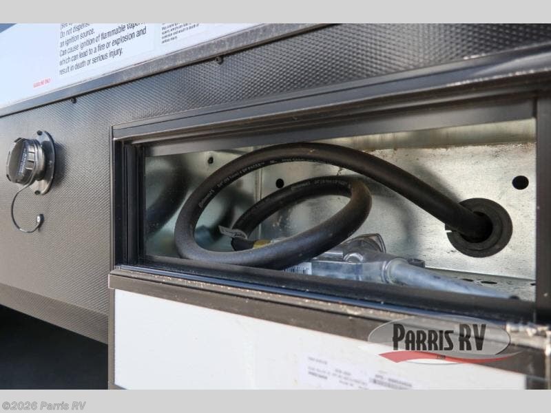 It's easy to see why this model was voted 2025 Top Innovation by RV Business! Once you arrive at your destination, you can unload your toys from the 13' garage, then relax on the dual gaucho sofas with a removable dinette table in between. There is also a queen-size Euro bed above the sofa where guests can sleep. Everyone will love to visit on the side patio that features a flip-down bar top and a window that looks into the kitchen. There are also bar stools here and inside at the counter so everyone has a seat. If the weather isn't cooperating, you can relax on the L-shaped sofa in the main living area, and there is a 55" TV with a hidden pantry behind for snacks! A spacious full bath will let everyone freshen up after trail riding, and you'll love having your own bedroom up front. Here, you'll find a king bed slide out, a wardrobe, dresser, plus washer and dryer prep if you choose to add those appliances!