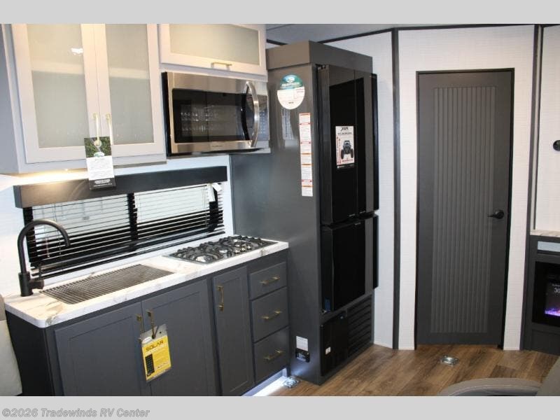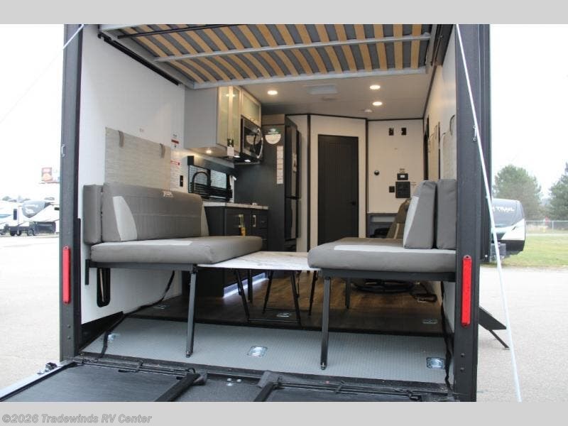 This toy hauler with a 14' 6" garage is sure to meet all your camping needs! Once you unload using the 3,000 lb. capacity ramp door, you can enjoy the 1,500 lb. capacity patio deck and enjoy a cold drink. There is seating space on the dual gaucho sofas with a table in between, and your guests can sleep on the queen-size Euro bed lift above. A full kitchen lets you cook meals each day, and the fireplace will make your space feel more like home. There is a walk-thru bath that leads to the front master bedroom where you'll find an RV queen bed, dual wardrobes and nightstands plus a closet to keep clothes wrinkle-free!