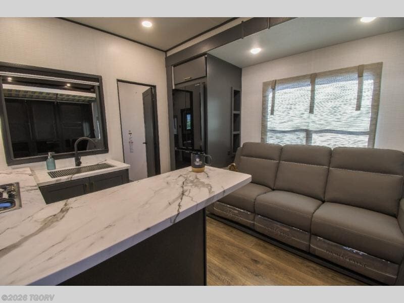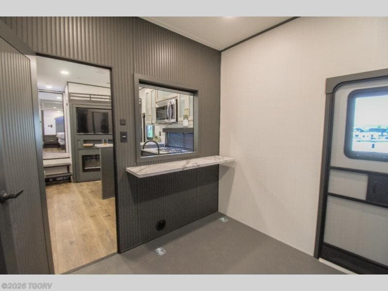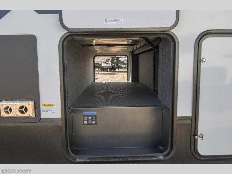You'll love every minute spent in this double slide out, double entry fifth wheel! Your guests will have the 13' 6" separate garage all to themselves once the toys are unloaded, and here you'll find dual sofa sleepers with a Euro queen bed above. There is also a removable dinette table where you can enjoy a cold drink at when you have the 1,500 lb. capacity patio deck set up! Head to the combined kitchen and living area to relax on the sofa slide out while the cook prepares dinner. There is also a hidden pantry here you are sure to appreciate! The dual entry bath will create a front master bedroom, complete with a queen bed, dual nightstands and wardrobes, plus a wardrobe slide out for added storage and space!