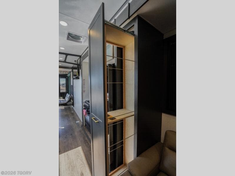 It's easy to see why this model was voted 2025 Top Innovation by RV Business! Once you arrive at your destination, you can unload your toys from the 13' garage, then relax on the dual gaucho sofas with a removable dinette table in between. There is also a queen-size Euro bed above the sofa where guests can sleep. Everyone will love to visit on the side patio that features a flip-down bar top and a window that looks into the kitchen. There are also bar stools here and inside at the counter so everyone has a seat. If the weather isn't cooperating, you can relax on the L-shaped sofa in the main living area, and there is a 55" TV with a hidden pantry behind for snacks! A spacious full bath will let everyone freshen up after trail riding, and you'll love having your own bedroom up front. Here, you'll find a king bed slide out, a wardrobe, dresser, plus washer and dryer prep if you choose to add those appliances!