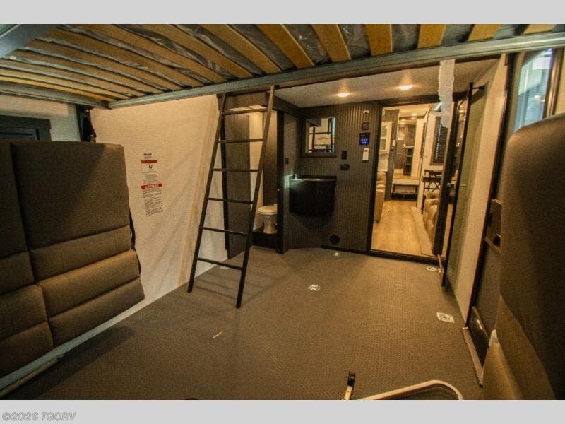 When you're ready to kick up some mud, hitch this toy hauler up and head out! You can set up the patio deck once your toys are removed from the 14' separate garage and relax with a cold drink. You'll find seating space on the Sit N Sleep roll-over sofas with a removable dinette table in between, and the Sleep N Store electric queen bed will provide sleeping space for your guests. There is also a loft and a half bath for even more convenience. Head through the garage glass sliding doors to the living area with an L-shaped sofa and theater seating, or start lunch in the shared middle kitchen with ample counter space. There is even a free-standing table and chairs like you would find at home. The full bath up front lets you clean up after a trail ride and the front private bedroom will have you feeling right at home. A king bed slide out comes standard, along with a large front wardrobe with washer and dryer prep, plus a dresser and TV backer if you want to add your own TV.