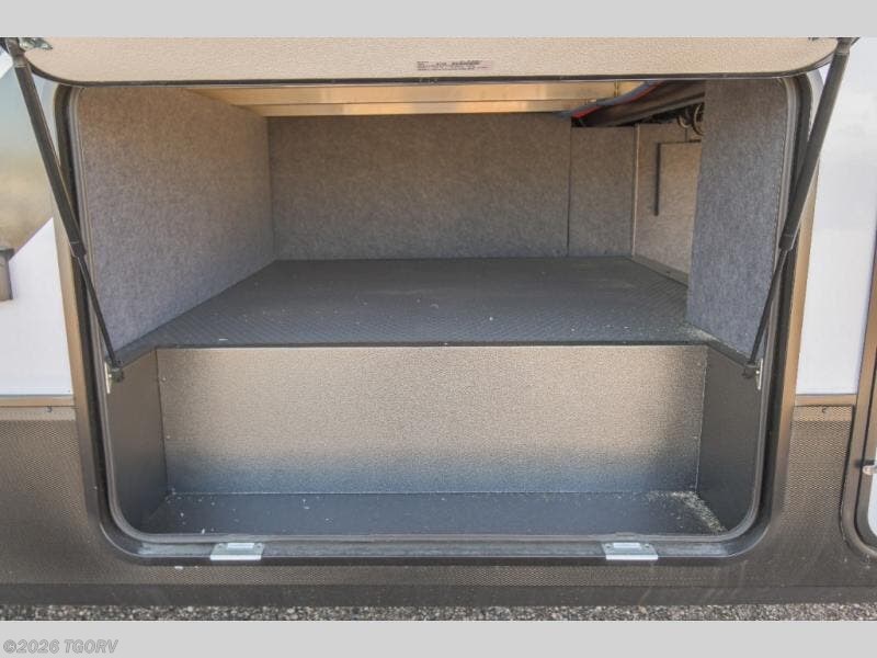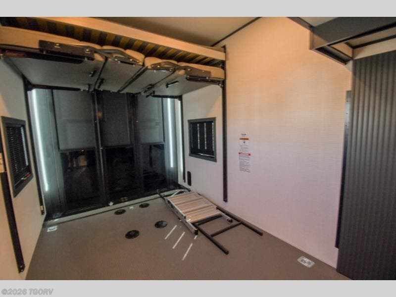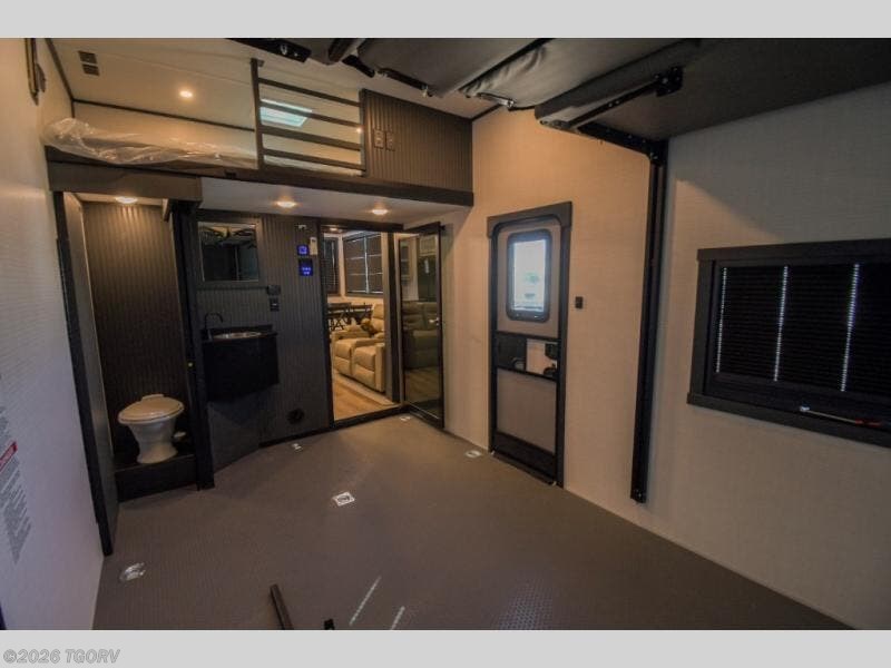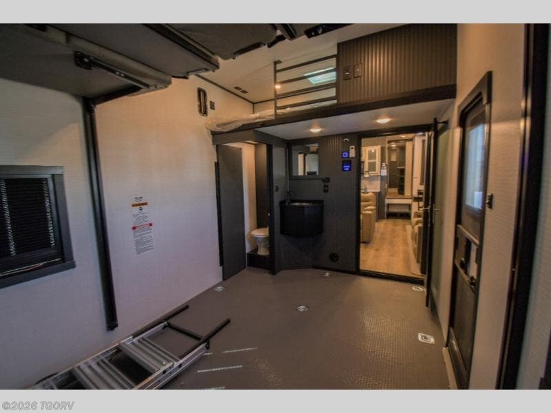 When you're ready to kick up some mud, hitch this toy hauler up and head out! You can set up the patio deck once your toys are removed from the 14' separate garage and relax with a cold drink. You'll find seating space on the Sit N Sleep roll-over sofas with a removable dinette table in between, and the Sleep N Store electric queen bed will provide sleeping space for your guests. There is also a loft and a half bath for even more convenience. Head through the garage glass sliding doors to the living area with an L-shaped sofa and theater seating, or start lunch in the shared middle kitchen with ample counter space. There is even a free-standing table and chairs like you would find at home. The full bath up front lets you clean up after a trail ride and the front private bedroom will have you feeling right at home. A king bed slide out comes standard, along with a large front wardrobe with washer and dryer prep, plus a dresser and TV backer if you want to add your own TV.