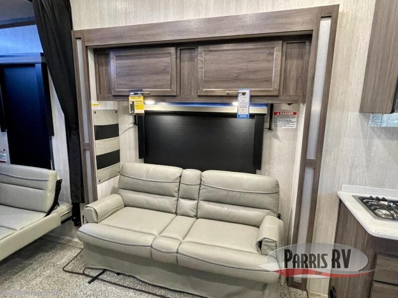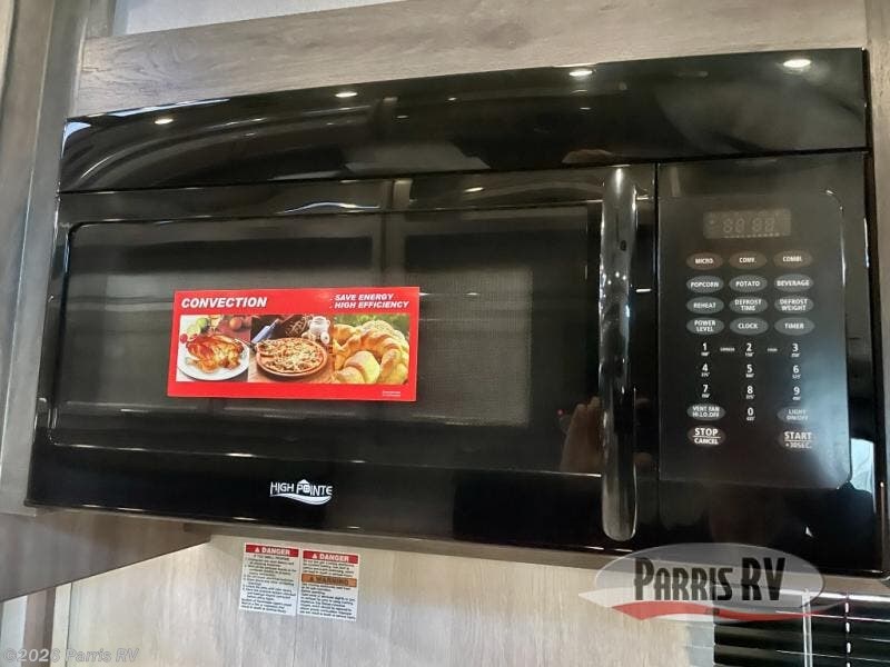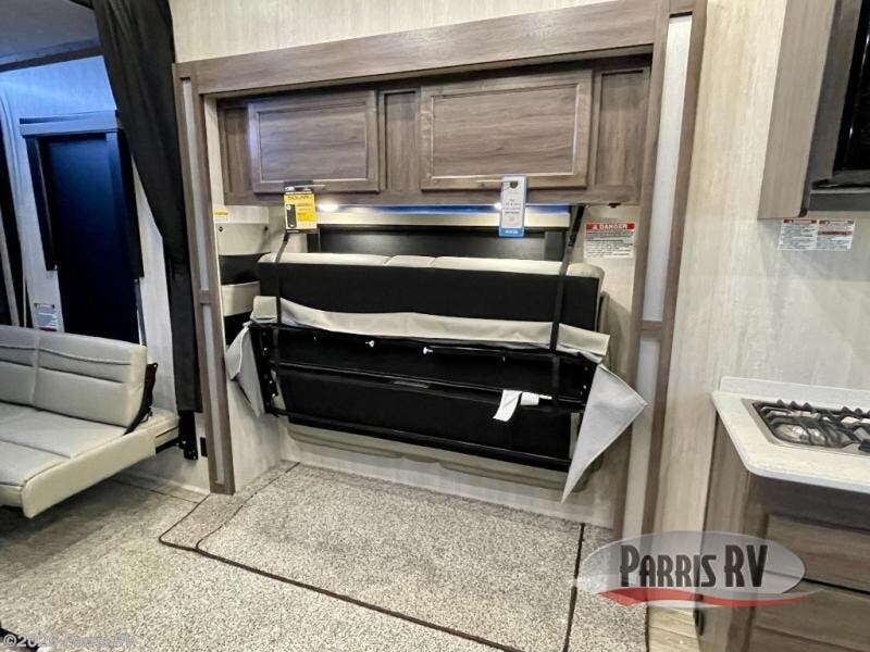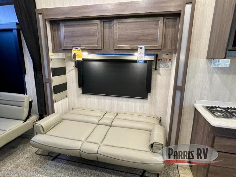 Wherever you decide to roam, this toy hauler will be ready for adventure! The cozy living area includes dual Euro chairs with a table in between and a sofa slide out with a table so you'll have plenty of room to relax. There is an extra large over-the-range residential microwave plus a glass stove top to cook meals each day. A full bath includes a shower with a glass enclosure, toilet, and a sink to freshen up each day. Your guests will also love the power sofa bed with a power upper bunk!