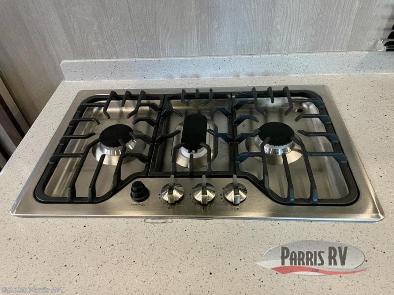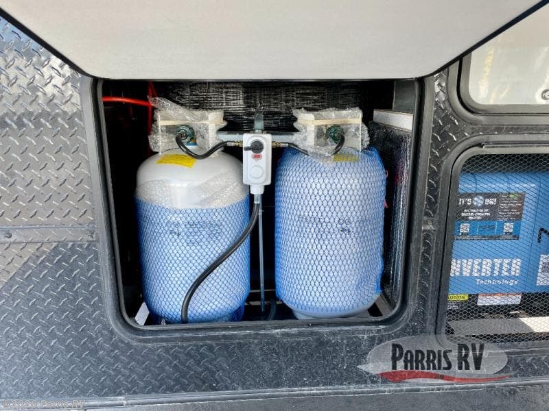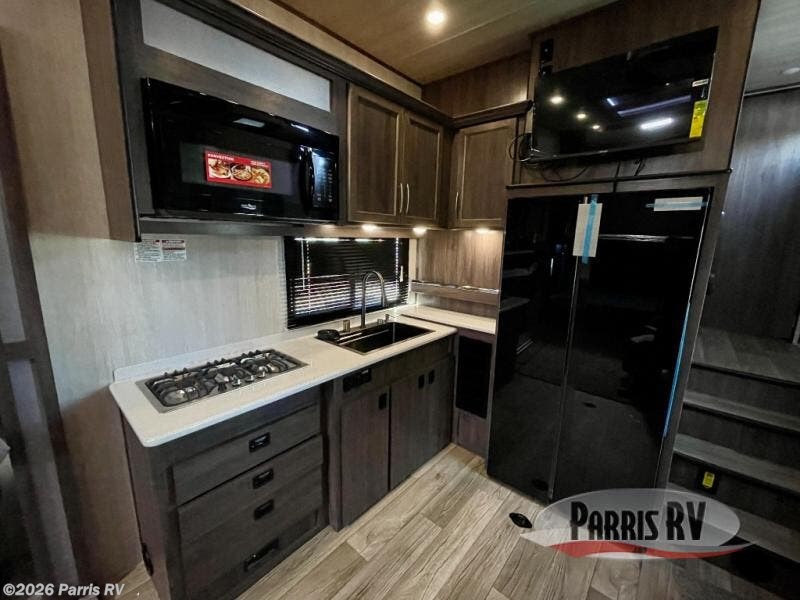 Your camping life is going to be a blast with the Genesis Supreme Vortex toy hauler! These work horses get the job done but also make it fun. You will be able to use the 40-gallon fuel station to gas up your toys when you come back from the trails, and the power awning with LED lights will give you protection as you use the exterior features. The 16" deluxe aluminum alloy wheels will get you to and from your destination with confidence, and the 30,000 or 35,000 BTU furnace will ensure that you don't freeze while you sleep on cool nights. You can keep power flowing with the 4.0kW generator with transfer switch, and you'll also enjoy the function and the style of the solid-surface countertops in the kitchen.