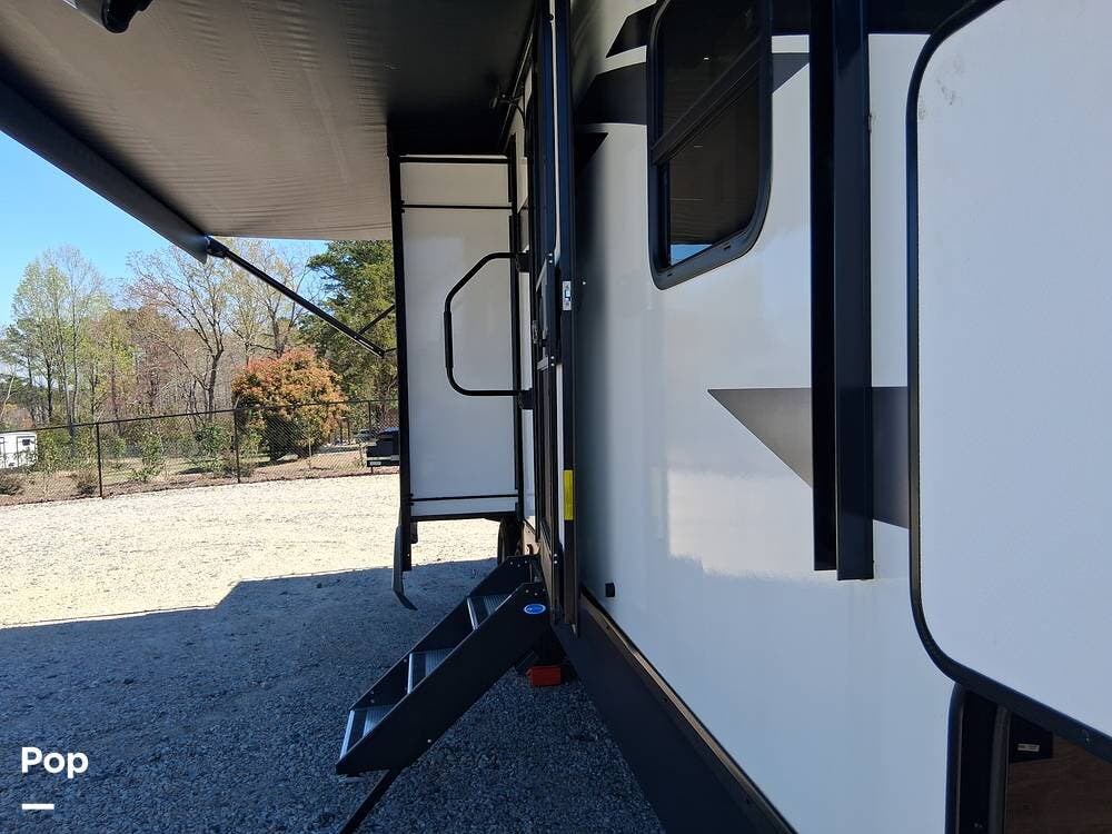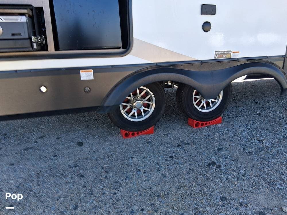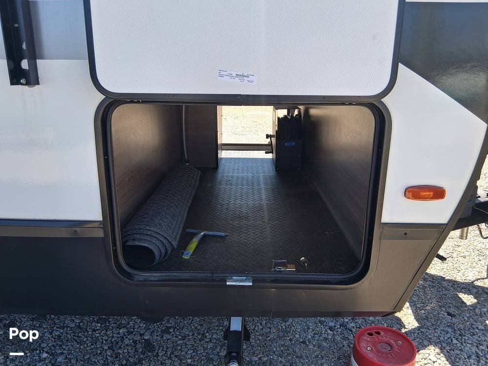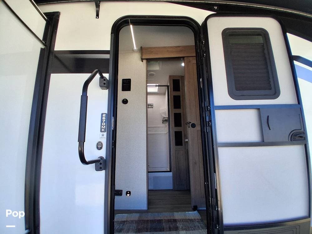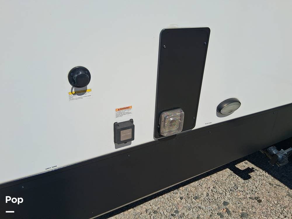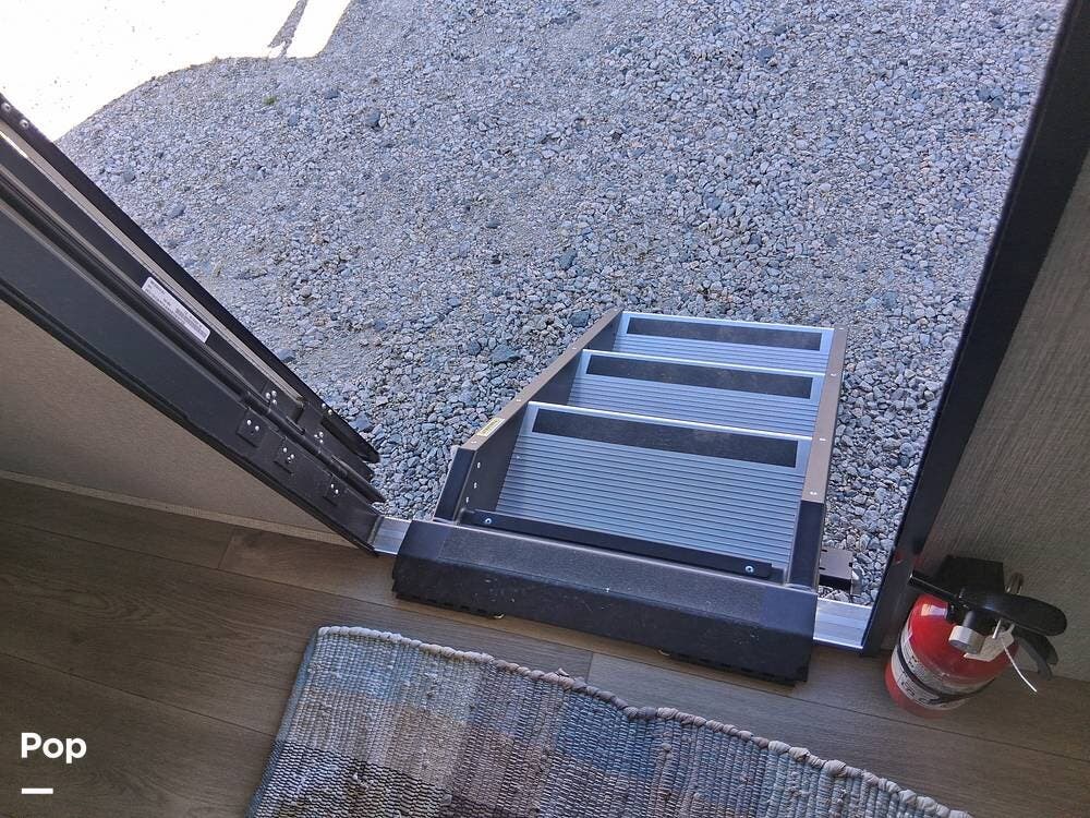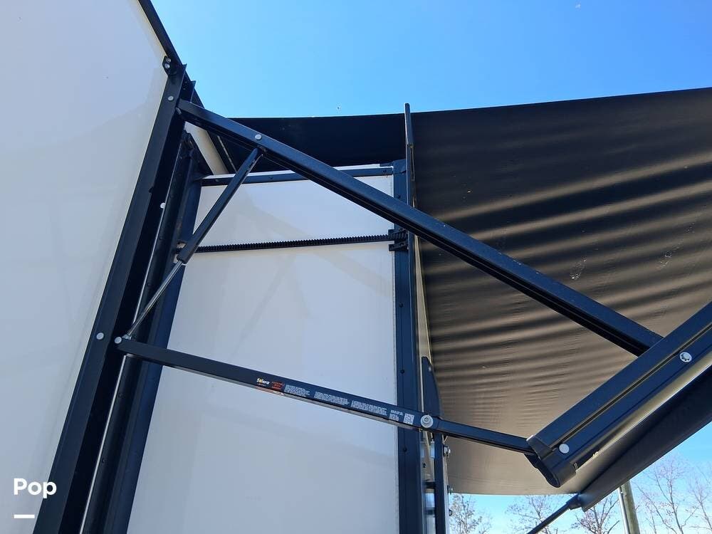 The outside of the trailer is just as impressive, designed for easy setup and outdoor enjoyment, including a power awning with LED lighting, exterior speakers, a pass-through storage compartment, aluminum steps, a sturdy grab handle, a power tongue jack, and stabilizers.