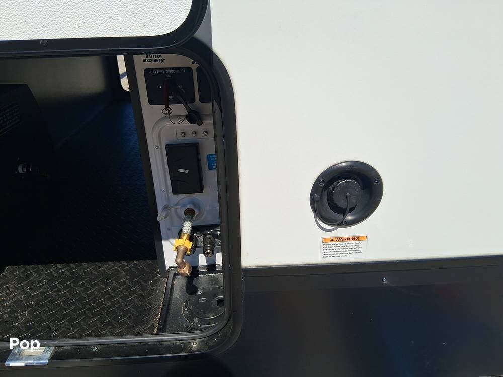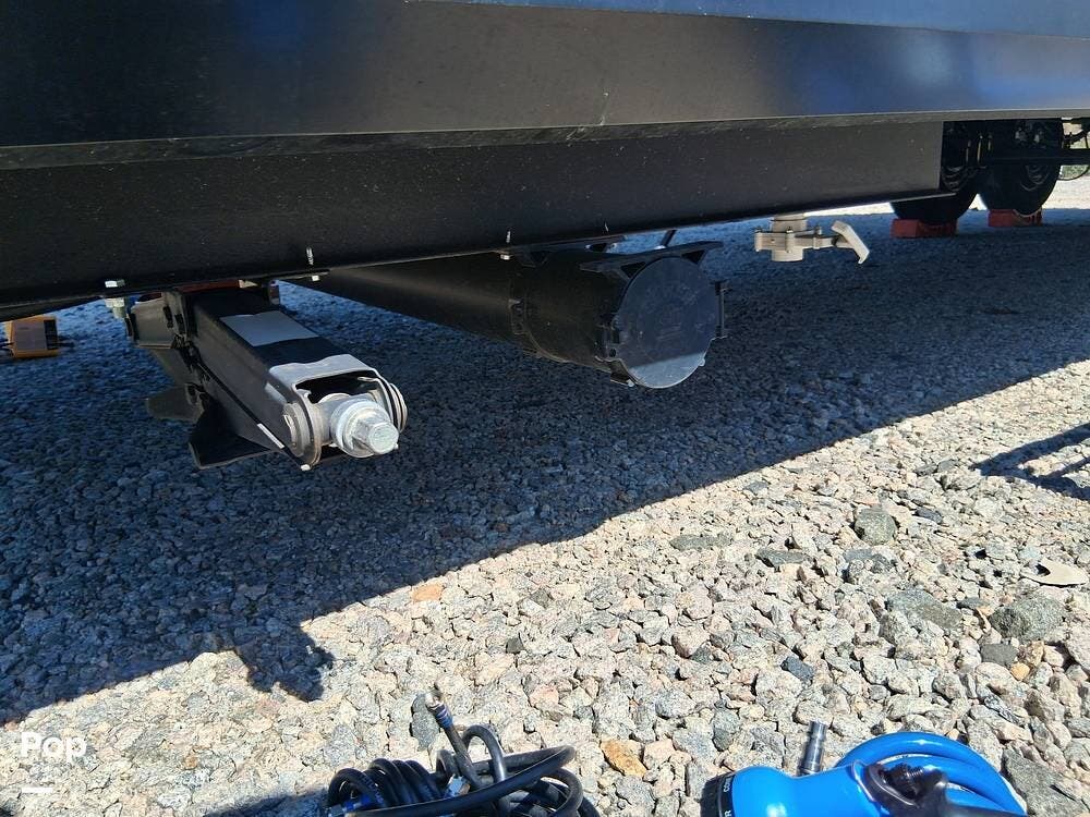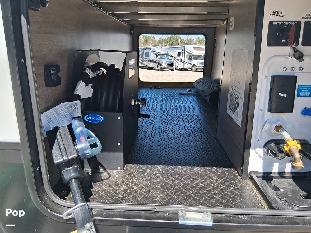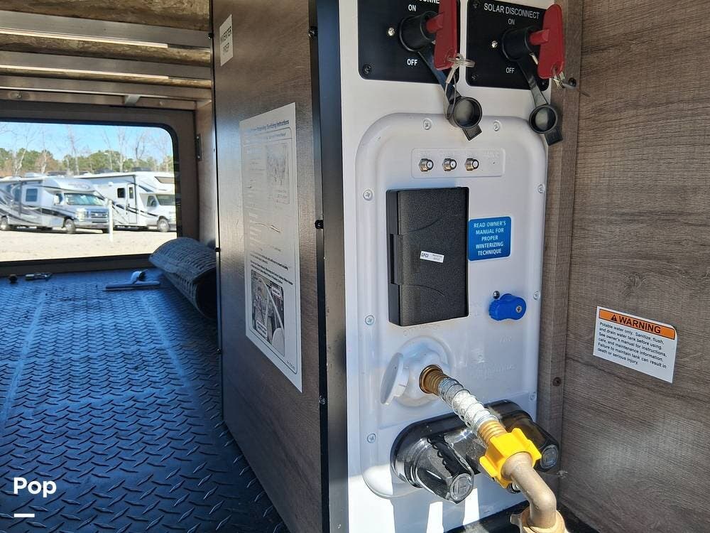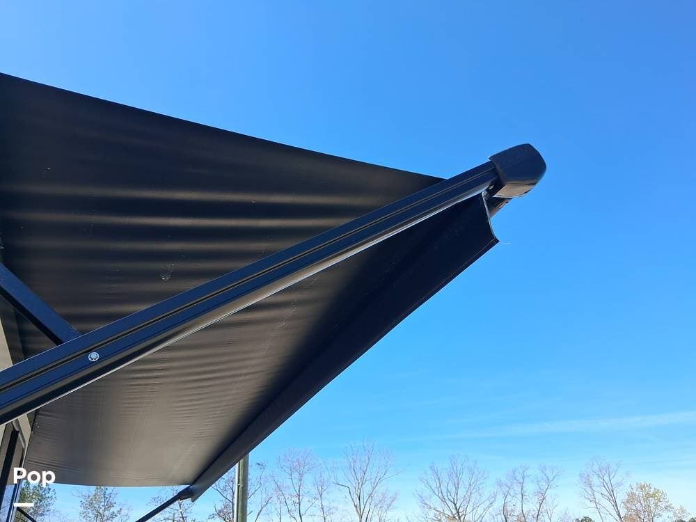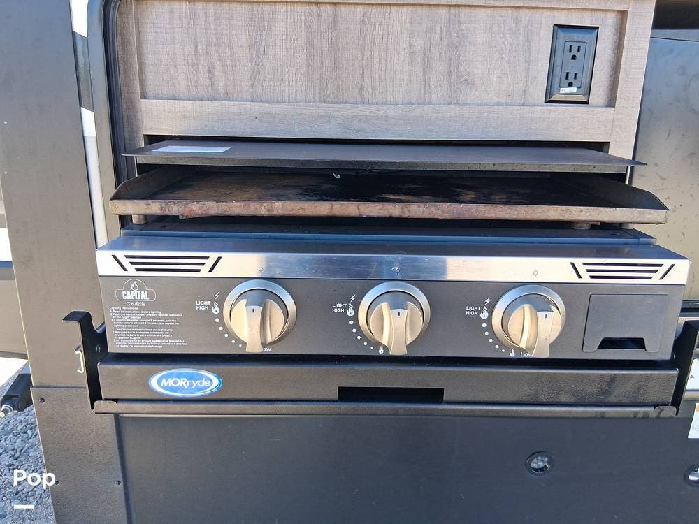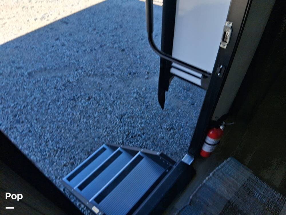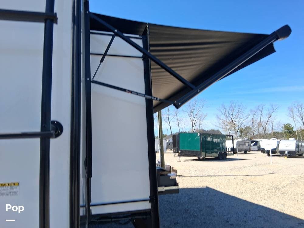 The outside of the trailer is just as impressive, designed for easy setup and outdoor enjoyment, including a power awning with LED lighting, exterior speakers, a pass-through storage compartment, aluminum steps, a sturdy grab handle, a power tongue jack, and stabilizers.