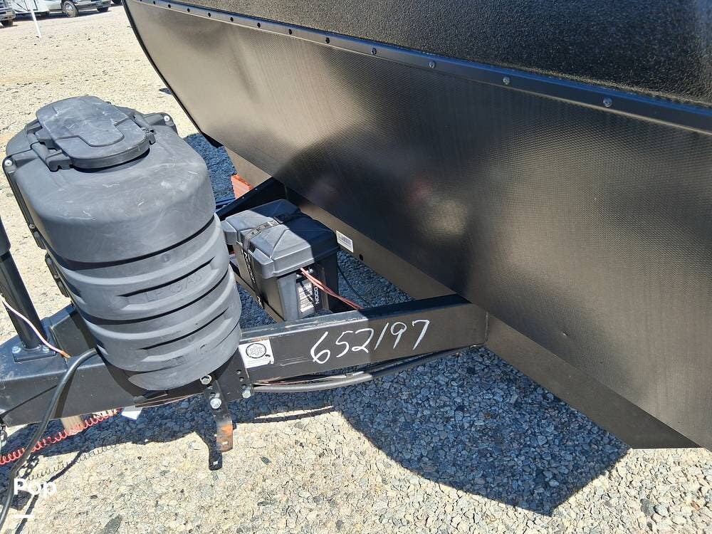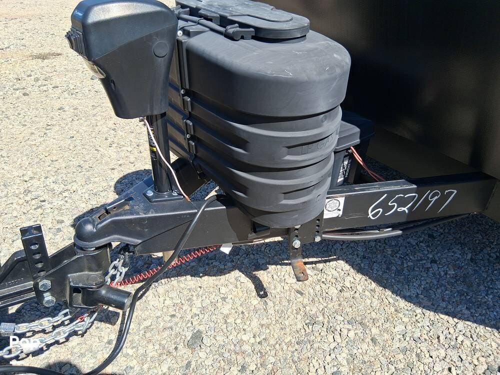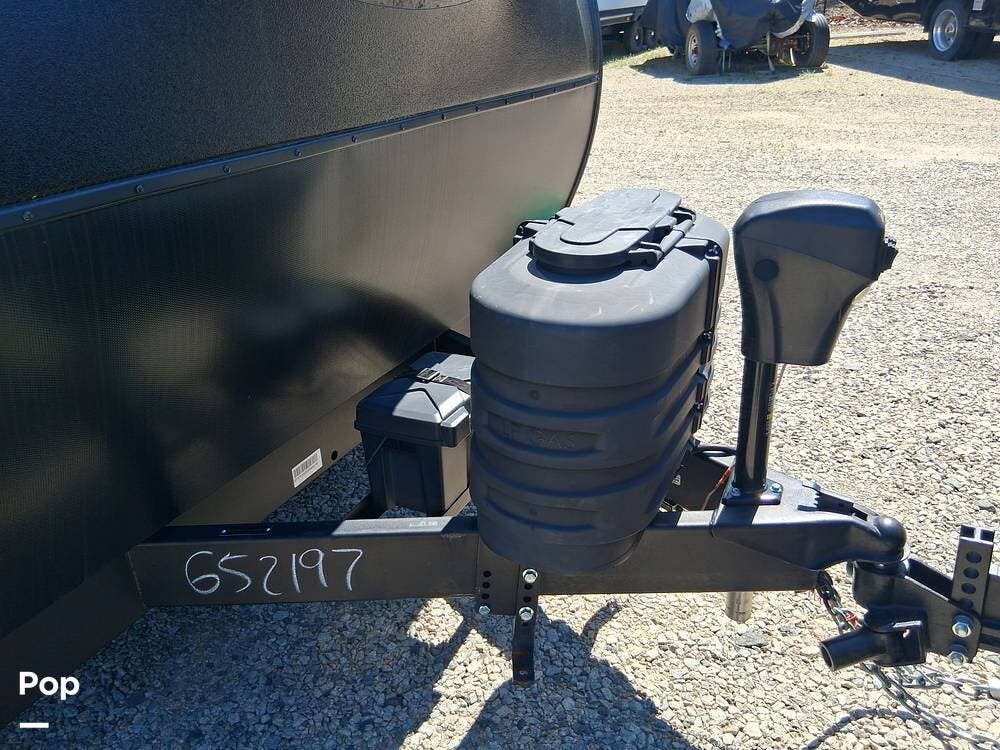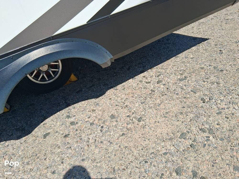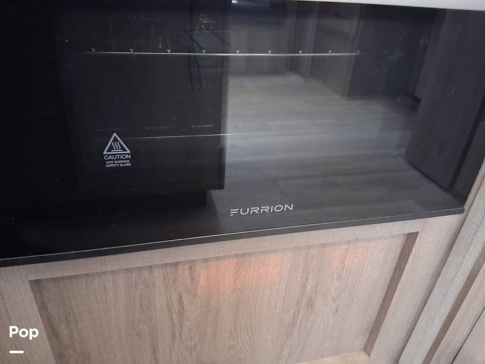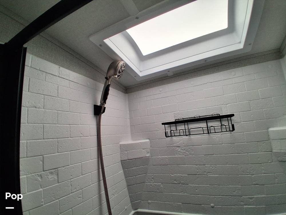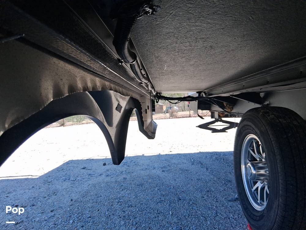 The outside of the trailer is just as impressive, designed for easy setup and outdoor enjoyment, including a power awning with LED lighting, exterior speakers, a pass-through storage compartment, aluminum steps, a sturdy grab handle, a power tongue jack, and stabilizers.