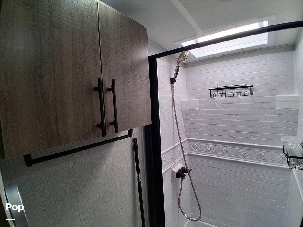 The centrally located bathroom provides a roomy and functional space with residential touches, including a large walk-in shower with skylight, vanity with sink and mirrored medicine cabinet, foot-flush toilet, and linen storage for towels and essentials