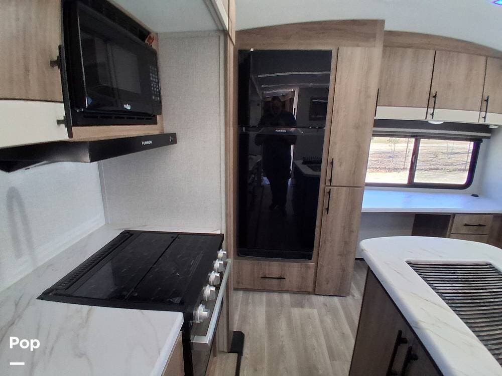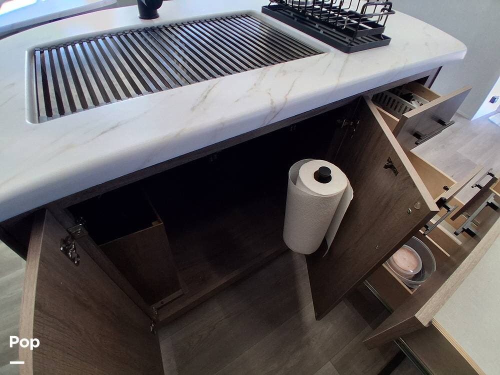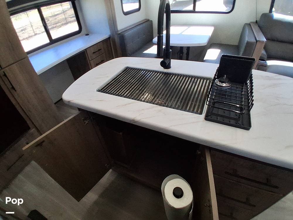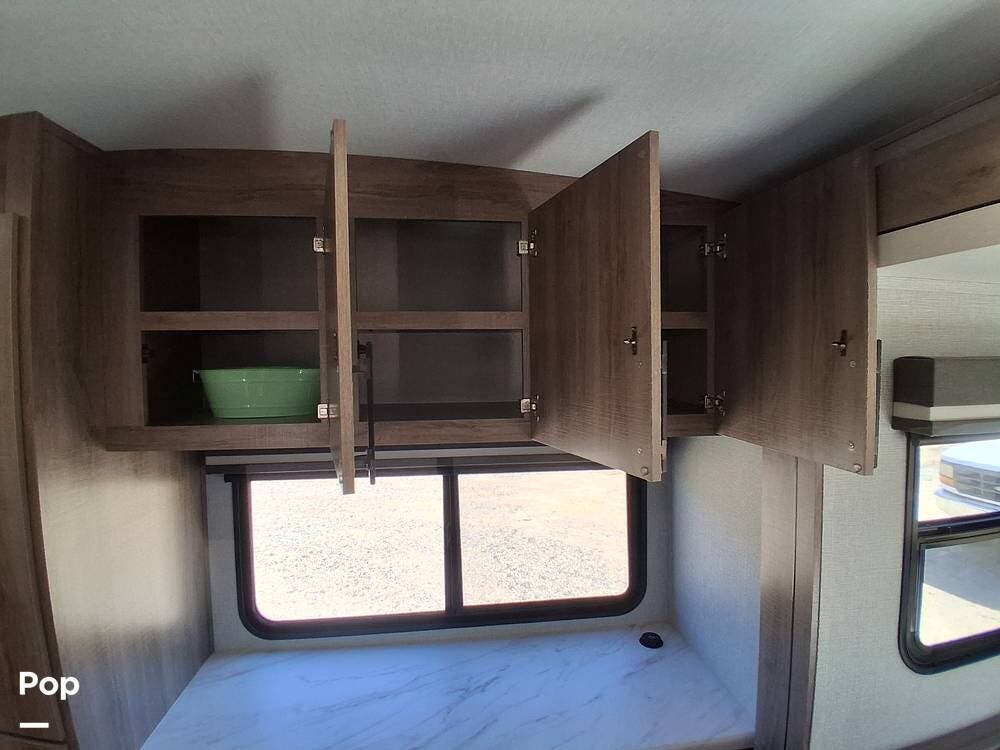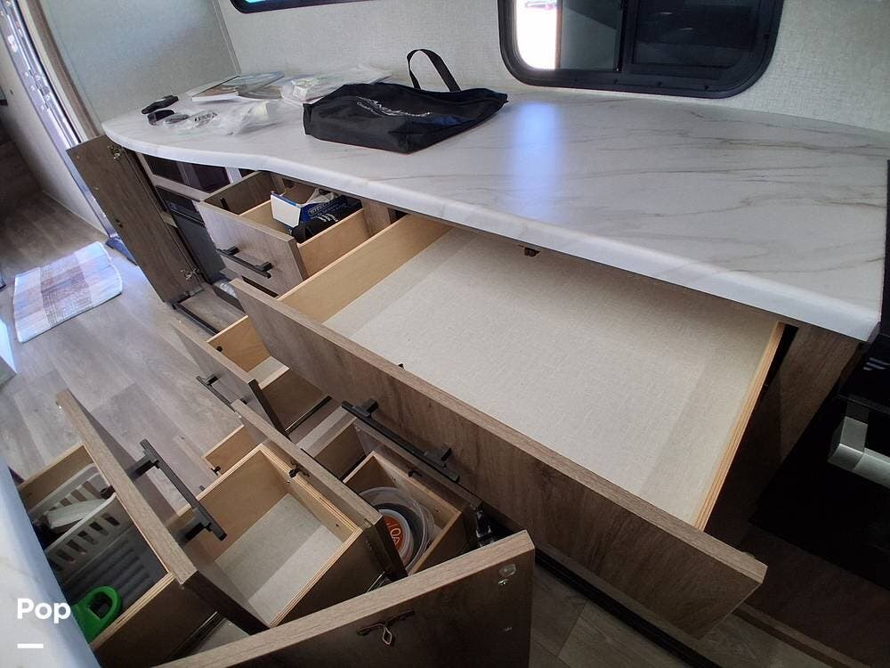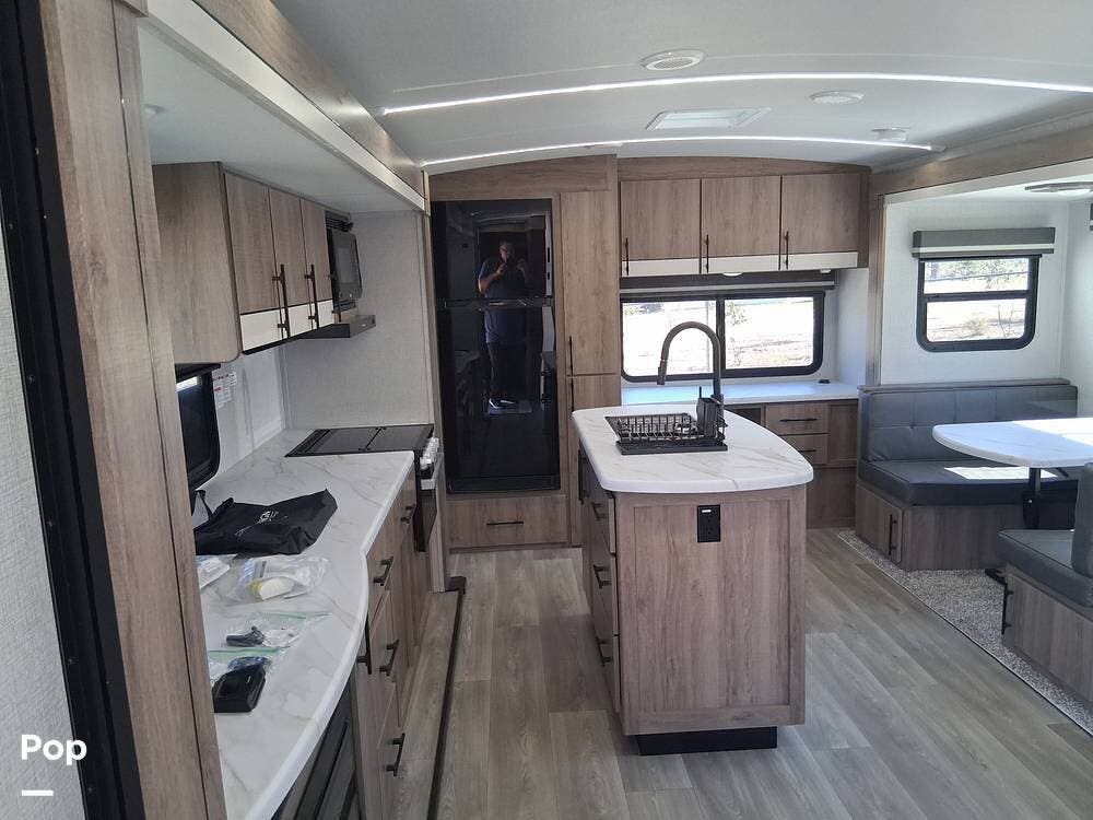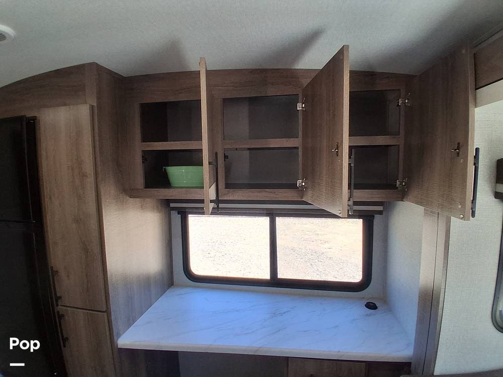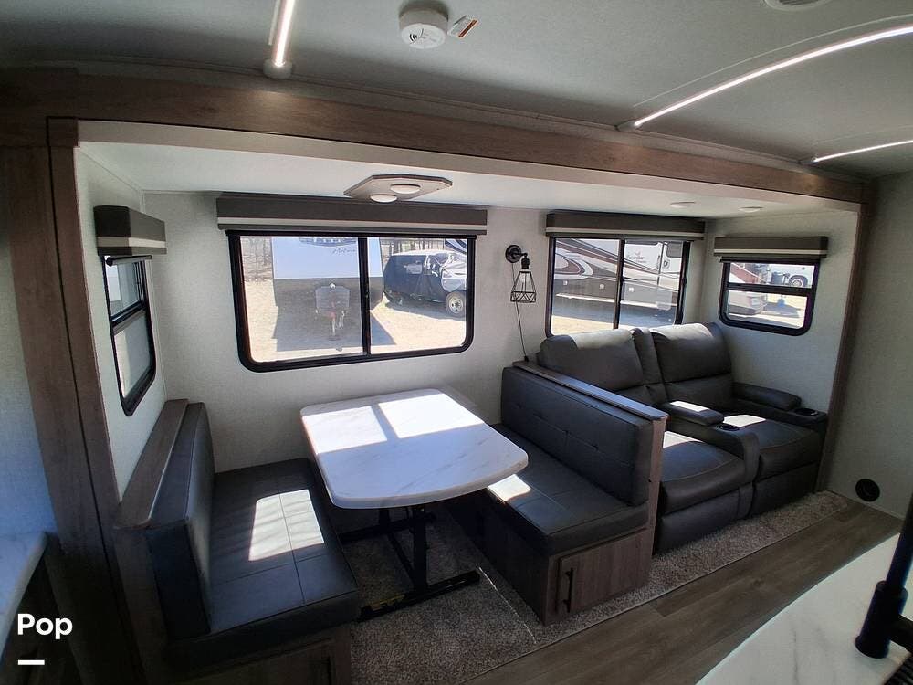 Across from the kitchen sits the versatile booth dinette, perfect for meals, work, or game nights. It converts to an additional sleeping area if needed and offers a great spot for remote work or planning your next adventure