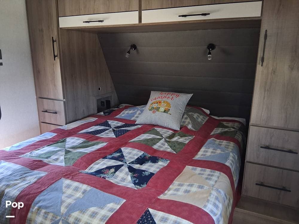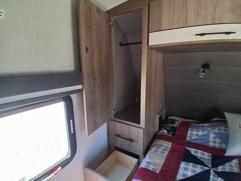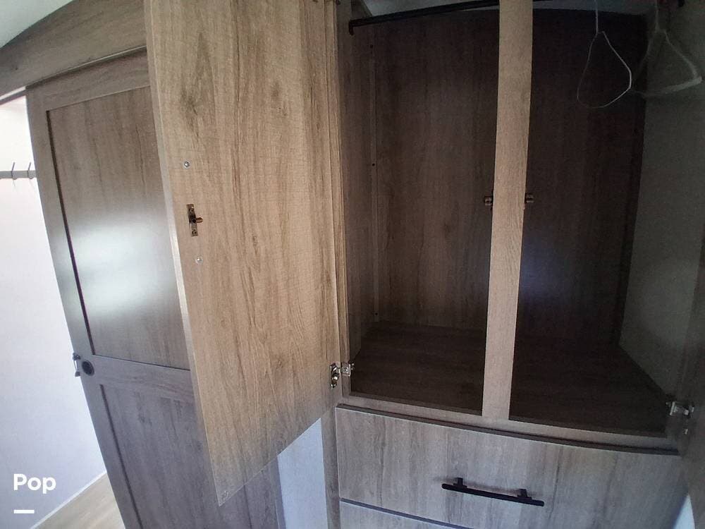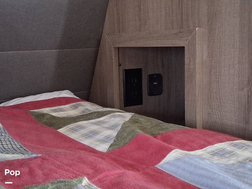 At the front of the trailer, the private bedroom offers a quiet retreat after a day of exploring and features a comfortable queen-size bed with under-bed storage, dual wardrobes and overhead cabinets, nightstands with outlets and USB ports, and a sliding door for privacy