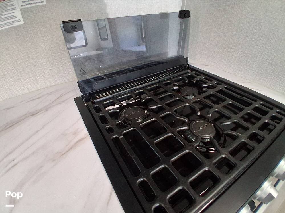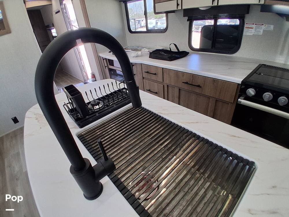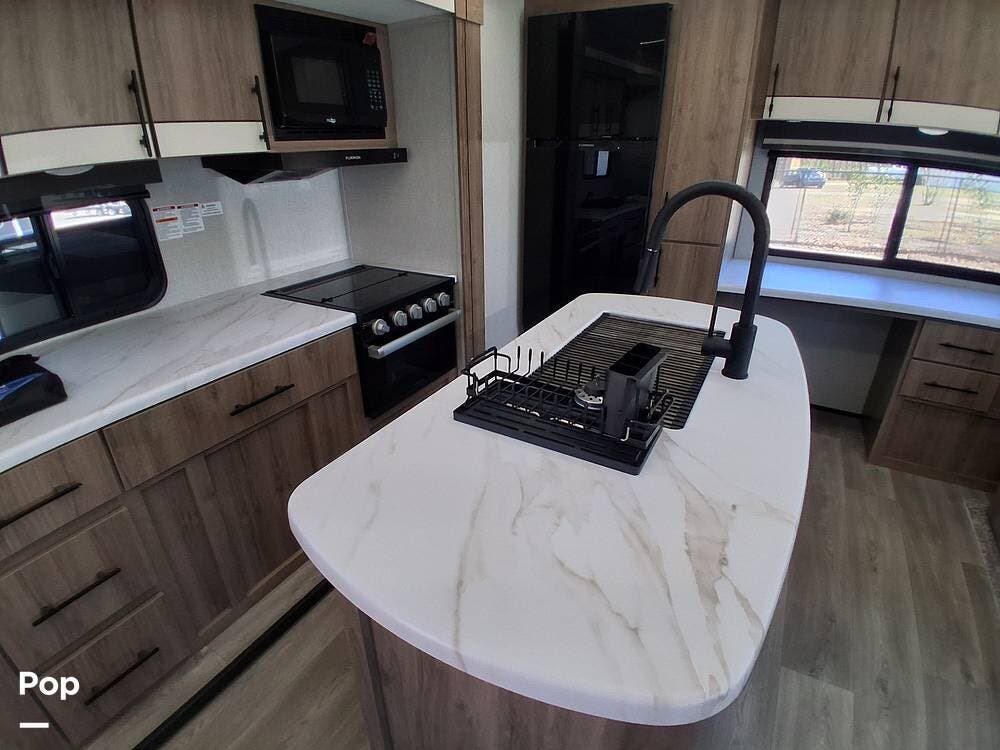One of the highlights of the 2670MK is its spacious rear kitchen, offering more prep space and storage than most travel trailers in its class. Featuring a large countertop area with a residential-style finish, a deep stainless-steel sink with a high-rise faucet, a three-burner cooktop with oven and microwave, and a large RV refrigerator, the layout makes cooking on the road easy and enjoyable.