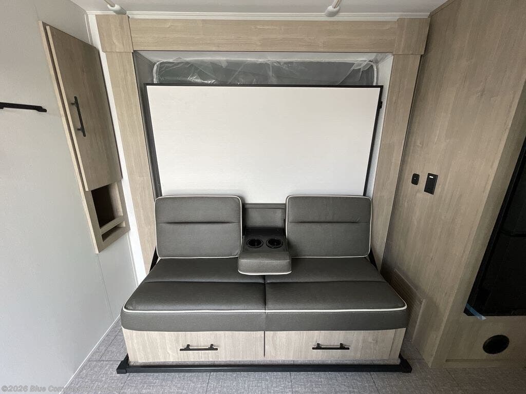 This simple, but cozy travel trailer is sure to meet all of your camping needs. There is a full rear bath with a shower skylight and wardrobe to keep your things tidy. The front kitchen includes ample counter space to prep meals and a bar tabletop dinette with three stools you are sure to love. A two burner cooktop also comes standard, along with a convection microwave, and an exterior griddle for when you want to cook outdoors under the 12' awning! The versatile Murphy bed provides seating and sleeping space each day, and the hi-definition LED TV across from the bed will let you watch movies at night.