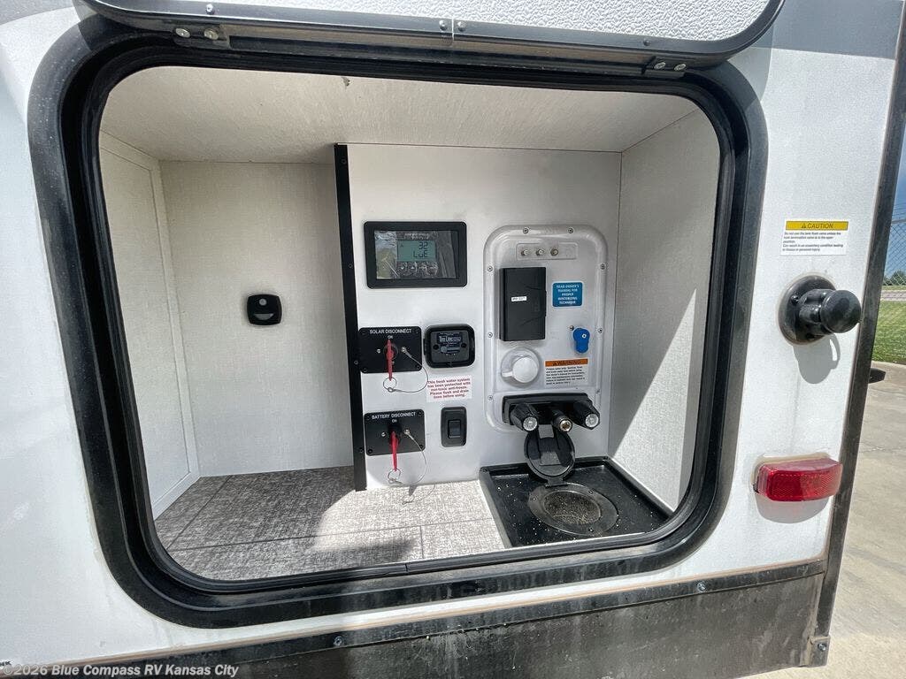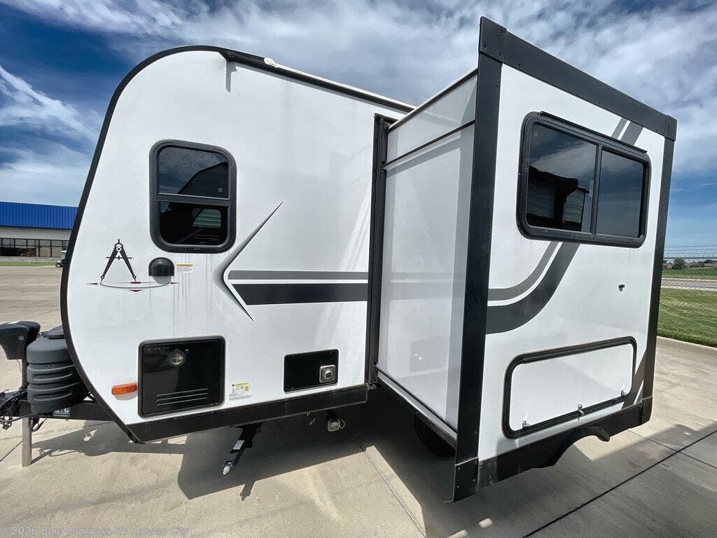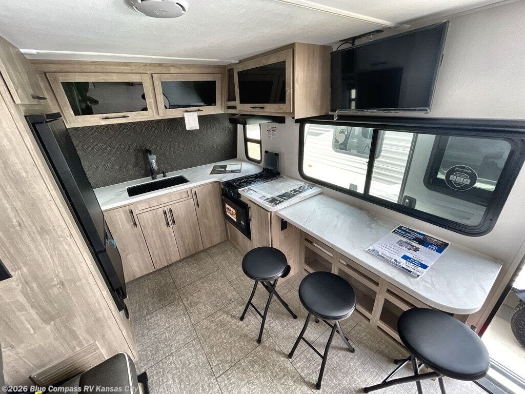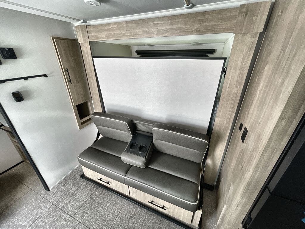 This simple, but cozy travel trailer is sure to meet all of your camping needs. There is a full rear bath with a shower skylight and wardrobe to keep your things tidy. The front kitchen includes ample counter space to prep meals and a bar tabletop dinette with three stools you are sure to love. A two burner cooktop also comes standard, along with a convection microwave, and an exterior griddle for when you want to cook outdoors under the 12' awning! The versatile Murphy bed provides seating and sleeping space each day, and the hi-definition LED TV across from the bed will let you watch movies at night.