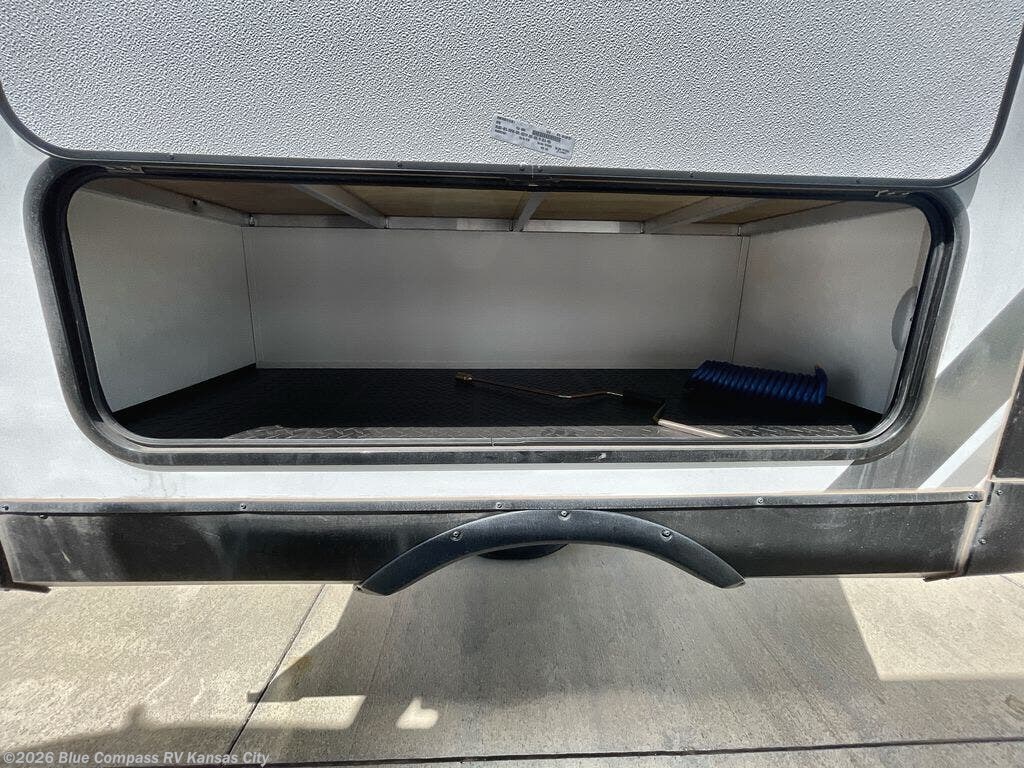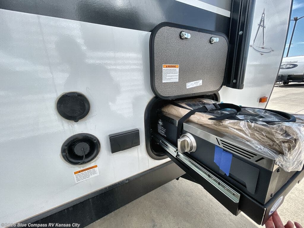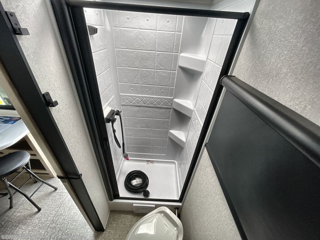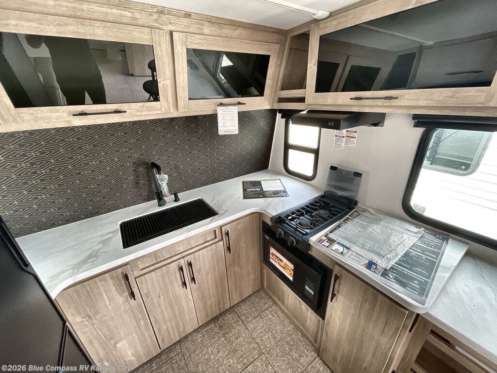 This simple, but cozy travel trailer is sure to meet all of your camping needs. There is a full rear bath with a shower skylight and wardrobe to keep your things tidy. The front kitchen includes ample counter space to prep meals and a bar tabletop dinette with three stools you are sure to love. A two burner cooktop also comes standard, along with a convection microwave, and an exterior griddle for when you want to cook outdoors under the 12' awning! The versatile Murphy bed provides seating and sleeping space each day, and the hi-definition LED TV across from the bed will let you watch movies at night.