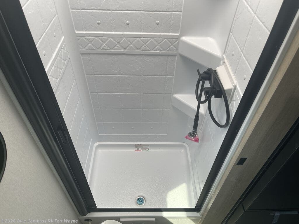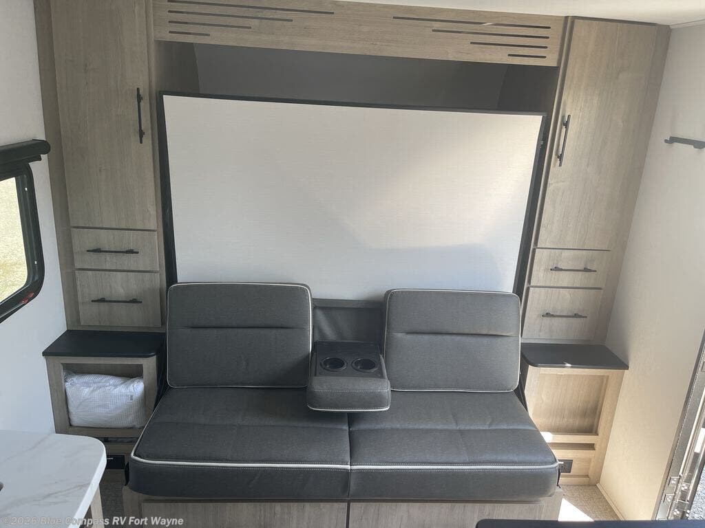 Start looking for your favorite campground to take this travel trailer to! After a fun day at the beach, you can rinse the sand out of your hair with the walk-in shower with a skylight in the full rear bathroom. Depending on what time you enter the unit will determine whether you see the Murphy bed or sofa with drawers underneath and wardrobes on either side of it. The booth dinette is not only great for enjoying meals prepared with the two burner cooktop or outside griddle, but also for transforming into an extra sleeping space!