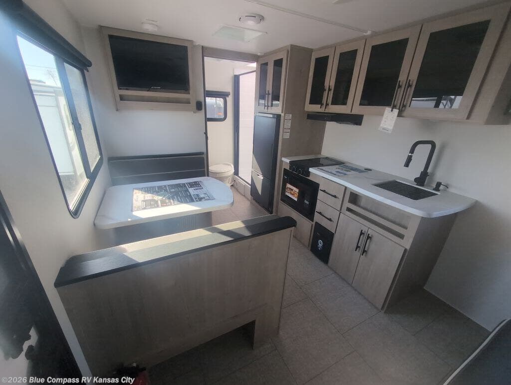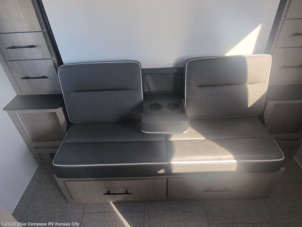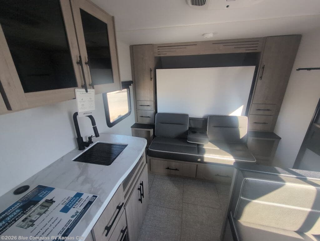 Start looking for your favorite campground to take this travel trailer to! After a fun day at the beach, you can rinse the sand out of your hair with the walk-in shower with a skylight in the full rear bathroom. Depending on what time you enter the unit will determine whether you see the Murphy bed or sofa with drawers underneath and wardrobes on either side of it. The booth dinette is not only great for enjoying meals prepared with the two burner cooktop or outside griddle, but also for transforming into an extra sleeping space!