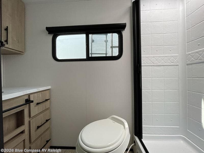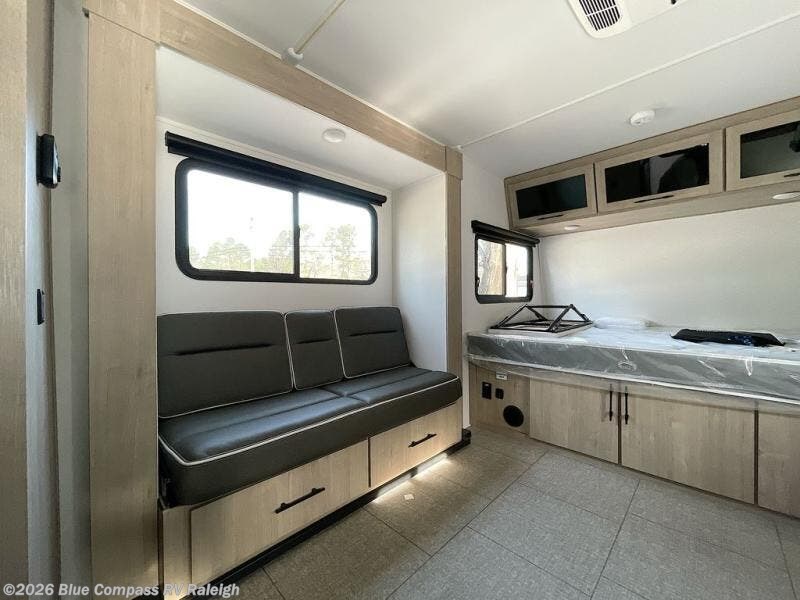 Pack your bags and head out on a fun camping trip in this travel trailer! The front queen bed offers a comfortable place to sleep at night, as well as the roll-over sleeper sofa slide with drawers for storage. You can hang your jacket up on one of the coat hooks when you enter, and then start preparing a delicious meal on the two burner cooktop. You even have an outside griddle to fry up the catch of the day. The full rear bathroom has a walk-in shower with skylight to freshen up in and overhead cabinets for your toiletries!