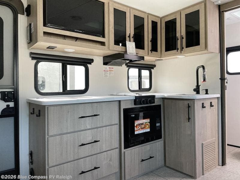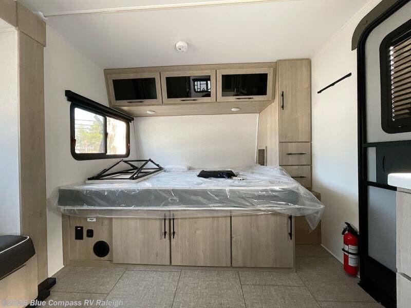 Pack your bags and head out on a fun camping trip in this travel trailer! The front queen bed offers a comfortable place to sleep at night, as well as the roll-over sleeper sofa slide with drawers for storage. You can hang your jacket up on one of the coat hooks when you enter, and then start preparing a delicious meal on the two burner cooktop. You even have an outside griddle to fry up the catch of the day. The full rear bathroom has a walk-in shower with skylight to freshen up in and overhead cabinets for your toiletries!