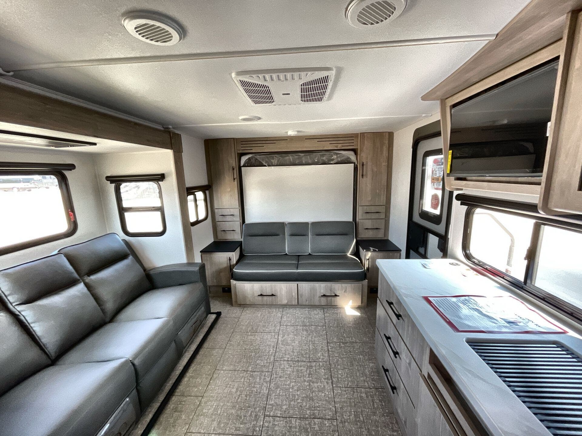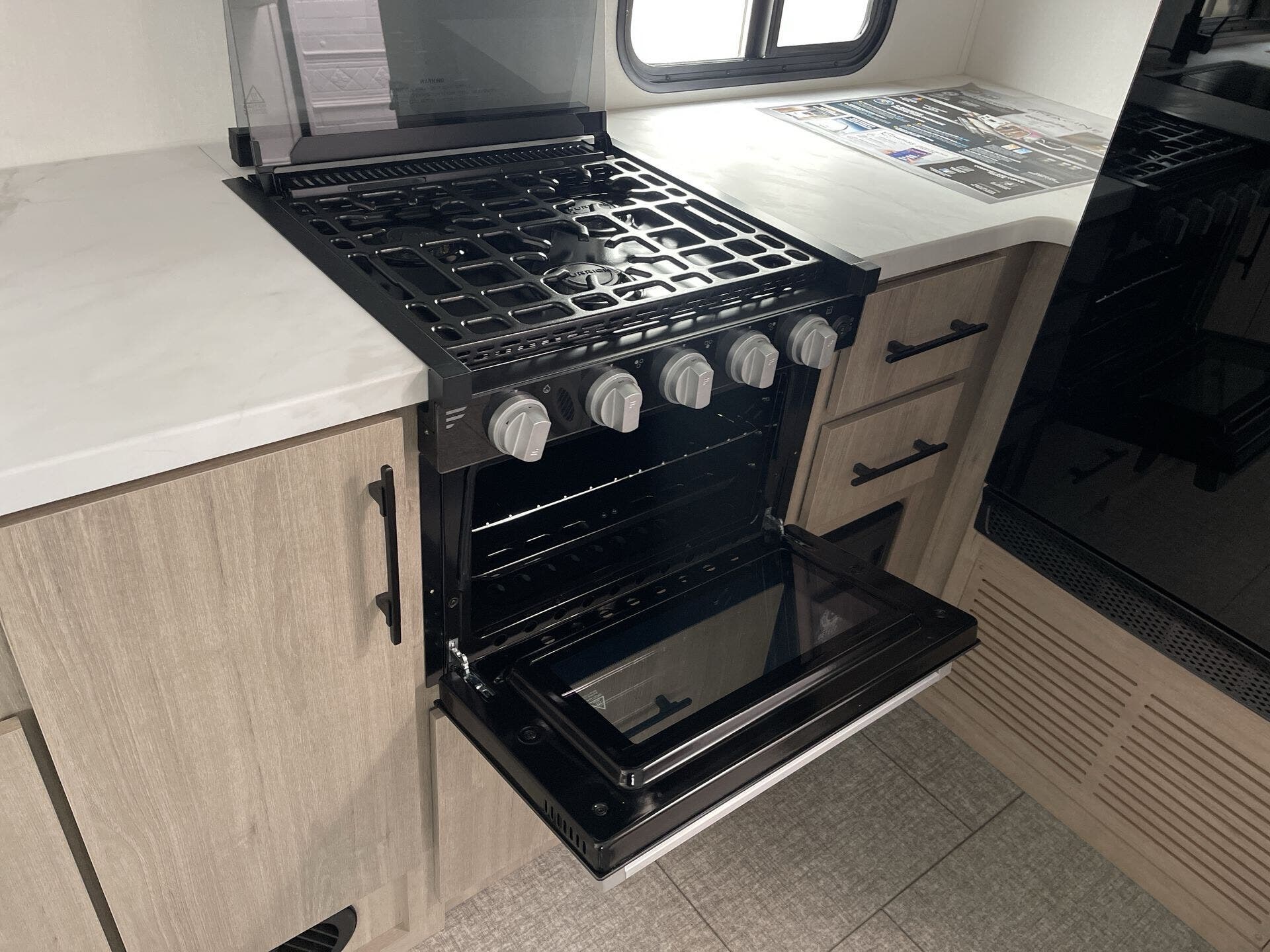 This travel trailer boasts a comprehensive list of features to enhance your camping experience. Inside, you'll find a modern kitchen equipped with a microwave, oven, refrigerator, and stove top burner—ideal for preparing delicious home-cooked meals on the road. Additional amenities include: