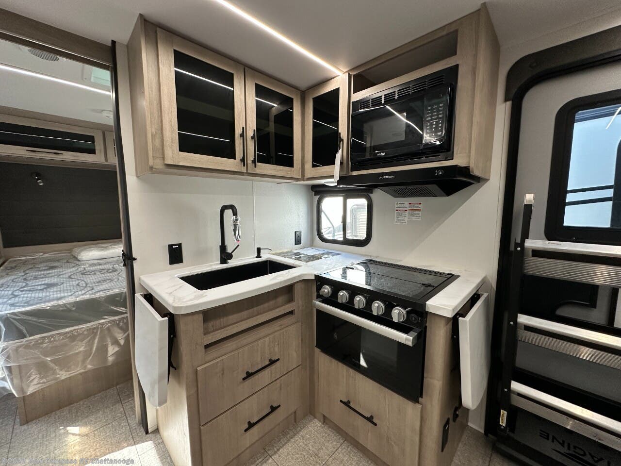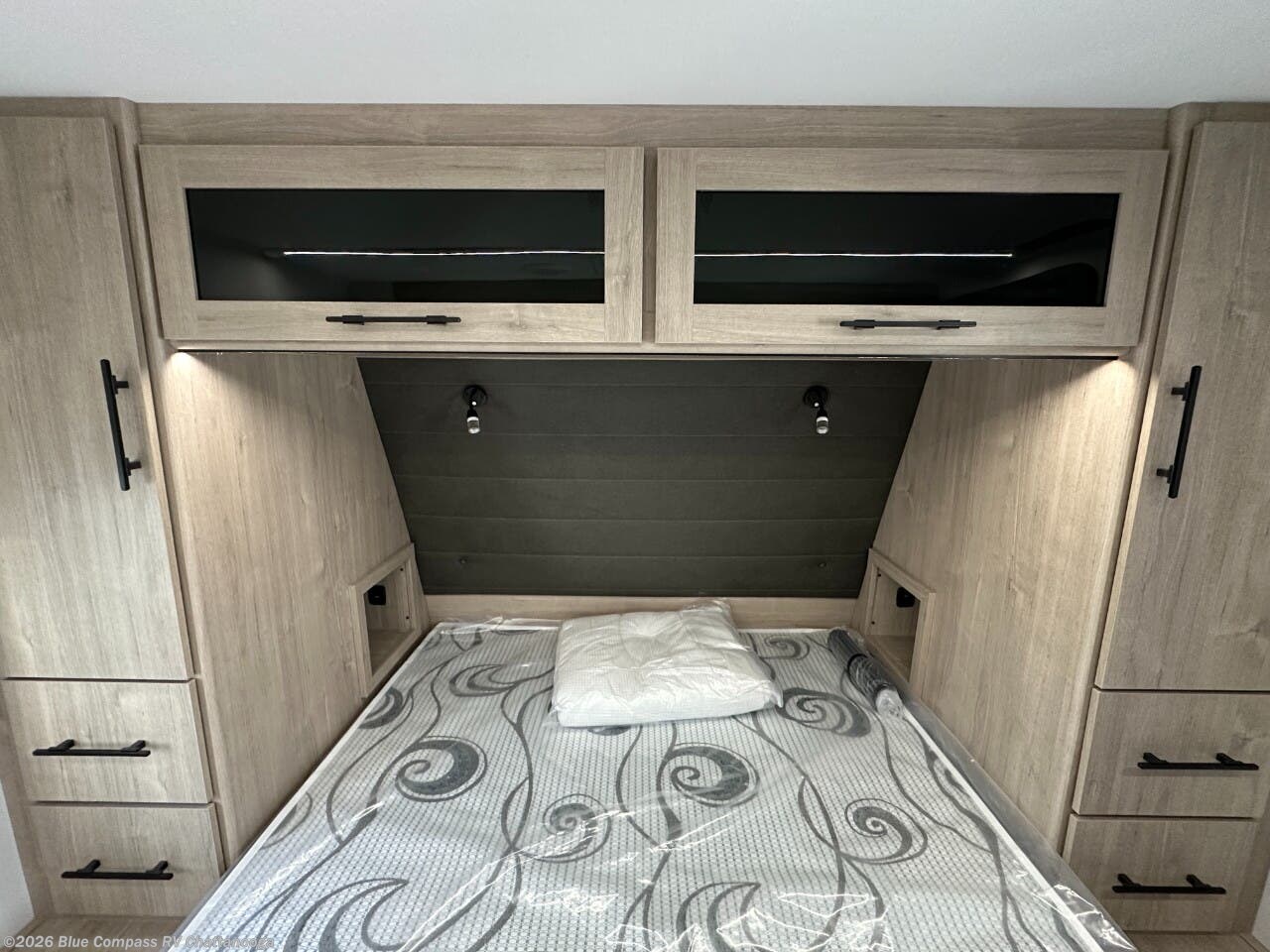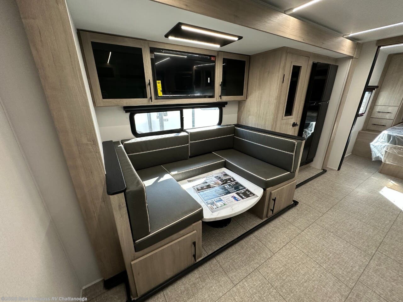 The dual entry doors make it easy to enter and exit this travel trailer! You will find a walk-around queen-size bed up front in the private bedroom, and one of the entry/exit doors to the unit so you can quietly slip out for an early morning fishing trip. The U-shaped dinette is right next to the window, so you can look out at your surroundings while you enjoy breakfast. The double-size bunks have some privacy curtains, and the bunks are right next to the full bathroom for easy access in the middle of the night. The fully equipped kitchen has everything you need to get dinner in the oven, and you can have some more prep space by using the flip-up countertop extension. You even have an outdoor griddle and an outdoor 1.6 cu. ft. refrigerator to enjoy a cold beverage while you cook under the 22' electric awning!