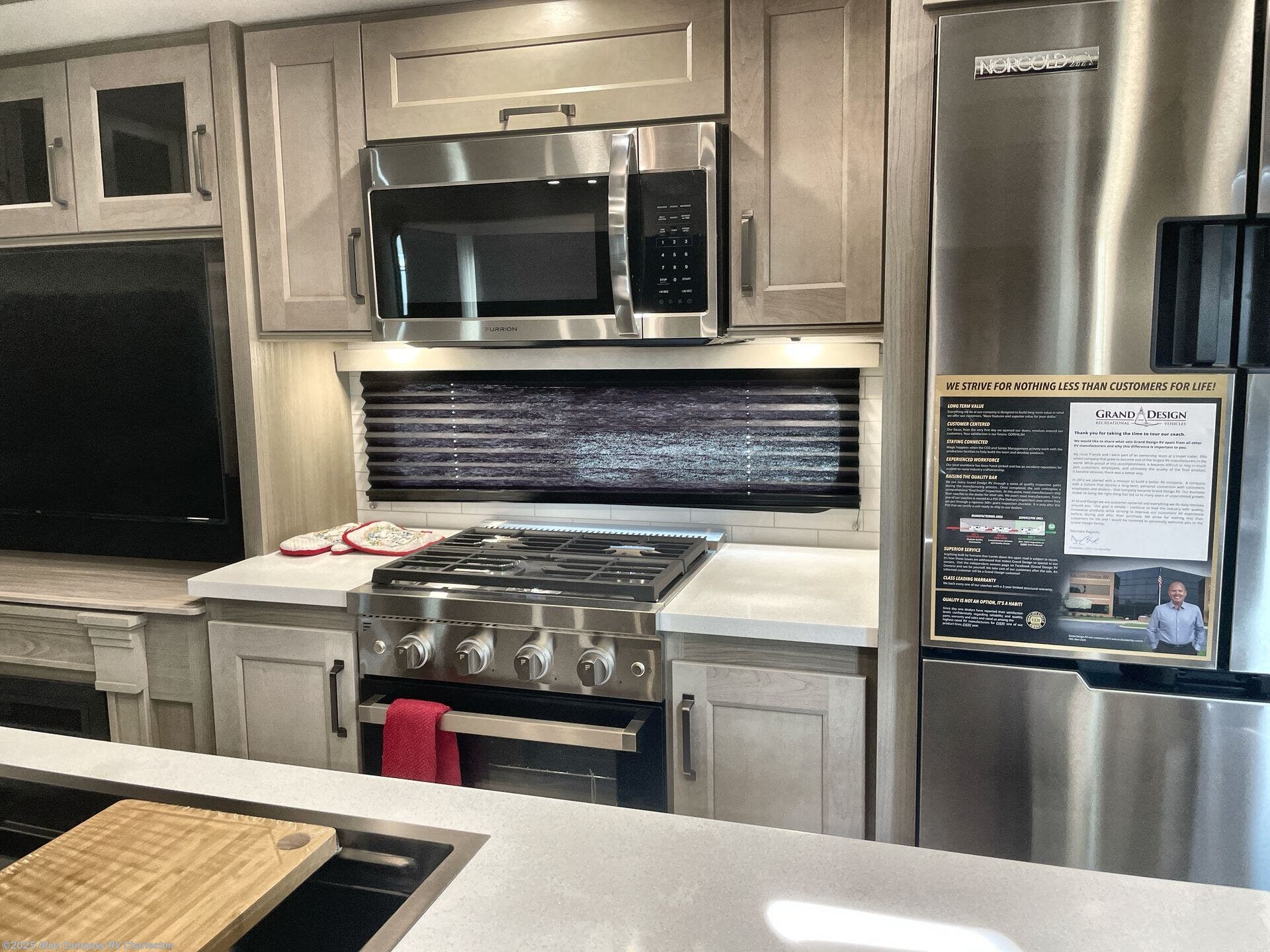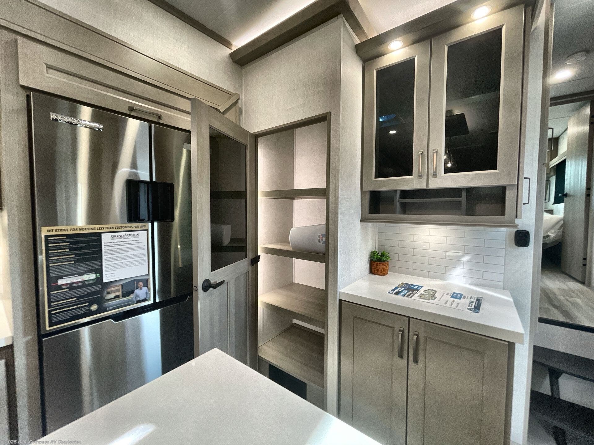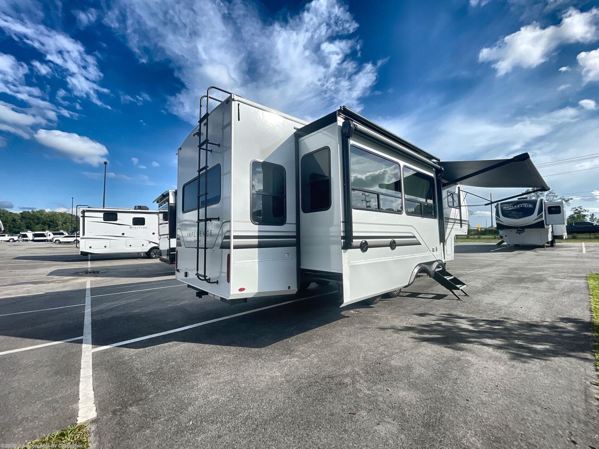 Any Grand Design Influence fifth wheel features five-sided aluminum cage construction with a walk-on roof and a fully enclosed underbelly with heated tanks and storage for all weather camping. For peace of mind, the MORryde CRE3000 Suspension system will provide safe and smooth towing, and the 101" widebody construction offers all the room you need and that is before multiple slides are fully engaged. You will appreciate the Keyed-Alike locks, slam-latch baggage doors with magnetic door catches, exterior security light, and SolidStep entry steps. On the inside, Congoleum flooring, premium roller shades for privacy, a hallway handrail for safety, and nightstands with USB ports to keep all of your electronics fully charged. You will also love the on demand tankless water heater when showering, plus the added heat and ambiance from an electric fireplace, and so much more!