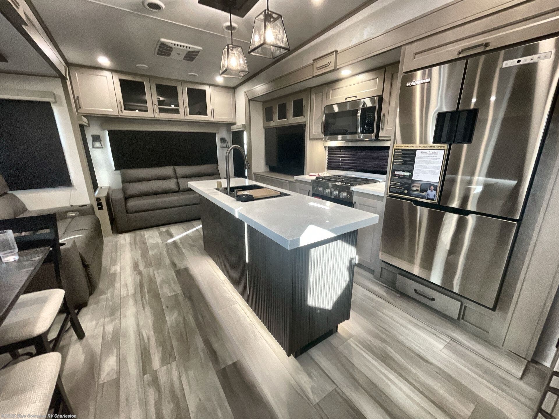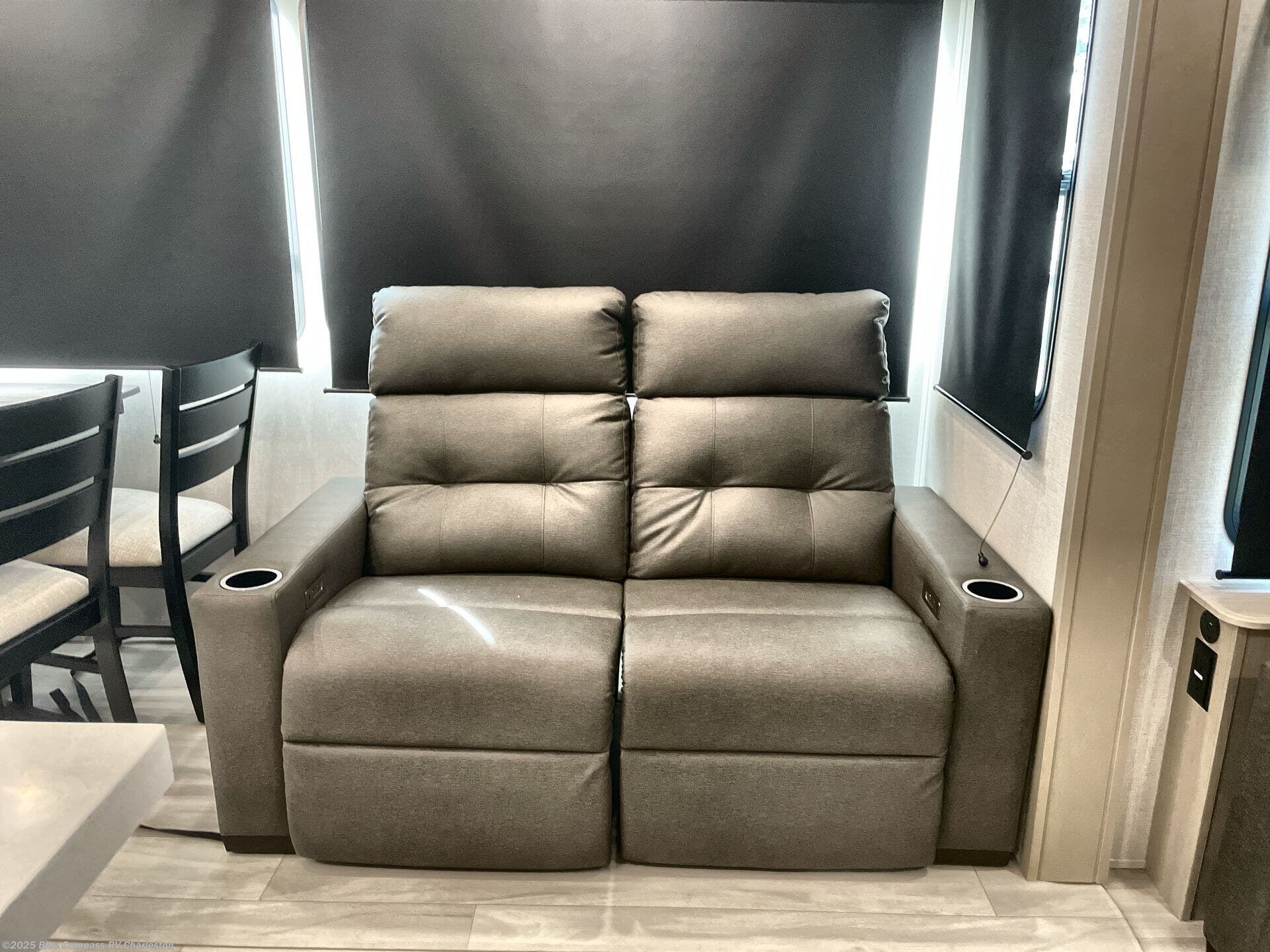 You'll feel right at home in this spacious fifth wheel with triple slides, a front master bedroom, and a kitchen island with extra counter space. The theatre seating is right across from the entertainment center which includes a 40" TV and fireplace, and there is a rear tri-fold sofa if you have any guests staying over. This model includes a hutch in the kitchen with cabinets above to store you nice dishes, plus there is a large pantry with washer and dryer prep if you plan to go full-time. Head to the dual entry bath that includes a linen closet and a spacious shower, and check out the front master bedroom with its queen bed, and slide out wardrobe. You can choose the optional king bed if you enjoy a bit more room in bed!