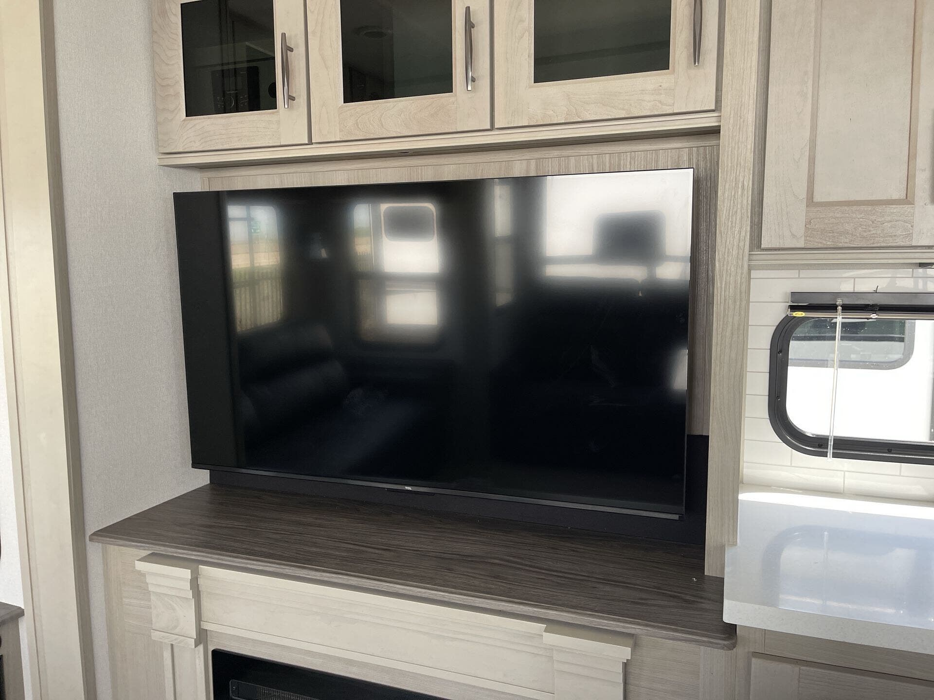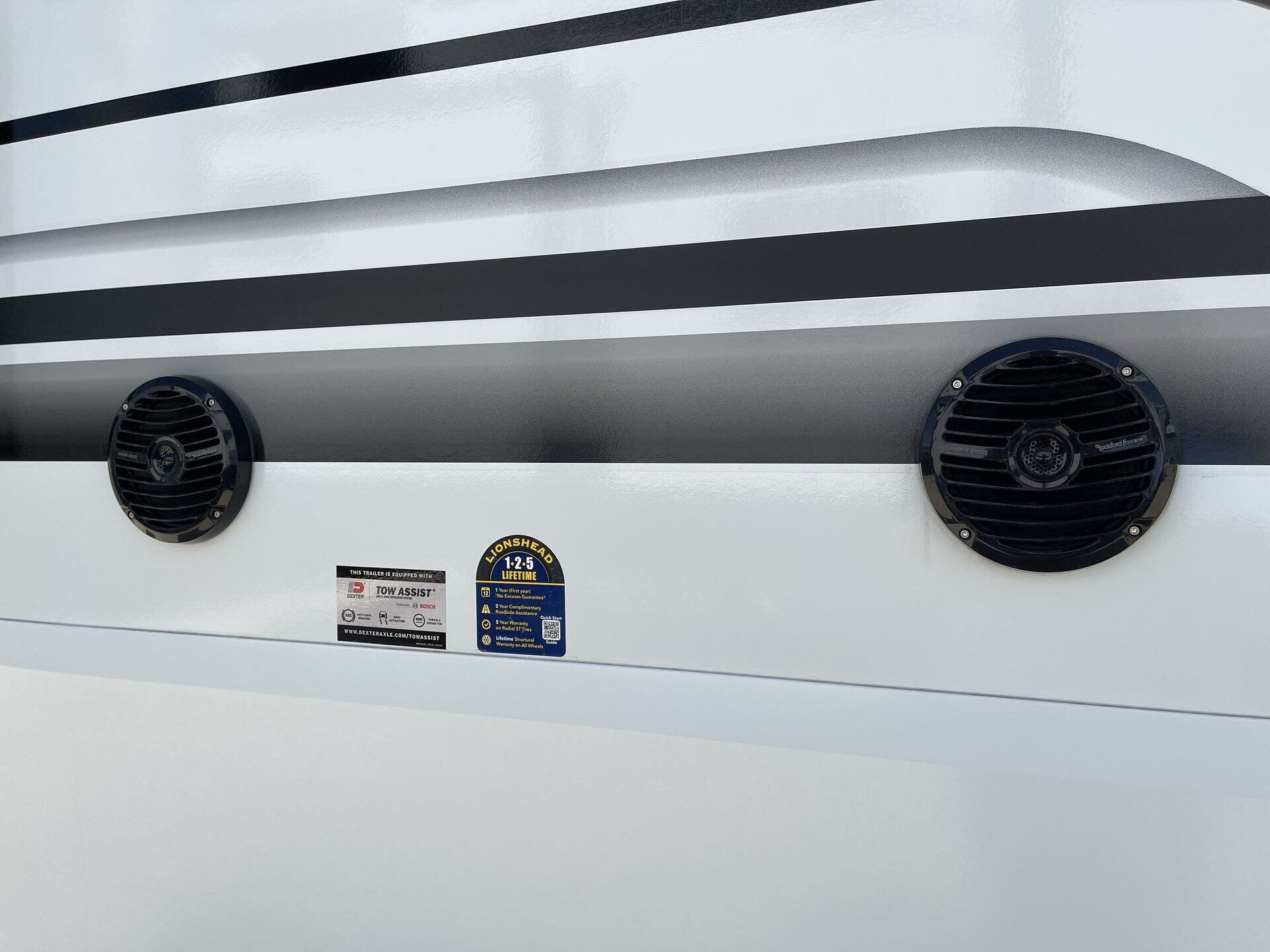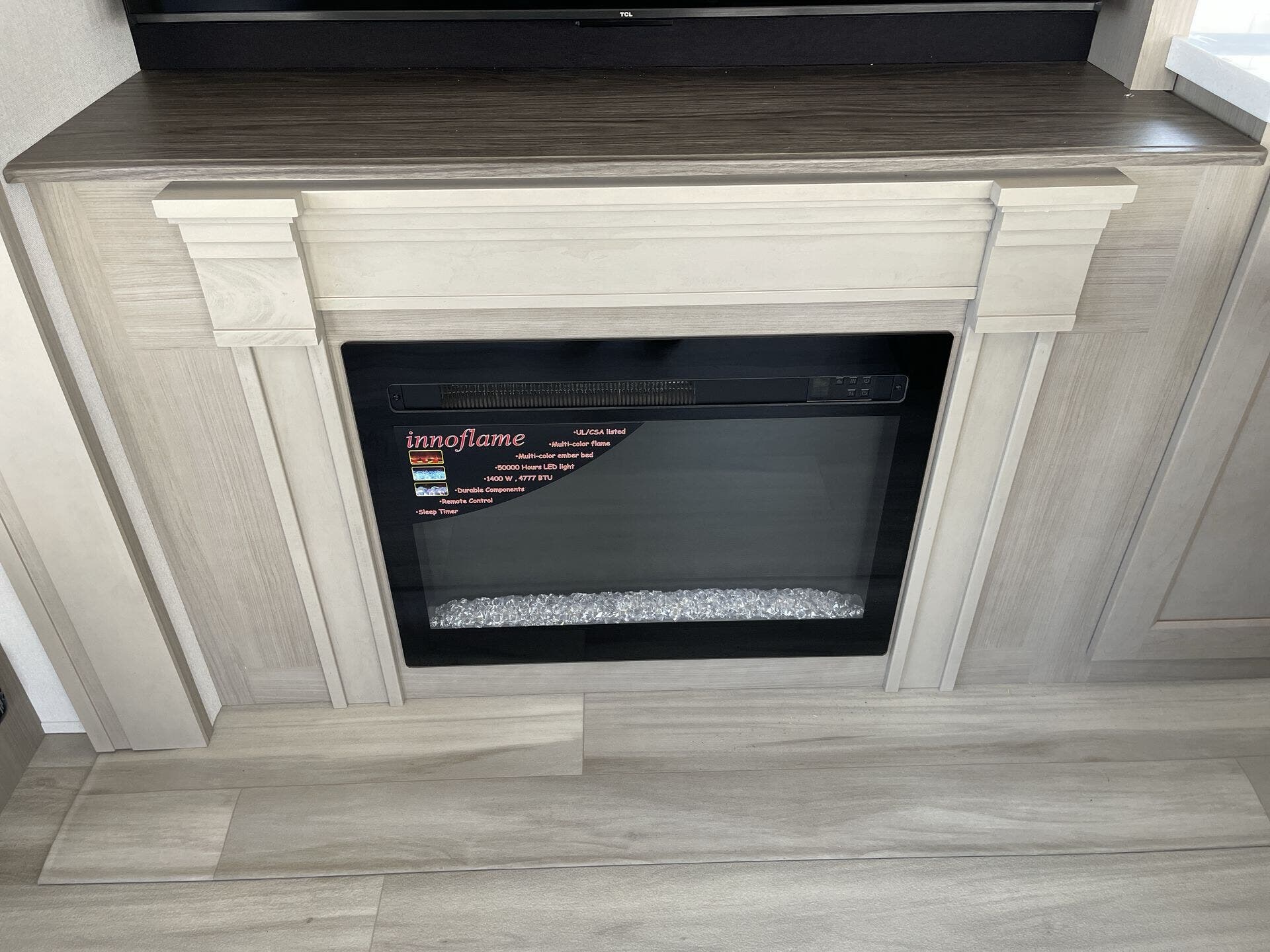 This RV is packed with modern amenities that enhance your camping experience. Stay cool during hot summer days with the efficient 15,000 BTU air conditioning unit, or enjoy a cozy evening with a built-in fireplace. Additional features like an exterior awning, exterior speakers for your favorite tunes, and an external shower for rinsing off after outdoor activities, make every moment enjoyable.